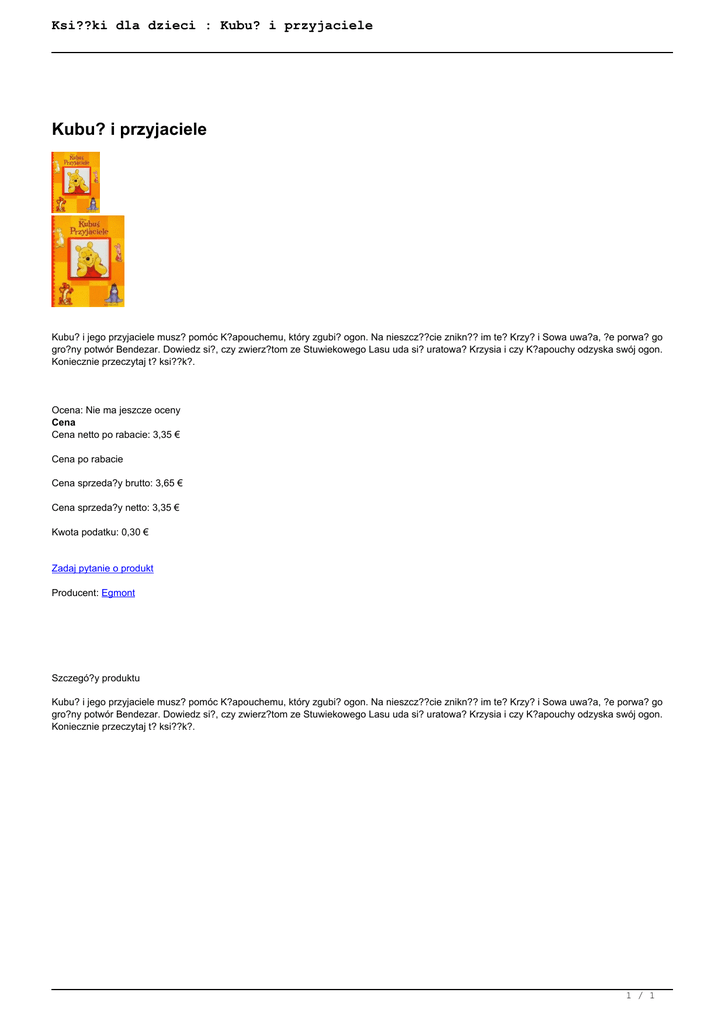 Ksi??ki dla dzieci : Kubu? i przyjaciele Kubu? i przyjaciele Kubu? i jego przyjaciele musz? pomóc K?apouchemu, który zgubi? ogon. Na nieszcz??cie znikn?? im te? Krzy? i Sowa uwa?a, ?e porwa? go gro?ny potwór Bendezar. Dowiedz si?, czy zwierz?tom ze Stuwiekowego Lasu uda si? uratowa? Krzysia i czy K?apouchy odzyska swój ogon. Koniecznie przeczytaj t? ksi??k?. Ocena: Nie ma jeszcze oceny Cena Cena netto po rabacie: 3,35 € Cena po rabacie Cena sprzeda?y brutto: 3,65 € Cena sprzeda?y netto: 3,35 € Kwota podatku: 0,30 € Zadaj pytanie o produkt Producent: Egmont Szczegó?y produktu Kubu? i jego przyjaciele musz? pomóc K?apouchemu, który zgubi? ogon. Na nieszcz??cie znikn?? im te? Krzy? i Sowa uwa?a, ?e porwa? go gro?ny potwór Bendezar. Dowiedz si?, czy zwierz?tom ze Stuwiekowego Lasu uda si? uratowa? Krzysia i czy K?apouchy odzyska swój ogon. Koniecznie przeczytaj t? ksi??k?. 1 / 1 Powered by TCPDF (www.tcpdf.org)