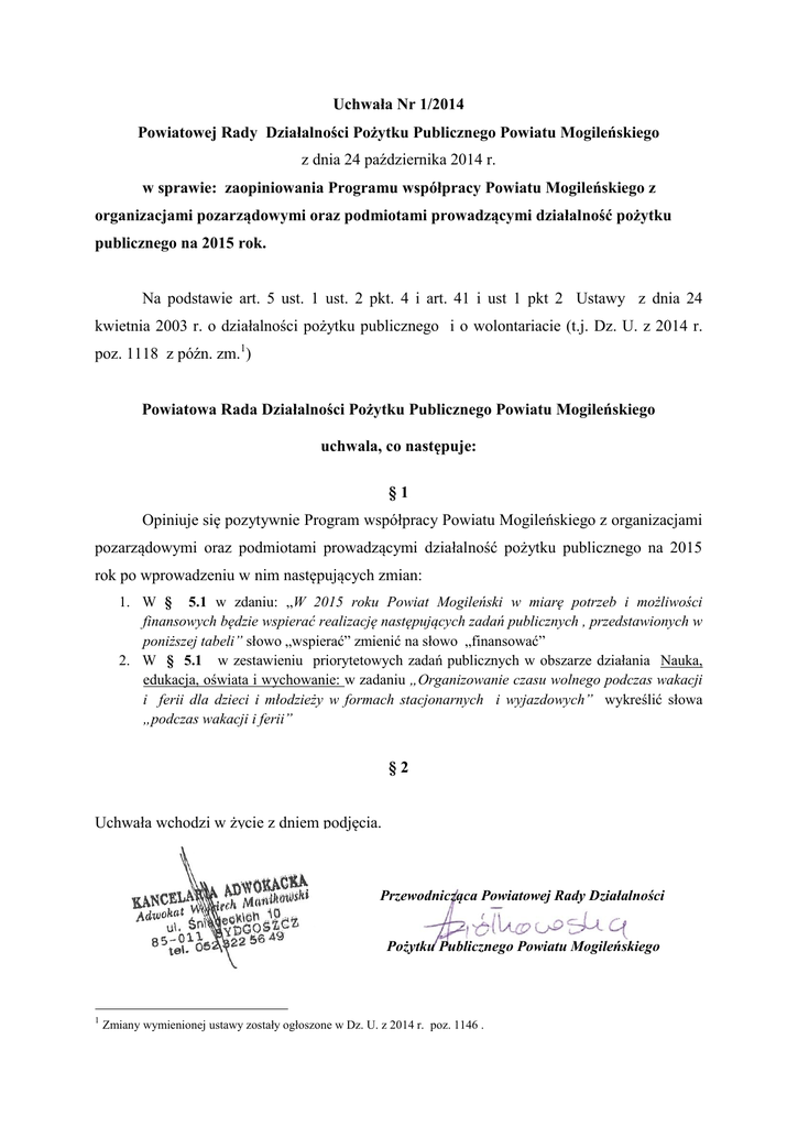 Uchwała Nr 1/2014 Powiatowej Rady Działalności Pożytku Publicznego Powiatu Mogileńskiego z dnia 24 października 2014 r. w sprawie: zaopiniowania Programu współpracy Powiatu Mogileńskiego z organizacjami pozarządowymi oraz podmiotami prowadzącymi działalność pożytku publicznego na 2015 rok. Na podstawie art. 5 ust. 1 ust. 2 pkt. 4 i art. 41 i ust 1 pkt 2 Ustawy z dnia 24 kwietnia 2003 r. o działalności pożytku publicznego i o wolontariacie (t.j. Dz. U. z 2014 r. poz. 1118 z późn. zm.1) Powiatowa Rada Działalności Pożytku Publicznego Powiatu Mogileńskiego uchwala, co następuje: §1 Opiniuje się pozytywnie Program współpracy Powiatu Mogileńskiego z organizacjami pozarządowymi oraz podmiotami prowadzącymi działalność pożytku publicznego na 2015 rok po wprowadzeniu w nim następujących zmian: 1. W § 5.1 w zdaniu: „W 2015 roku Powiat Mogileński w miarę potrzeb i możliwości finansowych będzie wspierać realizację następujących zadań publicznych , przedstawionych w poniższej tabeli” słowo „wspierać” zmienić na słowo „finansować” 2. W § 5.1 w zestawieniu priorytetowych zadań publicznych w obszarze działania Nauka, edukacja, oświata i wychowanie: w zadaniu „Organizowanie czasu wolnego podczas wakacji i ferii dla dzieci i młodzieży w formach stacjonarnych i wyjazdowych” wykreślić słowa „podczas wakacji i ferii” §2 Uchwała wchodzi w życie z dniem podjęcia. Przewodnicząca Powiatowej Rady Działalności Pożytku Publicznego Powiatu Mogileńskiego 1 Zmiany wymienionej ustawy zostały ogłoszone w Dz. U. z 2014 r. poz. 1146 . Uzasadnienie do Uchwały Nr 1/2014 Powiatowej Rady Działalności Pożytku Publicznego Powiatu Mogileńskiego z dnia 24 października 2014 r. w sprawie: zaopiniowania Programu współpracy Powiatu Mogileńskiego z organizacjami pozarządowymi oraz podmiotami prowadzącymi działalność pożytku publicznego na 2015 rok Samorząd Powiatowy na podstawie artykuły 5 ust. 1 i ust 2 pkt. 4 Ustawy z dnia 24 kwietnia 2003 r. o działalności pożytku publicznego i o wolontariacie (Dz. U. z 2014 r. poz. 1118 ) musi konsultować projekty aktów normatywnych dotyczących sfery zadań publicznych wynikających z art. 4 ww. ustawy z Powiatową Radą Działalności Pożytku Publicznego. Ponadto art. 41 i ust 1 pkt 2 Ustawy z dnia 24 kwietnia 2003 r. o działalności pożytku publicznego i o wolontariacie (Dz. U. z 2014 r. poz. 1118 ) wskazuje, że do zadań Powiatowej Rady Działalności Pożytku Publicznego należy w szczególności opiniowanie programów współpracy z organizacjami pozarządowymi oraz podmiotami wymienionymi w art. 3 ust. 3 ww. ustawy. W związku z powyższym podjęciem uchwały jest uzasadnione. Przewodnicząca Powiatowej Rady Działalności Pożytku Publicznego Powiatu Mogileńskiego
