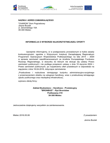 NAZWA I ADRES ZAMAWIAJĄCEGO "CHARON" Dom Pogrzebowy Janina Buziak ul. Żeromskiego 15A 39-300 Mielec INFORMACJA O WYBORZE NAJKORZYSTNIEJSZEJ OFERTY Uprzejmie informujemy, iż w postępowaniu prowadzonym w trybie zasady konkurencyjności, zgodnie z Wytycznymi Instytucji Zarządzającej Regionalnym Programem Operacyjnym Województwa Podkarpackiego na lata 2014 – 2020 w sprawie zamówień współfinansowanych ze środków Europejskiego Funduszu Rozwoju Regionalnego, w stosunku do których nie stosuje się ustawy Prawo zamówień publicznych i nie podlega przepisom ustawy z dnia 19 stycznia 2004 r. Prawo zamówień publicznych, po rozpatrzeniu ofert przesłanych w odpowiedzi na zapytanie z dnia 18-04-2016, dotyczące zamówienia: „Przebudowa i rozbudowa istniejącego budynku administracyjno-socjalnego z przeznaczeniem obiektu na usługowo handlowy, wraz z przebudową istniejącego zjazdu publicznego oraz niezbędną infrastrukturą”, wybrano ofertę firmy: Zakład Budowlano – Handlowo - Produkcyjny "BRONBUD" - Ryś Bronisław Podleszany 310 39-300 Mielec Jednocześnie dziękujemy wszystkim za zainteresowanie. Mielec 2016.05.06 Z poważaniem Janina Buziak