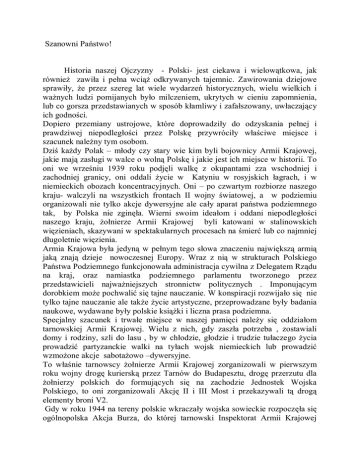 Szanowni Państwo! Historia naszej Ojczyzny - Polski- jest ciekawa i wielowątkowa, jak również zawiła i pełna wciąż odkrywanych tajemnic. Zawirowania dziejowe sprawiły, że przez szereg lat wiele wydarzeń historycznych, wielu wielkich i ważnych ludzi pomijanych było milczeniem, ukrytych w cieniu zapomnienia, lub co gorsza przedstawianych w sposób kłamliwy i zafałszowany, uwłaczający ich godności. Dopiero przemiany ustrojowe, które doprowadziły do odzyskania pełnej i prawdziwej niepodległości przez Polskę przywróciły właściwe miejsce i szacunek należny tym osobom. Dziś każdy Polak – młody czy stary wie kim byli bojownicy Armii Krajowej, jakie mają zasługi w walce o wolną Polskę i jakie jest ich miejsce w historii. To oni we wrześniu 1939 roku podjęli walkę z okupantami zza wschodniej i zachodniej granicy, oni oddali życie w Katyniu w rosyjskich łagrach, i w niemieckich obozach koncentracyjnych. Oni – po czwartym rozbiorze naszego kraju- walczyli na wszystkich frontach II wojny światowej, a w podziemiu organizowali nie tylko akcje dywersyjne ale cały aparat państwa podziemnego tak, by Polska nie zginęła. Wierni swoim ideałom i oddani niepodległości naszego kraju, żołnierze Armii Krajowej byli katowani w stalinowskich więzieniach, skazywani w spektakularnych procesach na śmierć lub co najmniej długoletnie więzienia. Armia Krajowa była jedyną w pełnym tego słowa znaczeniu największą armią jaką znają dzieje nowoczesnej Europy. Wraz z nią w strukturach Polskiego Państwa Podziemnego funkcjonowała administracja cywilna z Delegatem Rządu na kraj, oraz namiastka podziemnego parlamentu tworzonego przez przedstawicieli najważniejszych stronnictw politycznych . Imponującym dorobkiem może pochwalić się tajne nauczanie. W konspiracji rozwijało się nie tylko tajne nauczanie ale także życie artystyczne, przeprowadzane były badania naukowe, wydawane były polskie książki i liczna prasa podziemna. Specjalny szacunek i trwałe miejsce w naszej pamięci należy się oddziałom tarnowskiej Armii Krajowej. Wielu z nich, gdy zaszła potrzeba , zostawiali domy i rodziny, szli do lasu , by w chłodzie, głodzie i trudzie tułaczego życia prowadzić partyzanckie walki na tyłach wojsk niemieckich lub prowadzić wzmożone akcje sabotażowo –dywersyjne. To właśnie tarnowscy żołnierze Armii Krajowej zorganizowali w pierwszym roku wojny drogę kurierską przez Tarnów do Budapesztu, drogę przerzutu dla żołnierzy polskich do formujących się na zachodzie Jednostek Wojska Polskiego, to oni zorganizowali Akcję II i III Most i przekazywali tą drogą elementy broni V2. Gdy w roku 1944 na tereny polskie wkraczały wojska sowieckie rozpoczęła się ogólnopolska Akcja Burza, do której tarnowski Inspektorat Armii Krajowej przygotował trzy bataliony. Jeden z nich- Batalion Barbara- został całkowicie zmobilizowany i toczył ciągłe walki partyzanckie na terenach Pogórza Ciężkowicko – Rożnowskiego. Tarnowski szlak partyzancki to nie tylko sukcesy, ale też i liczne mogiły rozsiane na tym szlaku partyzanckim. Wszystko to nie byłoby możliwe, gdyby nie poświęcenie ludzi zaprzysiężonych w szeregach Armii Krajowej, którzy walczyli i ginęli bez nadziei aby historia przekazała o nich pamięć przyszłym pokoleniom, historia, która sama przez długie lata pisana była pamięcią. Dziś, gdy od obalenia komunizmu upłynęło już prawie dwadzieścia lat, pozostała ich garstka. Pamięć o nich zaciera się w codziennym zabieganiu i dążeniu do własnych celów. A przecież w dzisiejszych czasach gdy tak wiele mówi się o obawie przed utratą tożsamości narodowej, własnej historii, to żołnierze Armii Krajowej powinni być stawiani za przykład tych, co nigdy nie zapomnieli o swojej Ojczyźnie i jej dziedzictwie. Nadeszły czasy, gdy świat stanął dla wszystkich otworem. Zacierają się granice państw. Światowa komunikacja ułatwia kontakty z mieszkańcami odległych zakątków Ziemi. Czasy, w których patriotyzm i starania o jego krzewienie i podtrzymywanie stały się szczególnie cenną wartością. Dlatego też w naszej szkole – XVI Liceum Ogólnokształcącym w Tarnowie, za najwyższy cel stawiamy sobie pielęgnowanie pamięci historycznej i gruntowanie patriotyzmu, jako najwyższej wartości. Uczniowie naszej szkoły noszą na co dzień mundury wojskowe, by w ten sposób nawiązać do idei polskiej wojskowości. Czujemy się przez to spadkobiercami wielkiego etosu, etosu Armii Krajowej, spadkobiercami testamentu pokoleń. W związku z tym, zawsze było dla nas oczywistym, że gdy tylko podejmiemy starania o ustanowienie patrona szkoły, to wybór nasz padnie właśnie na Armię Krajową. Po wielu staraniach osiągnęliśmy sukces, gdyż zarówno sama organizacja jak i podmioty władne decydować o ustanowieniu patrona szkoły, poparły nasz wybór. Pod ta szczególną opieką największych bojowników o wolność Polski, będziemy mogli szczęśliwie, i zapewne z dużym sukcesem wdrażać nasze plany i osiągać ten najważniejszy cel, jakim jest wychowywanie Polaków – obywateli Zjednoczonej Europy, patriotów i spadkobierców polskiej historii. By należycie oddać cześć i hołd naszym patronom – żołnierzom AK, zaprojektowaliśmy sztandar szkoły, który nawiązuje do tradycji sztandarów wojskowych, a słowa napisane na sztandarze będą naszą wizytówką, będą kształtować młodych patriotów - godnych następców żołnierzy Armii Krajowej Dowódca sił zbrojnych w Kraju , gen Leopold Okulicki, ps.Niedźwiadek wydał ostatni rozkaz w którym czytamy: „”Dalszą swą pracę i działalność prowadźcie w duchu odzyskania pełnej niepodległości Państwa i ochrony ludności polskiej przed zagładą. Starajcie się być przewodnikami Narodu i realizatorami niepodległego Państwa Polskiego. W tym działaniu każdy z Was musi być dla siebie dowódcą. W przekonaniu, że rozkaz ten spe