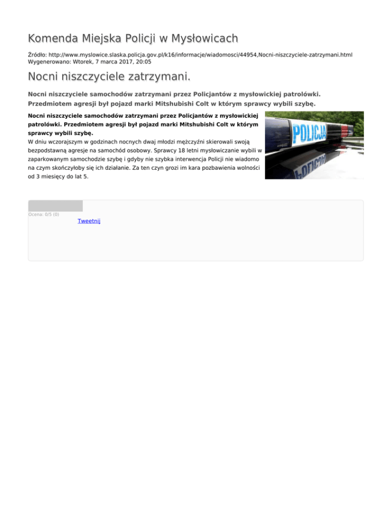 Komenda Miejska Policji w Mysłowicach Źródło: http://www.myslowice.slaska.policja.gov.pl/k16/informacje/wiadomosci/44954,Nocni-niszczyciele-zatrzymani.html Wygenerowano: Wtorek, 7 marca 2017, 20:05 Nocni niszczyciele zatrzymani. Nocni niszczyciele samochodów zatrzymani przez Policjantów z mysłowickiej patrolówki. Przedmiotem agresji był pojazd marki Mitshubishi Colt w którym sprawcy wybili szybę. Nocni niszczyciele samochodów zatrzymani przez Policjantów z mysłowickiej patrolówki. Przedmiotem agresji był pojazd marki Mitshubishi Colt w którym sprawcy wybili szybę. W dniu wczorajszym w godzinach nocnych dwaj młodzi mężczyźni skierowali swoją bezpodstawną agresje na samochód osobowy. Sprawcy 18 letni mysłowiczanie wybili w zaparkowanym samochodzie szybę i gdyby nie szybka interwencja Policji nie wiadomo na czym skończyłoby się ich działanie. Za ten czyn grozi im kara pozbawienia wolności od 3 miesięcy do lat 5. Ocena: 0/5 (0) Tweetnij