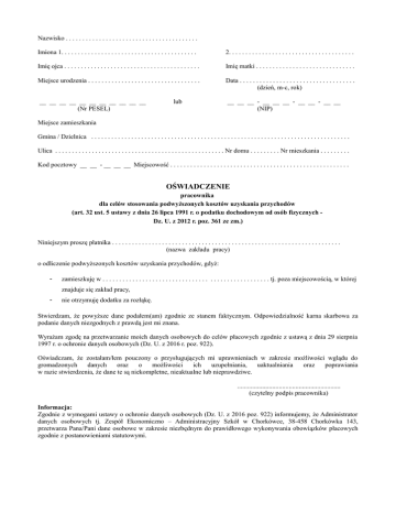 Nazwisko . . . . . . . . . . . . . . . . . . . . . . . . . . . . . . . . . . . . . . . . Imiona 1. . . . . . . . . . . . . . . . . . . . . . . . . . . . . . . . . . . . . . . . . 2. . . . . . . . . . . . . . . . . . . . . . . . . . . . . . . . . . . . . . Imię ojca . . . . . . . . . . . . . . . . . . . . . . . . . . . . . . . . . . . . . . . . . Imię matki . . . . . . . . . . . . . . . . . . . . . . . . . . . . . . Miejsce urodzenia . . . . . . . . . . . . . . . . . . . . . . . . . . . . . . . . . . Data . . . . . . . . . . . . . . . . . . . . . . . . . . . . . . . . . . . (dzień, m-c, rok) __ __ __ __ __ __ __ __ __ __ __ (Nr PESEL) __ __ __ - __ __ __ - __ __ - __ __ (NIP) lub Miejsce zamieszkania Gmina / Dzielnica . . . . . . . . . . . . . . . . . . . . . . . . . . . . . . . . . . . . . . . . . . . . . . . . . . . . . . . . . . . . . . . . . . . . . . . . . . . . . . Ulica . . . . . . . . . . . . . . . . . . . . . . . . . . . . . . . . . . . . . . . . . . . . . . . . . . . Nr domu . . . . . . . . . Nr mieszkania . . . . . . . . . Kod pocztowy __ __ - __ __ __ Miejscowość . . . . . . . . . . . . . . . . . . . . . . . . . . . . . . . . . . . . . . . . . . . . . . . . . . . . . . OŚWIADCZENIE pracownika dla celów stosowania podwyższonych kosztów uzyskania przychodów (art. 32 ust. 5 ustawy z dnia 26 lipca 1991 r. o podatku dochodowym od osób fizycznych Dz. U. z 2012 r. poz. 361 ze zm.) Niniejszym proszę płatnika . . . . . . . . . . . . . . . . . . . . . . . . . . . . . . . . . . . . . . . . . . . . . . . . . . . . . . . . . . . . . . . . . . . . . (nazwa zakładu pracy) o odliczenie podwyższonych kosztów uzyskania przychodów, gdyż: - zamieszkuję w . . . . . . . . . . . . . . . . . . . . . . . . . . . . . . . . . . . . . . . . . . . . . . . . . . tj. poza miejscowością, w której znajduje się zakład pracy, - nie otrzymuję dodatku za rozłąkę. Stwierdzam, że powyższe dane podałem(am) zgodnie ze stanem faktycznym. Odpowiedzialność karna skarbowa za podanie danych niezgodnych z prawdą jest mi znana. Wyrażam zgodę na przetwarzanie moich danych osobowych do celów płacowych zgodnie z ustawą z dnia 29 sierpnia 1997 r. o ochronie danych osobowych (Dz. U. z 2016 r. poz. 922). Oświadczam, że zostałam/łem pouczony o przysługujących mi uprawnieniach w zakresie możliwości wglądu do gromadzonych danych oraz o możliwości ich uzupełniania, uaktualniania oraz poprawiania w razie stwierdzenia, że dane te są niekompletne, nieaktualne lub nieprawdziwe. .............................................................. (czytelny podpis pracownika) Informacja: Zgodnie z wymogami ustawy o ochronie danych osobowych (Dz. U. z 2016 poz. 922) informujemy, że Administrator danych osobowych tj. Zespół Ekonomiczno – Administracyjny Szkół w Chorkówce, 38-458 Chorkówka 143, przetwarza Pana/Pani dane osobowe w zakresie niezbędnym do prawidłowego wykonywania obowiązków płacowych zgodnie z postanowieniami statutowymi.