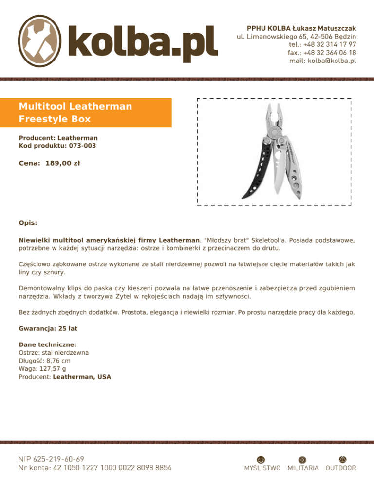 Multitool Leatherman Freestyle Box Producent: Leatherman Kod produktu: 073-003 Cena: 189,00 zł Opis: Niewielki multitool amerykańskiej firmy Leatherman. "Młodszy brat" Skeletool'a. Posiada podstawowe, potrzebne w każdej sytuacji narzędzia: ostrze i kombinerki z przecinaczem do drutu. Częściowo ząbkowane ostrze wykonane ze stali nierdzewnej pozwoli na łatwiejsze cięcie materiałów takich jak liny czy sznury. Demontowalny klips do paska czy kieszeni pozwala na łatwe przenoszenie i zabezpiecza przed zgubieniem narzędzia. Wkłady z tworzywa Zytel w rękojeściach nadają im sztywności. Bez żadnych zbędnych dodatków. Prostota, elegancja i niewielki rozmiar. Po prostu narzędzie pracy dla każdego. Gwarancja: 25 lat Dane techniczne: Ostrze: stal nierdzewna Długość: 8,76 cm Waga: 127,57 g Producent: Leatherman, USA