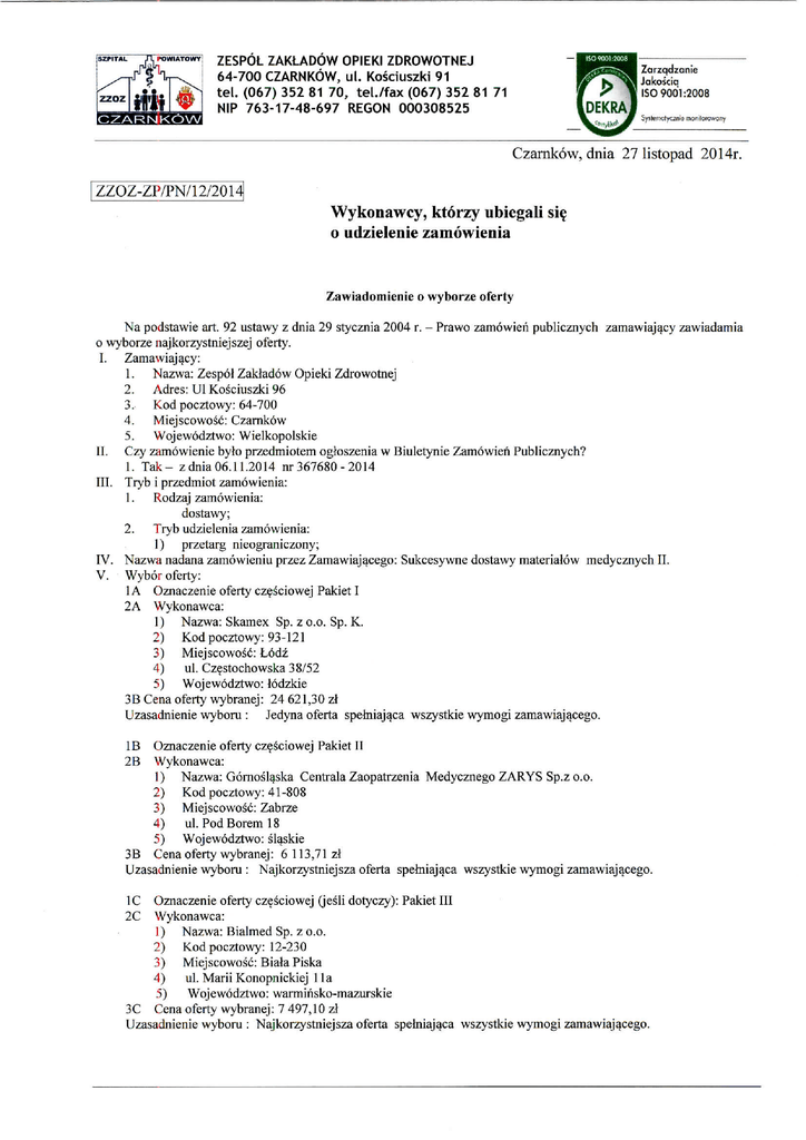 ZESPOL ZAKtADpW OPIEKI ZDROWOTNEJ 64-700 CZARNKOW, ul. Kosciuszki 91 tel. (067) 352 81 70, tel./fax (067) 352 81 71 NIP 763-17-48-697 REGON 000308525 W P \O 9001:2008 IDEKRA^ SystenolyCOTS ra-;njtero-.V3iiy Czarnkow, dnia 27 listopad 2014r. ZZOZ-ZP/PN/12/2014 Wykonawcy, ktorzy ubiegali si o udzielenie zamowienia Zawiadomienie o wyborze oferty Na podstawie art. 92 ustawy z dnia 29 stycznia 2004 r. - Prawo zamowieii publicznych zamawiajacy zawiadamia o wyborze najkorzystniejszej oferty. I. Zamawiajacy: 1. Nazwa: Zespol Zakladow Opieki Zdrowotnej 2. Adres: Ul Kosciuszki 96 3. Kod pocztowy: 64-700 4. Miejscowosc: Czarnkow 5. Wojewodztwo: Wielkopolskie II. Czy zamowiem'e bylo przedmiotem ogtoszenia w Biuletynie Zamowien Publicznych? 1. Tak- zdnia06.11.2014 nr 367680 - 2014 III. Tryb i przedmiot zamowienia: 1. Rodzaj zamowienia: dostawy; 2. Tryb udzielenia zamowienia: 1) przetarg nieograniczony; IV. Nazwa nadana zamowieniu przez Zamawiajacego: Sukcesywne dostawy materialow medycznych II. V. Wybor oferty: 1A Oznaczenie oferty czesciowej Pakiet I 2A Wykonawca: 1) Nazwa: Skamex Sp. z o.o. Sp. K. 2) Kod pocztowy: 93-121 3) Miejscowosc: Lodz 4) ul. Czestochowska 38/52 5) Wojewodztwo: lodzkie 3B Cena oferty wybranej: 24 621,30 zl Uzasadnienie wyboru : Jedyna oferta spelniajaca wszystkie wymogi zamawiajacego. IB 2B Oznaczenie oferty czesciowej Pakiet II Wykonawca: 1) Nazwa: Gornoslaska Centrala Zaopatrzenia Medycznego ZARYS Sp.z o.o. 2) Kod pocztowy: 41-808 3) Miejscowosc: Zabrze 4) ul. PodBoremlS 5) Wojewodztwo: slqskie 3B Cena oferty wybranej: 6 113,71 zl Uzasadnienie wyboru : Najkorzystniejsza oferta spemiaj^ca wszystkie wymogi zamawiaja_cego. 1C 2C Oznaczenie oferty czesciowej (jesli dotyczy): Pakiet III Wykonawca: 1) Nazwa: Bialmed Sp. z o.o. 2) Kod pocztowy: 12-230 3) Miejscowosc: BialaPiska 4) ul. Marii Konopnickiej 1 la 5) Wojewodztwo: warmiiisko-mazurskie 3C Cena oferty wybranej: 7 497,10 zl Uzasadnienie wyboru : Najkorzystniejsza oferta spelniajaea wszystkie wymogi zamawiajaeego. ID Oznaczenie oferty czesciowej (jesli dotyczy): Pakiet IV 2D Wykonawca: 1) Nazwa: Skamex Sp. z o.o. Sp. K. 2) Kodpocztowy: 93-121 3) Miejscowosc: Lodz 4) ul. Czestochowska 38/52 5) Wojewodztwo: lodzkie 3D Cena oferty wybranej: 22 514,22 zt Uzasadnienie wyboru : Jedyna oferta spemiajaca wszystkie wymogi zamawiajacego. IE Oznaczenie oferty cz?sciowej (jesli dotyczy): Pakiet V 2E Wykonawca: 1) Nazwa: Bialmed Sp. z o.o. 2) Kodpocztowy: 12-230 3) Miejscowosc: Biala Piska 4) ul. Marii Konopnickiej l l a 5) Wojewodztwo: warminsko-mazurskie 3E Cena oferty wybranej: 14 640,10 zi 2E Post^powanie uniewazniono : Najkorzystniejsza oferta spemiajaca wszystkie wymogi zamawiajqcego. IF 2F Oznaczenie oferty czesciowej (jesli dotyczy): Pakiet VI Wykonawca: 1) Nazwa: Bialmed Sp. z o.o. 2) Kodpocztowy: 12-230 3) Miejscowosc: Biala Piska 4) ul. Marii Konopnickiej 1 la 5) Wojewodztwo: warminsko-mazurskie 3F Cena oferty wybranej: 18 195,90 zt Uzasadnienie wyboru : Najkorzystniejsza oferta spemiajqca wszystkie wymogi zamawiajacego. 1G Oznaczenie oferty czesciowej (jesli dotyczy): Pakiet VII 2G Wykonawca: 1) Nazwa: Centrum Zaopatrzenia Medycznego i Weterynaryjnego ,,Centrowet-Cezal" Sp. z o.o. 2) Kodpocztowy: 60-543 3) Miejscowosc: Poznan 4) ul. Dabrowskiego 133/135 5) Wojewodztwo: wielkopolskie 3G Cena oferty wybranej: 3 988,01 zt Uzasadnienie wyboru : Najkorzystniejsza oferta spelniajaca wszystkie wymogi zamawiajacego. Umowa zostanie podpisana nie wczesniej niz 03.12.2014r. Opracowala: Maciej Wawrzyniak strona2/2