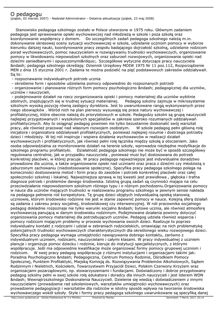 O pedagogu (piątek, 02 marzec 2007) - Nadesłał Administrator - Ostatnia aktualizacja (piątek, 23 maj 2008) Stanowisko pedagoga szkolnego zostało w Polsce utworzone w 1975 roku. Głównym zadaniem pedagoga jest sprawowanie opieki wychowawczej nad młodzieżą w szkole i poza szkołą oraz koordynowanie współpracy z domem. Do szczególnych zadań pedagoga szkolnego należą m.in. dokonywanie okresowej oceny sytuacji wychowawczej w szkole, udzielanie uczniom pomocy w wyborze kierunku dalszej nauki, koordynowanie pracy zespołu badającego dojrzałość szkolną, udzielanie rodzicom porad wychowawczych, pomoc nauczycielom w rozwiązywaniu trudności wychowawczych, organizowanie pomocy w likwidowaniu niepowodzeń szkolnych oraz zaburzeń rozwojowych, organizowanie opieki nad dziećmi zaniedbanymi i opuszczonymi”. Szczegółowe wytyczne dotyczące pracy nauczyciela – pedagoga szkolnego określają: Dziennik Urzędowy MOIW 1975 Nr 11 poz.112, Rozporządzenie MEN z dnia 15 stycznia 2001 r. Zadania te można podzielić na pięć podstawowych zakresów oddziaływań. Są to: - rozpoznawanie indywidualnych potrzeb ucznia - określenie form i sposobów udzielania pomocy odpowiednio do rozpoznanych potrzeb - organizowanie i planowanie różnych form pomocy psychologiczno – pedagogicznej dla uczniów, uczniów i nauczycieli, - podejmowanie działań na rzecz zorganizowania opieki i pomocy materialnej dla uczniów wybitnie zdolnych, znajdujących się w trudnej sytuacji materialnej. Pedagog szkolny zajmuje w mikrosystemie szkolnym wysoką pozycję równą zastępcy dyrektora. Jest to uwarunkowane rangą wykonywanych przez niego obowiązków . Wśród nich na plan pierwszy wysuwają się prace natury wychowawczej i profilaktycznej, które obecnie należą do priorytetowych w szkole. Pedagodzy szkolni są grupą nauczycieli najlepiej przygotowanych i wyszkolonych specjalistów w zakresie szeroko rozumianych oddziaływań profilaktycznych. Aby to osiągnąć pedagog powinien nie tylko bezustannie doskonalić swój warsztat pracy, ale również pracować nad własnym rozwojem osobistym. W szkole pedagog pełni główną rolę inicjatora i organizatora oddziaływań profilaktycznych, ponieważ najlepiej rozumie i dostrzega potrzeby dzieci i młodzieży. W tej roli inspiruje i wspiera działania wychowawców w realizacji działań wychowawczych i profilaktycznych, jak również pełni rolę łącznika między szkołą a otoczeniem. Jako osoba odpowiedzialna za monitorowanie działań na terenie szkoły, wprowadza niezbędne modyfikacje do szkolnego programu profilaktyki. Działalność pedagoga szkolnego nie może być w sposób szczegółowy regulowana centralnie, jak w przypadku nauczyciela , ponieważ musi być dostosowana do potrzeb konkretnej placówki, w której pracuje. W pracy pedagoga najważniejsze jest indywidualne doradztwo prowadzone dla ucznia, a także organizowanie opieki nad uczniami oraz praca z dziećmi czy młodzieżą o zaburzonym zachowaniu (niedostosowanie społeczne). Specyfika pracy pedagoga szkolnego polega na konieczności dostosowania metod i form pracy do zasobów i potrzeb konkretnej placówki oraz całej społeczności szkolnej i lokalnej. Najważniejsza sprawą w tej kwestii jest prawidłowa , głęboka i trafna diagnoza potrzeb i problemów danego środowiska. Istotną grupą zadań są czynności mające na celu przeciwdziałanie niepowodzeniom szkolnym różnego typu i o różnym pochodzeniu.Organizowanie pomocy w nauce dla uczniów mających trudności w realizowaniu programu szkolnego w pewnym sensie nakłada na pedagoga pełnienie roli korepetytora. Tę grupę dzieci objętych indywidualną opieką stanowią uczniowie, którym środowisko rodzinne nie jest w stanie zapewnić pomocy w nauce. Kolejną sferą działań są zadania z zakresu pracy socjalnej, środowiskowej czy interwencyjnej. W roli pracownika socjalnego pedagog dokładnie rozpoznaje nie tylko warunki socjalno – bytowe ucznia, ale również atmosferę wychowawczą panującą w danym środowisku rodzinnym. Podejmowane działania powinny dotyczyć organizowania pomocy materialnej dla potrzebujących uczniów. Pedagog udziela również wsparcia i pomocy rodzicom mającym problemy w procesie wychowania swoich dzieci. Realizuje to poprzez indywidualny kontakt z rodzicami i udział w zebraniach rodzicielskich, omawiając na nich problematykę potencjalnych trudności wychowawczych charakterystycznych dla określonego wieku rozwojowego dzieci. Specyfika pracy pedagoga wymaga umiejętności nawiązywania dobrego kontaktu, zarówno z indywidualnym uczniem, rodzicami, nauczycielami i całymi klasami. W pracy indywidualnej z uczniem planuje i organizuje pomoc dziecku i rodzinie, kieruje do instytucji specjalistycznych, z którymi współpracuje. Jeśli ma odpowiednie kwalifikacje może organizować formy pomocy grupowej uczniom i rodzicom. W swej pracy pedagog współpracuje z różnymi instytucjami i organizacjami takimi jak: Poradnia Psychologiczno – Pedagogiczna, Centrum Pomocy Rodzinie, Ośrodkiem Pomocy Społecznej, Punktem Profilaktyki, Miejską Komisją ds. Rozwiązywania Problemów Alkoholowych, Sądem Rodzinnym i Nieletnich, Kościołem, Towarzystwem Przyjaciół Dzieci, Polskim Czerwony Krzyżem oraz organizacjami pozarządowymi, np. stowarzyszeniami i fundacjami. Doświadczony i dobrze przygotowany pedagog szkolny pełni w swej szkole rolę edukatora i doradcy dla innych nauczycieli i jest liderem WDN – Wewnątrzszkolnego Doskonalenia Nauczycieli. Dzielenie się wiedzą i doświadczeniem z innymi nauczycielami (prowadzenie rad szkoleniowych, warsztatów umiejętności wychowawczych) oraz prowadzenie pedagogizacji i warsztatów dla rodziców w istotny sposób wpływa na tworzenie środowiska wychowawczego wokół szkoły. Style i formy pracy pedagoga szkolnego uwarunkowane są specyfiką danej http://www.sp3plonsk.pl - Szkoła Podstawowa Nr 3 w Płońsku Powered by Mambo Generated: 7 March,