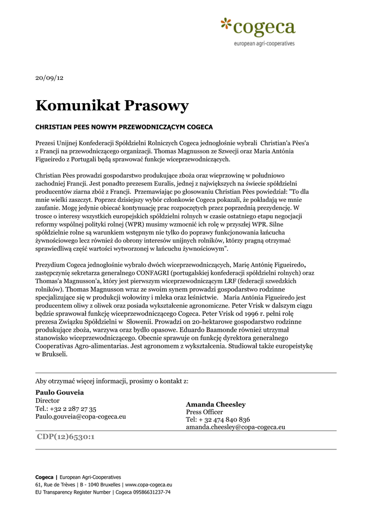 20/09/12 Komunikat Prasowy CHRISTIAN PEES NOWYM PRZEWODNICZĄCYM COGECA Prezesi Unijnej Konfederacji Spółdzielni Rolniczych Cogeca jednogłośnie wybrali Christian'a Pèes'a z Francji na przewodniczącego organizacji. Thomas Magnusson ze Szwecji oraz Maria Antónia Figueiredo z Portugali będą sprawować funkcje wiceprzewodniczących. Christian Pèes prowadzi gospodarstwo produkujące zboża oraz wieprzowinę w południowo zachodniej Francji. Jest ponadto prezesem Euralis, jednej z największych na świecie spółdzielni producentów ziarna zbóż z Francji. Przemawiając po głosowaniu Christian Pèes powiedział: "To dla mnie wielki zaszczyt. Poprzez dzisiejszy wybór członkowie Cogeca pokazali, że pokładają we mnie zaufanie. Mogę jedynie obiecać kontynuację prac rozpoczętych przez poprzednią prezydencję. W trosce o interesy wszystkich europejskich spółdzielni rolnych w czasie ostatniego etapu negocjacji reformy wspólnej polityki rolnej (WPR) musimy wzmocnić ich rolę w przyszłej WPR. Silne spółdzielnie rolne są warunkiem wstępnym nie tylko do poprawy funkcjonowania łańcucha żywnościowego lecz również do obrony interesów unijnych rolników, którzy pragną otrzymać sprawiedliwą część wartości wytworzonej w łańcuchu żywnościowym”. Prezydium Cogeca jednogłośnie wybrało dwóch wiceprzewodniczących, Marię Antónię Figueiredo, zastępczynię sekretarza generalnego CONFAGRI (portugalskiej konfederacji spółdzielni rolnych) oraz Thomas'a Magnusson'a, który jest pierwszym wiceprzewodniczącym LRF (federacji szwedzkich rolników). Thomas Magnusson wraz ze swoim synem prowadzi gospodarstwo rodzinne specjalizujące się w produkcji wołowiny i mleka oraz leśnictwie. Maria Antónia Figueiredo jest producentem oliwy z oliwek oraz posiada wykształcenie agronomiczne. Peter Vrisk w dalszym ciągu będzie sprawował funkcję wiceprzewodniczącego Cogeca. Peter Vrisk od 1996 r. pełni rolę prezesa Związku Spółdzielni w Słowenii. Prowadzi on 20-hektarowe gospodarstwo rodzinne produkujące zboża, warzywa oraz bydło opasowe. Eduardo Baamonde również utrzymał stanowisko wiceprzewodniczącego. Obecnie sprawuje on funkcję dyrektora generalnego Cooperativas Agro-alimentarias. Jest agronomem z wykształcenia. Studiował także europeistykę w Brukseli. Aby otrzymać więcej informacji, prosimy o kontakt z: Paulo Gouveia Director Tel.: +32 2 287 27 35 [email protected] CDP(12)6530:1 Cogeca | European Agri-Cooperatives 61, Rue de Trèves | B - 1040 Bruxelles | www.copa-cogeca.eu EU Transparency Register Number | Cogeca 09586631237-74 Amanda Cheesley Press Officer Tel: + 32 474 840 836 [email protected]