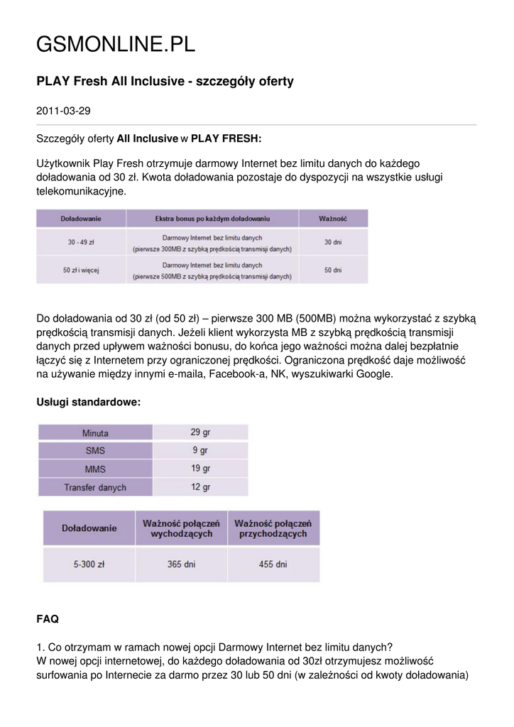 GSMONLINE.PL PLAY Fresh All Inclusive - szczegóły oferty 2011-03-29 Szczegóły oferty All Inclusive w PLAY FRESH: Użytkownik Play Fresh otrzymuje darmowy Internet bez limitu danych do każdego doładowania od 30 zł. Kwota doładowania pozostaje do dyspozycji na wszystkie usługi telekomunikacyjne. Do doładowania od 30 zł (od 50 zł) – pierwsze 300 MB (500MB) można wykorzystać z szybką prędkością transmisji danych. Jeżeli klient wykorzysta MB z szybką prędkością transmisji danych przed upływem ważności bonusu, do końca jego ważności można dalej bezpłatnie łączyć się z Internetem przy ograniczonej prędkości. Ograniczona prędkość daje możliwość na używanie między innymi e-maila, Facebook-a, NK, wyszukiwarki Google. Usługi standardowe: FAQ 1. Co otrzymam w ramach nowej opcji Darmowy Internet bez limitu danych? W nowej opcji internetowej, do każdego doładowania od 30zł otrzymujesz możliwość surfowania po Internecie za darmo przez 30 lub 50 dni (w zależności od kwoty doładowania) bez konieczności liczenia ściągniętych bajtów. W tym okresie możesz korzystać z 300/500 MB z dużą prędkością transmisji danych. Gdy wyczerpiesz przyznane MB przed upływem 30 lub 50 dni wówczas dalej korzystasz za darmo z transmisji danych tylko przy zwolnionej prędkości. Uwaga! Kwota doładowania pozostaje do Twojej dyspozycji na wszystkie usługi telekomunikacyjne 2. Na czym polega Internet bez limitu danych? Internet bez limitu danych oznacza, że w ciągu 30 lub 50 dni, w zależności od kwoty doładowania, nie masz wprowadzonego ograniczenia liczby danych, które możesz ściągnąć z Internetu. Masz tylko dwie prędkości ściągania tych danych. Pierwsze 300/500MB ściągasz z szybką prędkością danych, a po przekroczeniu przyznanych MB przed upływem okresu ich ważności, dalej ściągasz dane za darmo, tylko z wolniejszą prędkością (16kbit/s). 3. Gdy zostanie obniżona prędkość transmisji danych, w jaki sposób mogę przywrócić początkową prędkość? Obniżoną prędkość transmisji danych masz tylko w okresie, w którym wykorzystałeś przyznane MB z szybką transmisją danych a termin ich ważności jeszcze nie upłynął. Prędkość możesz przywrócić: gdy ponownie się doładujesz kwotą co najmniej 30zł, wówczas znowu otrzymasz bonus gdy zakończy się termin ważności poprzednio przyznanych MB 4. Jak mogę skorzystać z opcji Darmowy Internet bez limitu danych? Wystarczy kupić dowolny starter Play Fresh i następnie wybrać i zatwierdzić kod *111*33*7# lub zalogować się na stronie www.24.playmobile.pl i wejść w zakładkę Usługi, a następnie wybrać wybraną opcję. Włączenie usługi będzie trwało do 24 godzin. Dla Opcji Darmowy Internet bez limitu danych nie ma dedykowanego startera. 5. Jak mogę sprawdzić, z jakiej opcji korzystam? Możesz wybrać i zatwierdzić zieloną słuchawką kod *111*33*2# lub *111*49*1# lub zalogować się na stronie www.24.playmobile.pl i sprawdzić, na podsumowaniu konta swoją taryfę. 6. Czy nowa opcja Darmowy Internet bez limitu danych zastąpi obecną opcję Darmowy Internet? Tak. Docelowo ma zastąpić opcję Darmowy Internet. Od 30.03.2011 kod migracyjny na starą opcję Internet będzie nieaktywny. Nie będzie już komunikacji dot. starej opcji. Dedykowane startery będą obowiązywały do wyczerpania zapasów. 7. Czy w opcji Darmowy Internet bez limitu danych są dodatkowe pakiety Internetowe? Nie. Internet jest darmowy i bez limitu danych tylko po doładowaniu kwotą co najmniej 30 zł. 8. Przypadkiem zmieniłem swoją ofertę na Play Fresh. Czy mogę wrócić do mojej starej oferty? ( dotyczy Klientów Play Karta i Nowy Play na Kartę) Niestety nie możesz, ale po co, skoro oferta Play Fresh jest najlepsza na rynku. Tu płacisz tylko 29 gr/minutę do wszystkich sieci, Twoje konto jest aktywne przez rok po każdym doładowaniu, a dodatkowo do każdego doładowania możesz otrzymać super bonus! 9. Czy jeśli zmienię Play Fresh na Opcje Darmowy Internet bez limitu danych to zachowam pakiety minut i SMS-ów? Wszystkie dotychczasowe pakiety przepadną. Zachowasz natomiast wartość konta głównego oraz pakietu złotówek. 10. Czy jeśli zmienię ofertę Play Karta/Nowy Play na Kartę na Play Fresh Darmowy Internet bez limitu danych, to zachowam pakiety minut i SMS-ów? Wszystkie dotychczasowe pakiety przepadną, ale będziesz płacić tylko 29 gr/minutę do wszystkich sieci, Twoje konto będzie aktywne przez rok po każdym doładowaniu, a dodatkowo do każdego doładowania możesz otrzymać super bonus! 11. Czy jeśli zmienię dotychczasową opcję w Play Fresh na opcje Darmowy Internet bez limitu danych to czy będę mógł powrócić do wcześniej wybranej opcji? Tak. Zmiana opcji jest darmowa i można je zmieniać dowolną ilość razy.