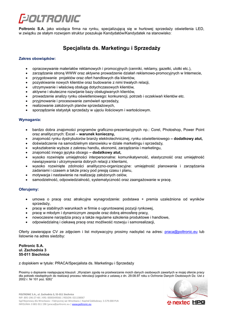 Poltronic S.A. jako wiodąca firma na rynku, specjalizującą się w hurtowej sprzedaży oświetlenia LED, w związku ze stałym rozwojem struktur poszukuje Kandydatów/Kandydatek na stanowisko: Specjalista ds. Marketingu i Sprzedaży Zakres obowiązków: opracowywanie materiałów reklamowych i promocyjnych (cenniki, reklamy, gazetki, ulotki etc.), zarządzanie stroną WWW oraz aktywne prowadzenie działań reklamowo-promocyjnych w Internecie, przygotowanie projektów oraz ofert handlowych dla klientów, pozyskiwanie nowych klientów oraz budowanie z nimi trwałych relacji, utrzymywanie i właściwą obsługę dotychczasowych klientów, aktywne i skuteczne rozwijanie bazy obsługiwanych klientów, prowadzenie analizy rynku oświetleniowego: konkurencji, potrzeb i oczekiwań klientów etc. przyjmowanie i procesowanie zamówień sprzedaży, realizowanie założonych planów sprzedażowych, sporządzanie statystyk sprzedaży w ujęciu ilościowym i wartościowym. Wymagania: bardzo dobra znajomości programów graficzno-prezentacyjnych np.: Corel, Photoshop, Power Point oraz analitycznych: Excel – warunek konieczny, znajomość rynku dystrybutorów branży elektrotechnicznej, rynku oświetleniowego – dodatkowy atut, doświadczenie na samodzielnym stanowisku w dziale marketingu i sprzedaży, wykształcenie wyższe z zakresu handlu, ekonomii, zarządzania i marketingu, znajomość innego języka obcego – dodatkowy atut, wysoko rozwinięte umiejętności interpersonalne: komunikatywność, elastyczność oraz umiejętność nawiązywania i utrzymywania dobrych relacji z klientami, wysoko rozwinięte zdolności analityczno-organizacyjne: umiejętność planowania i zarządzania zadaniami i czasem a także pracy pod presją czasu i planu, motywacja i nastawienie na realizację założonych celów, samodzielność, odpowiedzialność, systematyczność oraz zaangażowanie w pracę. Oferujemy: umowa o pracę oraz atrakcyjne wynagrodzenie: podstawa + premia uzależniona od wyników sprzedaży, pracę w stabilnych warunkach w firmie o ugruntowanej pozycji rynkowej, pracę w młodym i dynamicznym zespole oraz dobrą atmosferę pracy, nowoczesne narzędzia pracy a także regularne szkolenia produktowe i handlowe, odpowiedzialną i ciekawą pracę oraz możliwość rozwoju i samorealizacji, Oferty zawierające CV ze zdjęciem i list motywacyjny prosimy nadsyłać na adres: [email protected] lub listownie na adres siedziby: Poltronic S.A. ul. Zachodnia 3 55-011 Siechnice z dopiskiem w tytule: PRACA/Specjalista ds. Marketingu i Sprzedaży Prosimy o dopisanie następującej klauzuli: „Wyrażam zgodę na przetwarzanie moich danych osobowych zawartych w mojej ofercie pracy dla potrzeb niezbędnych do realizacji procesu rekrutacji (zgodnie z ustawą z dn. 29.08.97 roku o Ochronie Danych Osobowych Dz. Ust z 2002 r. Nr 101 poz. 926)” POLTRONIC S.A., ul. Zachodnia 3, 55-011 Siechnice NIP: 895-196-27-48 | KRS: 0000349566 | REGON: 021138067 Sąd Rejonowy dla Wrocławia – Fabrycznej we Wrocławiu | Kapitał Zakładowy: 3.579.000 PLN INFOLINIA: 0 801 011 198 |[email protected] | www.poltronic.eu