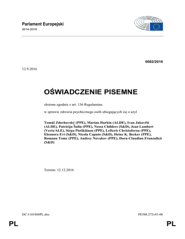 Parlament Europejski 2014-2019 0082/2016 12.9.2016 OŚWIADCZENIE PISEMNE złożone zgodnie z art. 136 Regulaminu w sprawie zdrowia psychicznego osób ubiegających się o azyl Tomáš Zdechovský (PPE), Marian Harkin (ALDE), Ivan Jakovčić (ALDE), Patricija Šulin (PPE), Nessa Childers (S&D), Jean Lambert (Verts/ALE), Sirpa Pietikäinen (PPE), Lefteris Christoforou (PPE), Eleonora Evi (S&D), Nicola Caputo (S&D), Heinz K. Becker (PPE), Romana Tomc (PPE), Andrey Novakov (PPE), Doru-Claudian Frunzulică (S&D) Termin: 12.12.2016 DC\1101868PL.doc PL PE588.272v01-00 PL 0082/2016 Oświadczenie pisemne na mocy art. 136 Regulaminu Parlamentu Europejskiego w sprawie zdrowia psychicznego osób ubiegających się o azyl1 1. Unia Europejska zmaga się obecnie z „kryzysem migracyjnym” – dużą liczbą migrantów ubiegających się o azyl i uciekających przed wojną lub prześladowaniem; 2. takie osoby doświadczają niedopuszczalnej deprywacji oraz strachu, są prześladowane oraz odczuwają straszne skutki wojny, terroryzmu, a często również działalności przestępczej przemytników ludzi; 3. muszą opuszczać swoich najbliższych, a następnie doświadczają odrzucenia i agresji w wielu społecznościach, które ich przyjmują; 4. takie warunki mogą mieć niekorzystny wpływ na ich zdrowie, zwłaszcza zdrowie psychiczne; 5. najbardziej niekorzystne skutki ich przeszłości i obecnej sytuacji, odbijające się na ich zdrowiu psychicznym, mogą być widoczne tylko po przyjeździe do nowego kraju; 6. wzywa się zatem Radę i Komisję do: – uwzględnienia potrzeb osób ubiegających się o azyl w zakresie zdrowia psychicznego oraz okazania współczucia w związku z ich trudną sytuacją przy wypełnianiu swoich kompetencji wynikających z traktatów; – rozpoznania zespołu stresu pourazowego oraz innych zaburzeń zdrowia psychicznego (np. depresji), a także wsparcia w radzeniu sobie z nimi; – pomocy w udzielaniu wsparcia oraz świadczeniu usług mających na celu zapobieganie problemom zdrowia psychicznego, a w przypadku gdy takowe wystąpią, rozwiązywanie ich; 7. niniejsze oświadczenie wraz z nazwiskami sygnatariuszy zostaje przekazane Radzie i Komisji. Zgodnie z art. 136 ust. 4 i 5 Regulaminu Parlamentu Europejskiego, jeżeli pod oświadczeniem podpisze się większość posłów do Parlamentu, jest ono publikowane w protokole wraz z nazwiskami sygnatariuszy i przekazywane adresatom, jednak nie jest ono wiążące dla Parlamentu. 1 PE588.272v01-00 PL 2/2 DC\1101868PL.doc