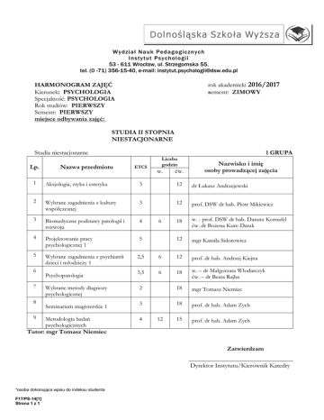 Wydział Nauk Pedagogicznych Instytut Psychologii 53 - 611 Wrocław, ul. Strzegomska 55, tel. (0 -71) 356-15-40, e-mail: [email protected] rok akademicki 2016/2017 semestr: ZIMOWY HARMONOGRAM ZAJĘĆ Kierunek: PSYCHOLOGIA Specjalność: PSYCHOLOGIA Rok studiów: PIERWSZY Semestr: PIERWSZY miejsce odbywania zajęć: STUDIA II STOPNIA NIESTACJONARNE Studia niestacjonarne Lp. Nazwa przedmiotu 1 GRUPA ETCS Liczba godzin w. ćw. Nazwisko i imię osoby prowadzącej zajęcia 1 Aksjologia, etyka i estetyka 3 12 dr Łukasz Andrzejewski 2 Wybrane zagadnienia z kultury współczesnej 3 12 prof. DSW dr hab. Piotr Mikiewicz 3 Biomedyczne podstawy patologii i rozwoju 4 18 w. - prof. DSW dr hab. Danuta Kornafel ćw. dr Bożena Kurc-Darak 4 Projektowanie pracy psychologicznej 1 5 12 mgr Kamila Sidorowicz 5 Wybrane zagadnienia z psychiatrii dzieci i młodzieży 1 6 7 8 9 Psychopatologia Wybrane metody diagnozy psychologicznej Seminarium magisterskie 1 Metodologia badań psychologicznych 6 2,5 6 12 prof. dr hab. Andrzej Kiejna 3,5 6 18 w. – dr Małgorzata Włodarczyk ćw. – dr Beata Rajba 2 18 mgr Tomasz Niemiec 3 18 prof. dr hab. Adam Zych 15 prof. dr hab. Adam Zych 4 12 Tutor: mgr Tomasz Niemiec Zatwierdzam ________________________________ Dyrektor Instytutu/Kierownik Katedry *osoba dokonująca wpisu do indeksu studenta F17/PS-14[1] Strona 1 z 1 Psychologia – 1 rok 1 semestr – studia II stopnia – studia niestacjonarne 9.00 – 11.15 sobota 29.10.16 r. niedziela 30.10.16 r. 9.00 – 11.15 Wybrane zagadnienia z psychiatrii dzieci i młodzieży wykład (1) prof. dr hab. A. Kiejna s. 110 Zjazd nr 2 (29, 30 października 2016 r.) 11.30 – 13.45 14.00 - 16.15 16.30 - 18.45 Wybrane metody diagnozy Biomedyczne podstawy Tutorial psychologicznej patologii i rozwoju (1) (1) (1) mgr T. Niemiec mgr T. Niemiec dr B. Kurc-Darak s. 129 s.129 s. 129 ul. SZKOCKA 64 ul. SZKOCKA 64 ul. SZKOCKA 64 11.30 – 13.45 14.00 - 16.15 16.30 - 18.45 19.00 – 20.00 Wybrane zagadnienia Metodologia badań Metodologia badań z psychiatrii dzieci i psychologicznych psychologicznych Obowiązkowe młodzieży wykład ćwiczenia szkolenie BHP ćwiczenia (1) (1) mgr W. Szymborski (1) prof. dr hab. prof. dr hab. s. 111 prof. dr hab. A. Zych A. Zych ul. Strzegomska 55 A. Kiejna s. 110 s. 110 s. 110 9.00 – 11.15 sobota 19.11.16 r. Seminarium (1) prof. dr hab. A. Zych s. 129 ul. SZKOCKA 64 niedziela 20.11.16 r. Wybrane zagadnienia z psychiatrii dzieci i młodzieży wykład (2) prof. dr hab. A. Kiejna s. 129 ul. SZKOCKA 64 sobota 3.12.16 r. niedziela 4.12.16 r. 9.00 – 11.15 Metodologia badań psychologicznych wykład (2) prof. dr hab. A. Zych s.152 ul. SZKOCKA 64 Psychopatologia wykład (1) dr M. Włodarczyk s. 35 ul. SZKOCKA 64 Zjazd nr 3 (19, 20 listopada 2016 r.) 11.30 – 13.45 14.00 - 16.15 Wybrane zagadnienia z Wybrane metody diagnozy kultury współczesnej psychologicznej (1) (2) prof. DSW dr hab. mgr T. Niemiec P. Mikiewicz s. 129 s. 129 ul. SZKOCKA 64 ul. SZKOCKA 64 Wybrane zagadnienia z Biomedyczne podstawy psychiatrii dzieci i patologii i rozwoju młodzieży wykład ćwiczenia (1) (2) prof. DSW dr hab. prof. dr hab. A. Kiejna D. Kornafel s. 129 s. Teatralna ul. SZKOCKA 64 ul. SZKOCKA 64 Zjazd nr 4 (3, 4 grudnia 2016 r.) 11.30 – 13.45 14.00 - 16.15 Metodologia badań Psychopatologia psychologicznych ćwiczenia ćwiczenia (2) (2) dr B. Rajba prof. dr hab. s. 152 A. Zych ul. SZKOCKA 64 s. 152 ul. SZKOCKA 64 Biomedyczne podstawy Psychopatologia patologii i rozwoju wykład wykład (2) (2) dr M. Włodarczyk prof. DSW dr hab. s. 35 D. Kornafel ul. SZKOCKA 64 s. Teatralna ul. SZKOCKA 64 16.30 - 18.45 Psychopatologia ćwiczenia (1) dr B. Rajba s. 129 ul. SZKOCKA 64 Aksjologia, etyka i estetyka (1) dr Ł. Andrzejewski s. 129 ul. SZKOCKA 64 16.30 - 18.45 Wybrane metody diagnozy psychologicznej (3) mgr T. Niemiec s. 152 ul. SZKOCKA 64 Biomedyczne podstawy patologii i rozwoju (2) dr B. Kurc-Darak s. 35 ul. SZKOCKA 64 Psychologia – 1 rok 1 semestr – studia II stopnia – studia niestacjonarne 9.00 – 11.15 Zjazd nr 5 (17, 18 grudnia 2016 r.) 11.30 – 13.45 14.00 - 16.15 Psychopatologia Wybrane metody diagnozy ćwiczenia psychologicznej (3) (4) dr B. Rajba mgr T. Niemiec s. 152 s. 152 ul. SZKOCKA 64 ul. SZKOCKA 64 sobota 17.12.16 r. Biomedyczne podstawy patologii i rozwoju (3) dr B. Kurc-Darak s. 152 ul. SZKOCKA 64 niedziela 18.12.16 r. Wybrane zagadnienia z psychiatrii dzieci i młodzieży ćwiczenia (3) prof. dr hab. A. Kiejna s. 129 ul. SZKOCKA 64 Wybrane zagadnienia z kultury współczesnej (2) prof. DSW dr hab. P. Mikiewicz s. 129 ul. SZKOCKA 64 9.00 – 11.15 Biomedyczne podstawy patologii i rozwoju (4) dr B. Kurc-Darak s. 129 ul. SZKOCKA 64 Wybrane zagadnienia z psychiatrii dzieci i młodzieży ćwiczenia (4) prof. dr hab. A. Kiejna s. 129 ul. SZKOCKA 64 Zjazd nr 6 (14, 15 stycznia 2017 r.) 11.30 – 13.45 14.00 - 16.15 Biomedyczne podstawy Aksjologia, etyka i estetyka patologii i rozwoju (2) (5) dr Ł. Andrzejewski dr B. Kurc-Darak s. 129 s. 129 ul. SZKOCKA 64 ul. SZKOCKA 64 Wybrane zagadnienia z Projektowanie pracy kultury współczesnej psychologicznej1 (3) (2) prof. DSW dr hab. mgr K. Sidorowicz P. Mikiewicz s. 129 s. 129 ul. SZKOCKA 64 ul. SZKOCKA 64 sobota 14.01.17 r. niedziela 15.01.17 r. 9.00 – 11.15 sobota 28.01.17 r. Biomedyczne podstawy patologii i rozwoju (6) dr B. Kurc-Darak s. 129 ul. SZKOCKA 64 niedziela 29.01.17 r. Wybrane zagadnienia z kultury współczesnej (4) prof. DSW dr hab. P. Mikiewicz s. 113 ul. STRZEGOMSKA 55 Metodologia badań psychologicznych ćwiczenia (3) prof. dr hab. A. Zych s. 129 ul. SZKOCKA 64 Zjazd nr 7 (28, 29 stycznia 2017 r.) 11.30 – 13.45 14.00 - 16.15 Psychopatologia Projektowanie pracy ćwiczenia psychologicznej1 (4) (3) dr B. Rajba mgr K. Sidorowicz s. 129 s. 129 ul. SZKOCKA 64 ul. SZKOCKA 64 Metodologia badań psychologicznych wykład (3) prof. dr hab. A. Zych s. 113 ul. STRZEGOMSKA 55 Metodologia badań psychologicznych ćwiczenia (4) prof. dr hab. A. Zych s. 113 ul. STRZE