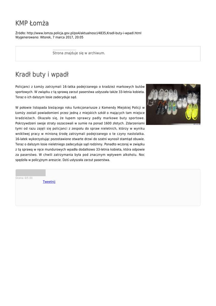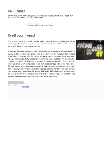 KMP Łomża Źródło: http://www.lomza.policja.gov.pl/po4/aktualnosci/4835,Kradl-buty-i-wpadl.html Wygenerowano: Wtorek, 7 marca 2017, 20:05 Strona znajduje się w archiwum. Kradł buty i wpadł Policjanci z Łomży zatrzymali 16-latka podejrzanego o kradzież markowych butów sportowych. W związku z tą sprawą zarzut paserstwa usłyszała także 33-letnia kobieta. Teraz o ich dalszym losie zadecyduje sąd. W połowie listopada bieżącego roku funkcjonariusze z Komendy Miejskiej Policji w Łomży zostali powiadomieni przez jedną z miejskich szkół o mających tam miejsce kradzieżach. Okazało się, że łupem sprawcy padły markowe buty sportowe. Pokrzywdzeni swoje straty oszacowali w sumie na ponad 1600 złotych. Zdarzeniami tymi od razu zajęli się policjanci z zespołu do spraw nieletnich, którzy w wyniku wnikliwej pracy w minioną środę zatrzymali podejrzanego o te czyny nastolatka. 16-latek wykorzystując pozostawione otwarte drzwi do szatni wynosił stamtąd obuwie. Teraz o dalszym losie nieletniego zadecyduje sąd rodzinny. Ponadto wczoraj w związku z tą sprawą w ręce mundurowych wpadła dodatkowo 33-letnia kobieta, która odpowie za paserstwo. W chwili zatrzymania była pod znacznym wpływem alkoholu. Noc spędziła w policyjnym areszcie. Dziś usłyszała zarzut paserstwa. Ocena: 0/5 (0) Tweetnij