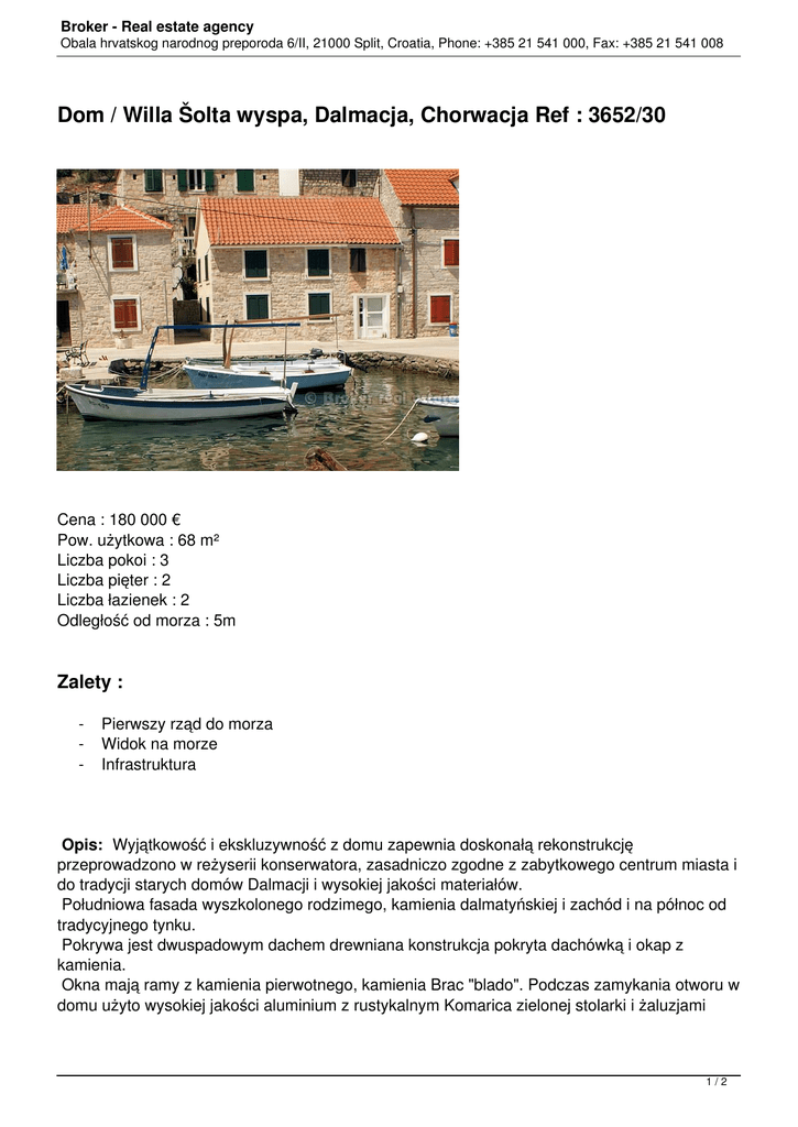 Broker - Real estate agency Obala hrvatskog narodnog preporoda 6/II, 21000 Split, Croatia, Phone: +385 21 541 000, Fax: +385 21 541 008 Dom / Willa Šolta wyspa, Dalmacja, Chorwacja Ref : 3652/30 Cena : 180 000 € Pow. użytkowa : 68 m² Liczba pokoi : 3 Liczba pięter : 2 Liczba łazienek : 2 Odległość od morza : 5m Zalety : - Pierwszy rząd do morza Widok na morze Infrastruktura Opis: Wyjątkowość i ekskluzywność z domu zapewnia doskonałą rekonstrukcję przeprowadzono w reżyserii konserwatora, zasadniczo zgodne z zabytkowego centrum miasta i do tradycji starych domów Dalmacji i wysokiej jakości materiałów. Południowa fasada wyszkolonego rodzimego, kamienia dalmatyńskiej i zachód i na północ od tradycyjnego tynku. Pokrywa jest dwuspadowym dachem drewniana konstrukcja pokryta dachówką i okap z kamienia. Okna mają ramy z kamienia pierwotnego, kamienia Brac "blado". Podczas zamykania otworu w domu użyto wysokiej jakości aluminium z rustykalnym Komarica zielonej stolarki i żaluzjami 1/2 Broker - Real estate agency Obala hrvatskog narodnog preporoda 6/II, 21000 Split, Croatia, Phone: +385 21 541 000, Fax: +385 21 541 008 aluminiowymi. Stolarka jest starannie dobrany by zmieścić się w chronionym, rdzenia historycznego osadnictwa i środowiska autentycznej, w którym jest dom. Dom ma powierzchni brutto budynku o 68 m2. Położony w południowo-zachodniej.Wejście jest od strony północnej i ma dostęp do samochodu.Dom posiada wszystkie połączenia użytkowych. Wszystkie papiery wartościowe domy są zadbane, po spędzeniu 1/1.Wnętrze jest możliwość regulacji na potrzeby przyszłego właściciela. 2/2