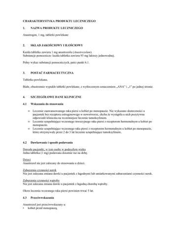CHARAKTERYSTYKA PRODUKTU LECZNICZEGO 1. NAZWA PRODUKTU LECZNICZEGO Anastrogen, 1 mg, tabletki powlekane 2. SKŁAD JAKOŚCIOWY I ILOŚCIOWY Każda tabletka zawiera 1 mg anastrozolu (Anastrozolum). Substancje pomocnicze: każda tabletka zawiera 93 mg laktozy jednowodnej. Pełny wykaz substancji pomocniczych, patrz punkt 6.1. 3. POSTAĆ FARMACEUTYCZNA Tabletka powlekana. Białe, obustronnie wypukłe tabletki powlekane, z wytłoczonym oznaczeniem „ANA” i „1” po jednej stronie. 4. SZCZEGÓŁOWE DANE KLINICZNE 4.1 Wskazania do stosowania • • • 4.2 Leczenie zaawansowanego raka piersi u kobiet po menopauzie. Nie wykazano skuteczności u pacjentek bez receptora estrogenowego w nowotworze, chyba że wystąpiła u nich pozytywna odpowiedź kliniczna na wcześniejsze leczenie tamoksyfenem. Leczenie uzupełniające wczesnego inwazyjnego raka piersi z receptorem hormonalnym u kobiet po menopauzie. Leczenie uzupełniające wczesnego raka piersi z receptorem hormonalnym u kobiet po menopauzie, które otrzymywały przez 2 do 3 lat leczenie uzupełniające tamoksyfenem.. Dawkowanie i sposób podawania Dorosłe pacjentki, w tym osoby w podeszłym wieku Jedna tabletka (1 mg) podawana doustnie raz na dobę. Dzieci Anastrozol nie jest zalecany do stosowania u dzieci. Zaburzenia czynności nerek Nie jest zalecana zmiana dawki u pacjentek z łagodnymi lub umiarkowanymi zaburzeniami czynności nerek. Zaburzenia czynności wątroby Nie jest zalecana zmiana dawki u pacjentek z łagodną chorobą wątroby. Okres leczenia wczesnego raka piersi powinien trwać 5 lat. 4.3 Przeciwwskazania Anastrozol jest przeciwwskazany u: • kobiet przed menopauzą, • • • • kobiet w ciąży lub karmiących piersią, pacjentek z ciężką niewydolnością nerek (klirens kreatyniny poniżej 20 ml/min), pacjentek z umiarkowanymi lub ciężkimi zaburzeniami czynności wątroby, pacjentek ze stwierdzoną nadwrażliwością na anastrozol lub na którąkolwiek substancję pomocniczą wymienioną w punkcie 6.1. Nie należy stosować jednocześnie z anastrozolem leczenia zawierającego estrogeny, ponieważ mogą one przeciwdziałać farmakologicznemu działaniu anastrozolu. Jednoczesne leczenie tamoksyfenem - patrz punkt 4.5. 4.4 Specjalne ostrzeżenia i środki ostrożności dotyczące stosowania Anastrozol nie jest zalecany do stosowania u dzieci, ponieważ nie ustalono bezpieczeństwa stosowania i skuteczności leku w tej grupie pacjentów (patrz punkt 5.1). Anastrozol nie powinien być stosowany u chłopców z niedoborem hormonu wzrostu w połączeniu z terapią hormonem wzrostu. W głównym badaniu klinicznym, nie wykazano skuteczności i nie ustalono bezpieczeństwa stosowania (patrz punkt 5.1). Ponieważ anastrozol zmniejsza stężenie estradiolu, produktu Anastrozol nie wolno stosować u dziewcząt z niedoborem hormonu wzrostu jako uzupełnienia leczenia hormonem wzrostu. Długoterminowe dane dotyczące bezpieczeństwa u dzieci i młodzieży są niedostępne. W razie wątpliwości dotyczących statusu hormonalnego pacjentki, należy wykonać badania biochemiczne w celu potwierdzenia menopauzy. Brak danych potwierdzających bezpieczeństwo stosowania anastrozolu u pacjentek z umiarkowanym lub ciężkim zaburzeniem czynności wątroby oraz ciężkim zaburzeniem czynności nerek (klirens kreatyniny poniżej 20 ml/min). Kobiety z osteoporozą lub ryzykiem tej choroby powinny mieć wykonane formalne badanie oceniające gęstość mineralną kości w badaniu densytometrycznym np. metodą DEXA, na początku leczenia, a następnie w regularnych odstępach. Jeśli właściwe, należy rozpocząć i uważnie monitorować leczenie lub profilaktykę osteoporozy. Nie ma danych dotyczących jednoczesnego stosowania anastrozolu z analogami LHRH. Nie należy stosować takiego połączenia, z wyjątkiem badań klinicznych. Ponieważ anastrozol zmniejsza stężenia krążącego estrogenu, może on powodować zmniejszenie gęstości mineralnej kości prowadzące do zwiększenia ryzyka złamań. Stosowanie bifosfonianów może zapobiegać dalszej utracie gęstości mineralnej kości spowodowanej przez anastrozol u kobiet po menopauzie i powinno być rozważone. Produkt zawiera laktozę. Pacjenci z rzadko występującą dziedziczną nietolerancją galaktozy, niedoborem laktazy typu Lapp lub zespołem złego wchłaniania glukozy-galaktozy nie powinni przyjmować tego leku. 4.5 Interakcje z innymi produktami leczniczymi i inne rodzaje interakcji Anastrozol hamował in vitro cytochrom P450 1A2, 2C8/9 i 3A4 , ale badanie interakcji klinicznych z warfaryną wykazało, że anastrozol w dawce 1 mg nie hamuje znacząco przemian substancji metabolizowanych za pośrednictwem cytochromu P450. Badania kliniczne dotyczące interakcji pomiędzy antypiryną i cymetydyną wykazały, że jednoczesne stosowanie anastrazolu z innymi lekami nie powinno powodować istotnych klinicznie interakcji wywołanych przez cytochrom P450. Przegląd baz danych badań klinicznych dotyczących bezpieczeństwa stosowania nie ujawnił występowania klinicznie istotnych interakcji u pacjentek leczonych anastrozolem, które przyjmowały także inne 2 powszechnie przepisywane leki. Nie obserwowano klinicznie istotnych interakcji z bifosfonianami (patrz punkt 5.1). Nie należy podawać tamoksyfenu jednocześnie z anastrozolem, gdyż może to zmniejszyć jego farmakologiczne działanie (patrz punkt 4.3). 4.6 Wpływ na płodność, ciążę i laktację Ciąża Brak danych dotyczących stosowania anastrozolu u pacjentek w ciąży. Badania na zwierzętach wykazały toksyczny wpływ na rozród (patrz punkt 5.3). Potencjalne ryzyko u ludzi nie jest znane. Anastrozol jest przeciwwskazany u kobiet w ciąży. Laktacja Nie wiadomo, czy anastrozol przenika do mleka ludzkiego. Anastrozol jest przeciwwskazany u kobiet karmiących piersią. 4.7 Wpływ na zdolność prowadzenia pojazdów i obsługiwania maszyn Jest mało prawdopodobne, aby anastrozol zaburzał zdolność prowadzenia poja