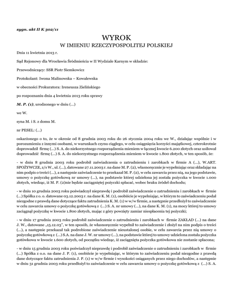 sygn. akt II K 302/11 WYROK W IMIENIU RZECZYPOSPOLITEJ POLSKIEJ Dnia 11 kwietnia 2013 r. Sąd Rejonowy dla Wrocławia Śródmieścia w II Wydziale Karnym w składzie: Przewodniczący: SSR Piotr Siemkowicz Protokolant: Iwona Malinowska – Kowalewska w obecności Prokuratora: Ireneusza Zielińskiego po rozpoznaniu dnia 4 kwietnia 2013 roku sprawy M. P. (1), urodzonego w dniu (...) we W. syna M. i S. z domu M. nr PESEL: (...) oskarżonego o to, że w okresie od 8 grudnia 2003 roku do 26 stycznia 2004 roku we W., działając wspólnie i w porozumieniu z innymi osobami, w warunkach czynu ciągłego, w celu osiągnięcia korzyści majątkowej, czterokrotnie doprowadził firmę (...) S. A. do niekorzystnego rozporządzenia mieniem w łącznej kwocie 6.200 złotych oraz usiłował doprowadzić firmę (...) S. A. do niekorzystnego rozporządzenia mieniem w kwocie 1.800 złotych, w ten sposób, że: - w dniu 8 grudnia 2003 roku podrobił zaświadczenia o zatrudnieniu i zarobkach w firmie A (...), W.ART. SPOŻYWCZE, z/s W., ul. (...), datowane 27.11.2003 r. na dane M. P. (2), własnoręcznie je wypełniając oraz składając na nim podpis o treści (...), a następnie zaświadczenie to przekazał M. P. (2), w celu zawarcia przez nią, na jego podstawie, umowy o pożyczkę gotówkową nr umowy (...), na podstawie której udzielona jej została pożyczka w kwocie 1.000 złotych, wiedząc, iż M. P. (2)nie będzie zaciągniętej pożyczki spłacać, wobec braku źródeł dochodu; - w dniu 10 grudnia 2003 roku poświadczył nieprawdę i podrobił zaświadczenie o zatrudnieniu i zarobkach w firmie (...) Spółka z o. o. datowane 03.12.2003 r. na dane K. M. (1), osobiście je wypełniając, w którym to zaświadczeniu podał niezgodne z prawdą dane dotyczące faktu zatrudnienia K. M. (1) w w/w firmie, a następnie przedłożył to zaświadczenie w celu zawarcia umowy o pożyczkę gotówkową z (...) S. A. nr umowy (...), na dane K. M. (1), na mocy której to umowy zaciągnął pożyczkę w kwocie 1.800 złotych, mając z góry powzięty zamiar niespłacenia tej pożyczki; - w dniu 17 grudnia 2003 roku podrobił zaświadczenie o zatrudnieniu i zarobkach w firmie ZAKŁAD (...) na dane J. W., datowane „15.12.03”, w ten sposób, że własnoręcznie wypełnił to zaświadczenie i złożył na nim podpis o treści (...), a następnie przekazał tak podrobione zaświadczenie nieustalonej osobie, w celu zawarcia przez nią umowy o pożyczkę gotówkową z (...) S.A. na dane J. W. nr umowy (...), na podstawie której to umowy udzielona została pożyczka gotówkowa w kwocie 1.600 złotych, od początku wiedząc, iż zaciągnięta pożyczka gotówkowa nie zostanie spłacona; - w dniu 15 grudnia 2003 roku poświadczył nieprawdę i podrobił zaświadczenie o zatrudnieniu i zarobkach w firmie (...) Spółka z o.o. na dane J. P. (1), osobiście je wypełniając, w którym to zaświadczeniu podał niezgodne z prawdą dane dotyczące faktu zatrudnienia J. P. (1) w w/w firmie i wysokości osiąganych przez niego dochodów, a następnie w dniu 31 grudnia 2003 roku przedłożył to zaświadczenie w celu zawarcia umowy o pożyczkę gotówkową z (...) S. A. , nr umowy (...) na dane J. P. (1), podrabiając podpis J. P. (1) na tejże umowie, na mocy której zaciągnął pożyczkę w kwocie 1.800 złotych, mając z góry powzięty zamiar niespłacenia zaciągniętej pożyczki; - w dniu 26 stycznia 2004 roku usiłował doprowadzić do niekorzystnego rozporządzenia mieniem w kwocie 1.800 złotych (...) S. A.w ten sposób, że podrobił zaświadczenie o zatrudnieniu i zarobkach w firmie A (...), W., ART. SPOŻYWCZE z/s W., ul. (...)na nim dane E. P. (1), własnoręcznie je wypełniając oraz składając na nim podpis o treści (...), a następnie przekazał podrobione przez siebie zaświadczenie E. P. (1), w celu zawarcia przez nią na podstawie w/w zaświadczenia, umowy o pożyczkę gotówkową w kwocie 1.800 złotych, wiedząc, iż E. P. (1)pożyczki tej nie będzie spłacać wobec braku źródeł dochodu, lecz zamierzonego celu nie osiągnął, z uwagi na ujawnienie przez przedstawiciela (...) S. A., przy przystąpieniu do weryfikacji sytuacji finansowej E. P. (1), faktu podrobienia zaświadczenia o zatrudnieniu i zarobkach, przy czym czynów tych dopuścił się działając w warunkach przestępstwa, będąc uprzednio skazanym: - wyrokiem Sądu Rejonowego dla Wrocławia - Fabrycznej z dnia 11 października 1996 roku, o sygn. akt II K 223/96, na karę łączną 1 roku i 6 miesięcy pozbawienia wolności, za czyn z art. 215 § 1 d.k.k. w zw. z art. 60 § 1 d.k.k. popełniony w dniu 31 lipca 1995 roku; - wyrokiem Sądu Rejonowego dla Wrocławia - Śródmieścia z dnia 7 lutego 1997 roku o sygn. akt II K 1576/95 za przestępstwo z art. 208 d.k.k. w zw. z art. 60 § 2 d.k.k. popełnione w dniu 10 maja 1995 roku na karę 2 lat pozbawienia wolności; - wyrokiem Sądu Rejonowego w Opolu z dnia 27 marca 1998 roku o sygn. akt II K 1637/97 za czyn z art. 208 d.k.k. w zw. z art. 60 § 2 k.k. popełnione w nocy 19/20.09.1995 roku na karę 1 roku i 2 miesięcy pozbawienia wolności, objętymi następnie wyrokiem łącznym Sądu Rejonowego w Opolu w II Wydziale Karnym z dnia 25 maja 1999 roku o sygn. II K 642/98 orzekającym karę łączną 4 lat i 6 miesięcy pozbawienia wolności, którą odbywał w okresie od 2 grudnia 1996 roku do 9 lutego 2001 roku; tj. o czyn z art. 286 § 1 k.k. i art. 13 § 1 k.k. w zw. z art. 286 § 1 k.k. i art. 271 § 3 k.k. i art. 270 § 1 k.k. w zw. z art. 11 § 2 k.k. w zw. z art. 12 k.k. w zw. z art. 64 § 1 k.k. I. oskarżonego M. P. (1) uznaje za winnego popełnienia czynu opisanego w części wstępnej wyroku, a stanowiącego przestępstwo z art. 286 § 1 k.k. i art. 13 § 1 k.k. w zw. z art. 286 § 1 k.k. i art. 271 § 3 k.k. i art. 270 § 1 k.k. w zw. z art. 11 § 2 k.k. w zw. z art. 12 k.k. w zw. z art. 64 § 1 k.k., i za to na podstawie art. 286 § 1 k.k. w zw. z art. 11 § 3 k.k. w zw. z art. 
