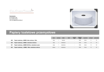 Zamówienia: tel: 25 643 57 59 fax: 25 643 40 28 mail: [email protected] Papiery toaletowe przemysłowe kolor warstwy skład listki rozmiar listka długość wstęgi wysokość szt/opak opak/paleta 400 Papier toaletowy, JUMBO, biały celuloza, 120m biały 1 celuloza - - 120m 9,5cm 6 72 450 Papier toaletowy, JUMBO, makulatura bielona biały 1 makulatura - - 120m 9,5cm 12 50 451 Papier toaletowy, JUMBO ECOline, makulatura szara szary 1 makulatura - - 120m 9,5cm 12 50 452 Papier toaletowy, JUMBO, 100m, makulatura zielona zielone 1 makulatura - - 100m 9,5cm 12 50