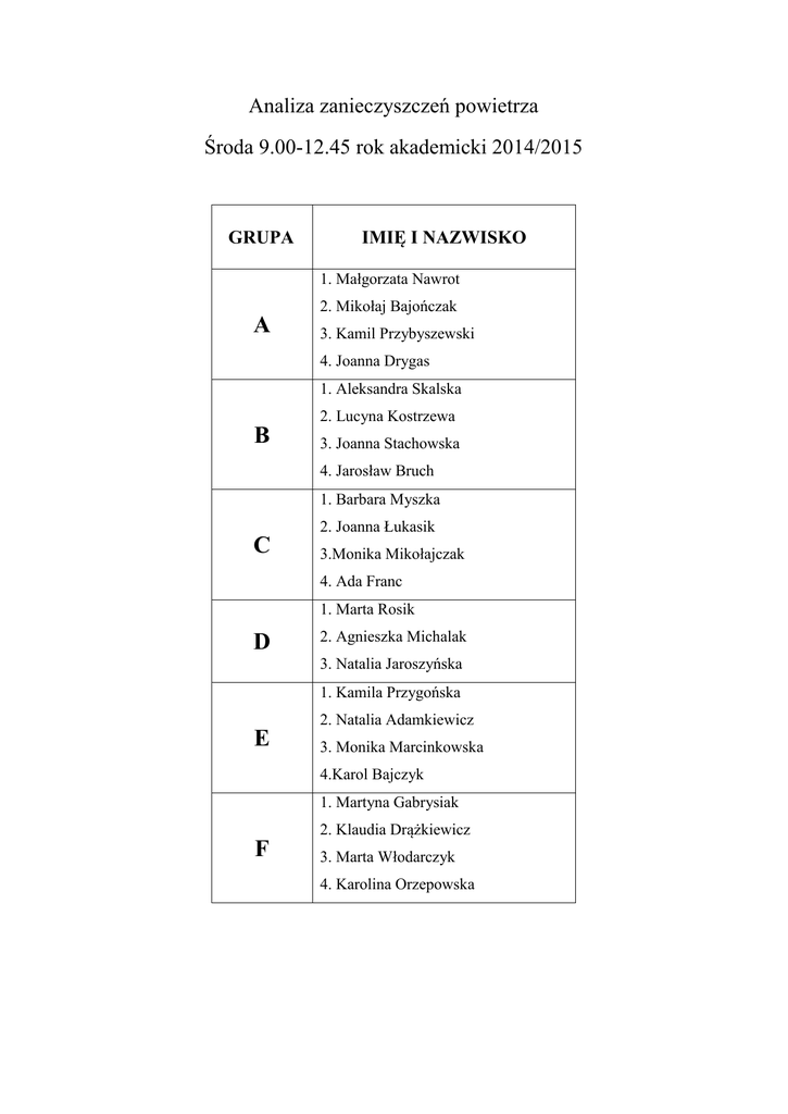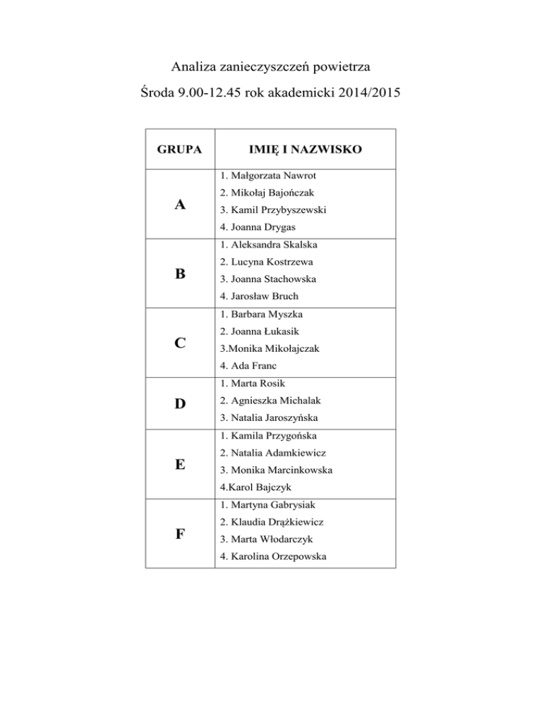 Analiza zanieczyszczeń powietrza Środa 9.00-12.45 rok akademicki 2014/2015 GRUPA IMIĘ I NAZWISKO 1. Małgorzata Nawrot 2. Mikołaj Bajończak A 3. Kamil Przybyszewski 4. Joanna Drygas 1. Aleksandra Skalska 2. Lucyna Kostrzewa B 3. Joanna Stachowska 4. Jarosław Bruch 1. Barbara Myszka 2. Joanna Łukasik C 3.Monika Mikołajczak 4. Ada Franc 1. Marta Rosik D 2. Agnieszka Michalak 3. Natalia Jaroszyńska 1. Kamila Przygońska 2. Natalia Adamkiewicz E 3. Monika Marcinkowska 4.Karol Bajczyk 1. Martyna Gabrysiak 2. Klaudia Drążkiewicz F 3. Marta Włodarczyk 4. Karolina Orzepowska