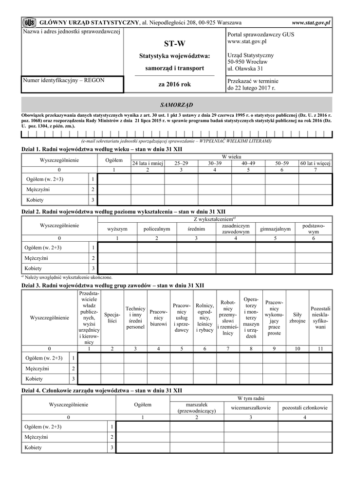 GŁÓWNY URZĄD STATYSTYCZNY, al. Niepodległości 208, 00-925 Warszawa www.stat.gov.pl Nazwa i adres jednostki sprawozdawczej Portal sprawozdawczy GUS www.stat.gov.pl ST-W Urząd Statystyczny 50-950 Wrocław ul. Oławska 31 Statystyka województwa: samorząd i transport Numer identyfikacyjny – REGON Przekazać w terminie do 22 lutego 2017 r. za 2016 rok SAMORZĄD Obowiązek przekazywania danych statystycznych wynika z art. 30 ust. 1 pkt 3 ustawy z dnia 29 czerwca 1995 r. o statystyce publicznej (Dz. U. z 2016 r. poz. 1068) oraz rozporządzenia Rady Ministrów z dnia 21 lipca 2015 r. w sprawie programu badań statystycznych statystyki publicznej na rok 2016 (Dz. U. poz. 1304, z późn. zm.). (e-mail sekretariatu jednostki sporządzającej sprawozdanie – WYPEŁNIAĆ WIELKIMI LITERAMI) Dział 1. Radni województwa według wieku – stan w dniu 31 XII Wyszczególnienie Ogółem 0 1 Ogółem (w. 2+3) 1 Mężczyźni 2 Kobiety 3 W wieku 24 lata i mniej 2 25–29 3 30–39 4 40–49 5 60 lat i więcej 7 50–59 6 Dział 2. Radni województwa według poziomu wykształcenia – stan w dniu 31 XII Wyszczególnienie wyższym policealnym 1 2 0 a) Ogółem (w. 2+3) 1 Mężczyźni 2 Kobiety 3 Z wykształceniema) zasadniczym średnim zawodowym 3 4 podstawowym 6 gimnazjalnym 5 Należy uwzględnić wykształcenie ukończone. Dział 3. Radni województwa według grup zawodów – stan w dniu 31 XII Przedstawiciele władz publiczSpecjanych, liści wyżsi urzędnicy i kierownicy 1 2 Wyszczególnienie 0 Ogółem (w. 2+3) 1 Mężczyźni 2 Kobiety 3 Technicy Pracowi inny nicy średni biurowi personel 3 4 OperaRobotPracow- Rolnicy, torzy nicy nicy ogrodi monprzemyusług nicy, terzy słowi i sprze- leśnicy maszyn i rzemieśdawcy i rybacy i urząlnicy dzeń 5 6 7 Pracownicy wykonujący prace proste Siły zbrojne Pozostali niesklasyfikowani 9 10 11 8 Dział 4. Członkowie zarządu województwa – stan w dniu 31 XII W tym radni Wyszczególnienie Ogółem 0 1 Ogółem (w. 2+3) 1 Mężczyźni 2 Kobiety 3 marszałek (przewodniczący) 2 wicemarszałkowie pozostali członkowie 3 4 Dział 5. Referenda wojewódzkie Uprawnieni do głosowania Wyszczególnienie w tym głosy ważne 3 ogółem 0 1 1. Referenda w sprawie odwołania sejmiku województwa Skuteczność referendum (głosy ważne oddane na zaproponowane rozwiązania) Oddane głosy 2 głosy „za” głosy „przeciw” 4 5 1.1 1.2 1.3 2.1 2. Referenda w sprawach innych 2.2 2.3 Dział 6. Spółki specjalnego przeznaczenia/spółki celowe – stan w dniu 31 XII A. Czy jednostka samorządu terytorialnego utworzyła spółkę specjalnego przeznaczenia/celowąa)? W przypadku odpowiedzi „Tak” proszę podać rok utworzenia każdej spółki (dotyczy aktywnych spółek). 1 2 Tak Nie 1 2 Tak Nie Rok utworzenia: a) B. Czy jednostka samorządu terytorialnego przystąpiła do spółki specjalnego przeznaczenia/celowej ? W przypadku odpowiedzi „Tak” proszę podać rok przystąpienia do każdej ze spółek (dotyczy aktywnych spółek). Rok przystąpienia: Spółka specjalnego przeznaczenia (SPE) lub spółka celowa (SPV) to przeważnie spółka z ograniczoną odpowiedzialnością lub spółka komandytowa powołana w określonym, wąskim lub czasowo ograniczonym celu oraz aby wykluczyć ryzyko finansowe, szczególny sposób opodatkowania lub ryzyko związane z nadzorem. a) Proszę podać szacunkowy czas (w minutach) przeznaczony na przygotowanie danych dla potrzeb wypełnianego formularza Proszę podać szacunkowy czas (w minutach) przeznaczony na wypełnienie formularza 1 2 (e-mail osoby sporządzającej sprawozdanie – WYPEŁNIAĆ WIELKIMI LITERAMI) (imię, nazwisko i telefon osoby (miejscowość, data) sporządzającej sprawozdanie) * Wymóg opatrzenia pieczęcią dotyczy wyłącznie sprawozdania wnoszonego w postaci papierowej. (pieczątka imienna i podpis osoby działającej w imieniu sprawozdawcy)* Objaśnienia do formularza ST-W do części „Samorząd” Uwaga: W e-mailu każdy znak powinien zostać wpisany w odrębnej kratce. Z E N O N . K O W A L S K I @ X X X . Uwaga: Działów 1–4 nie wypełniają województwa, w których ustanowiony jest zarząd komisaryczny. Objaśnienia do działu 2 W rubryce 1, zgodnie z ustawą z dnia 27 lipca 2005 r. – Prawo o szkolnictwie wyższym (Dz. U. z 2012 r. poz. 572, z późn. zm.), należy wykazać osoby, które uzyskały tytuł zawodowy licencjata, inżyniera, magistra, magistra inżyniera lub tytuł równorzędny; uzyskały stopień naukowy doktora, doktora habilitowanego lub tytuł naukowy profesora. Rubrykę 2 należy wypełnić zgodnie z art. 9 ust. 1 pkt 3 lit. d ustawy z dnia 7 września 1991 r. o systemie oświaty (Dz. U. z 2015 r. poz. 2156, z późn. zm.). Należy wykazać osoby, które ukończyły szkołę policealną i uzyskały dyplom potwierdzający kwalifikacje zawodowe. Rubryki 3, 4, 5, 6 należy wypełnić zgodnie z art. 11a (odpowiednio ust. 4, 3, 2, 1) ustawy z dnia 7 września 1991 r. o systemie oświaty. W rubryce 3 należy wykazać osoby, które ukończyły liceum ogólnokształcące lub technikum. Suma rubryk od 1 do 6 powinna być zgodna z rubryką 1 działu 1 we wszystkich wierszach. Objaśnienia do działu 3 Dział 3 należy wypełnić zgodnie z rozporządzeniem Ministra Pracy i Polityki Społecznej z dnia 7 sierpnia 2014 r. w sprawie klasyfikacji zawodów i specjalności na potrzeby rynku pracy oraz zakresu jej stosowania (Dz. U. poz. 1145). Emeryci i renciści powinni być ujmowani według zawodu wykonywanego przed przejściem na emeryturę lub rentę. W rubryce 11 należy wykazać osoby bezrobotne, niepracujące i nieszukające pracy oraz osoby uczące się. Y Y Y . P L Suma rubryk od 1 do 11 powinna być zgodna z rubryką 1 działu 1 we wszystkich wierszach. Objaśnienia do działu 4 Do działu 4 stosuje się odpowiednie przepisy ustawy z dnia 5 czerwca 1998 r. o samorządzie województwa (Dz. U. z 2016 r. poz. 486, z późn. zm.). Jednostki wykazują odpowiednio w rubryce 2 marszałka wo