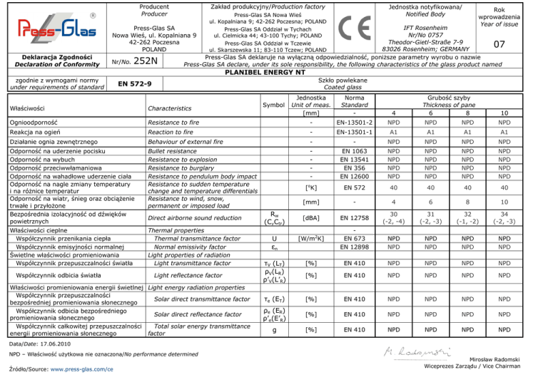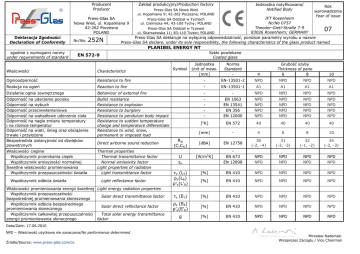Producent Producer Zakład produkcyjny/Production factory Nr/No. 252N Rok wprowadzenia Year of issue a IFT Rosenheim Nr/No 0757 Theodor-Gietl-Straße 7-9 Press-Glas SA Oddział w Tczewie 07 83026 Rosenheim; GERMANY ul. Skarszewska 11; 83-110 Tczew; POLAND Press-Glas SA deklaruje na wyłączną odpowiedzialność, poniŜsze parametry wyrobu o nazwie Press-Glas SA declare, under its sole responsibility, the following characteristics of the glass product named Press-Glas SA Nowa Wieś, ul. Kopalniana 9 42-262 Poczesna POLAND Deklaracja Zgodności Declaration of Conformity Jednostka notyfikowana/ Notified Body a Press-Glas SA Nowa Wieś ul. Kopalniana 9; 42-262 Poczesna; POLAND Press-Glas SA Oddział w Tychach ul. Cielmicka 44; 43-100 Tychy; POLAND a PLANIBEL ENERGY NT zgodnie z wymogami normy under requirements of standard Szkło powlekane Coated glass EN 572-9 Symbol Jednostka Unit of meas. [mm] Norma Standard - 4 Grubość szyby Thickness of pane 6 8 Właściwości Characteristics Ognioodporność Resistance to fire - EN-13501-2 NPD NPD NPD NPD Reakcja na ogień Reaction to fire - EN-13501-1 A1 A1 A1 A1 Działanie ognia zewnętrznego Behaviour of external fire - - NPD NPD NPD NPD Odporność na uderzenie pocisku Odporność na wybuch Odporność przeciwwłamaniowa Odporność na wahadłowe uderzenie ciała Odporność na nagle zmiany temperatury i na róŜnice temperatur Odporność na wiatr, śnieg oraz obciąŜenie trwałe i przyłoŜone Bezpośrednia izolacyjność od dźwięków powietrznych Bullet resistance Resistance to explosion Resistance to burglary Resistance to pendulum body impact Resistance to sudden temperature change and temperature differentials Resistance to wind, snow, permanent or imposed load - EN 1063 EN 13541 EN 356 EN 12600 NPD NPD NPD NPD NPD NPD NPD NPD NPD NPD NPD NPD NPD NPD NPD NPD [oK] EN 572 40 40 40 40 [mm] - 4 6 8 10 [dBA] EN 12758 30 (-2, -4) 31 (-2, -3) 32 (-1, -2) 34 (-2, -3) Właściwości cieplne Współczynnik przenikania ciepła Współczynnik emisyjności normalnej Świetlne właściwości promieniowania Współczynnik przepuszczalności światła Thermal properties Thermal transmittance factor Normal emissivity factor Light properties of radiation Light transmittance factor U εn [W/m2K] EN 673 EN 12898 NPD NPD NPD NPD NPD NPD NPD NPD τV (LT) ρV(LR) ρ’V(L’R) [%] EN 410 NPD NPD NPD NPD [%] EN 410 NPD NPD NPD NPD τe (ET) [%] EN 410 NPD NPD NPD NPD ρe (ER) ρ’e(E’R) [%] EN 410 NPD NPD NPD NPD g [%] EN 410 NPD NPD NPD NPD Współczynnik odbicia światła Direct airborne sound reduction Light reflectance factor Właściwości promieniowania energii świetlnej Light energy radiation properties Współczynnik przepuszczalności Solar direct transmittance factor bezpośredniej promieniowania słonecznego Współczynnik odbicia bezpośredniego Solar direct reflectance factor promieniowania słonecznego Współczynnik całkowitej przepuszczalności Total solar energy transmittance energii promieniowania słonecznego factor Rw (C,Ctr) 10 Data/Date: 17.06.2010 NPD – Właściwość uŜytkowa nie oznaczona/No performance determined Źródło/Source: www.press-glas.com/ce Mirosław Radomski Wiceprezes Zarządu / Vice Chairman Jednostka notyfikowana przeprowadzająca WBT wyrobu: Rok Press-Glas SA Oddział w Tychach Notified Body wprowadzenia ul. Cielmicka 44; 43-100 Tychy for Initial Type Testing: a Year of issue Press-Glas SA Oddział w Tczewie Instytut Szkła i Ceramiki 06 ul. Skarszewska 11; 83-110 Tczew ul. Postępu 9 02-676 Warszawa POLAND POLAND Press-Glas SA deklaruje na wyłączną odpowiedzialność, poniŜsze parametry wyrobu o nazwie Press-Glas SA declare, under its sole responsibility, the following characteristics of the glass product named Zakład produkcyjny/Production factory Producent Producer Press-Glas SA Nowa Wieś, ul. Kopalniana 9 42-262 Poczesna; POLAND Deklaracja Zgodności Declaration of Conformity Nr/No. 253N a a PLANIBEL ENERGY NT hartowany (ESG) / PLANIBEL ENERGY NT toughtened (ESG) zgodnie z wymogami normy under requirements of standard EN 12150-2 Termicznie hartowane bezpieczne szkło sodowo-wapniowo-krzemianowe, przeznaczone do zastosowań w budownictwie. Thermally toughened soda lime silicate safety glass, intended to be used in buildings and construction works. Symbol Jednostka Unit of meas. Norma Standard Grubość szyby Thickness of pane Właściwości Characteristics [mm] - 4 6 8 10 Ognioodporność Resistance to fire - EN-13501-2 NPD NPD NPD NPD Reakcja na ogień Reaction to fire - EN-13501-1 A1 A1 A1 A1 Działanie ognia zewnętrznego Behaviour of external fire - - NPD NPD NPD NPD Odporność na uderzenie pocisku Odporność na wybuch Odporność przeciwwłamaniowa Odporność na wahadłowe uderzenie ciała Odporność na nagle zmiany temperatury i na róŜnice temperatur Odporność na wiatr, śnieg oraz obciąŜenie trwałe i przyłoŜone Bezpośrednia izolacyjność od dźwięków powietrznych Bullet resistance Resistance to explosion Resistance to burglary Resistance to pendulum body impact Resistance to sudden temperature change and temperature differentials Resistance to wind, snow, permanent or imposed load - EN 1063 EN 13541 EN 356 EN 12600 NPD NPD NPD 1(C)3 NPD NPD NPD 1(C)2 NPD NPD NPD 1(C)2 NPD NPD NPD 1(C)1 [oK] EN 12150 200 200 200 200 [mm] - 4 6 8 10 [dBA] EN 12758 30 (-2, -4) 31 (-2, -3) 32 (-1, -2) 34 (-2, -3) Właściwości cieplne Współczynnik przenikania ciepła Współczynnik emisyjności normalnej Świetlne właściwości promieniowania Współczynnik przepuszczalności światła Thermal properties Thermal transmittance factor Normal emissivity factor Light properties of radiation Light transmittance factor U εn [W/m2K] EN 673 EN 12898 NPD NPD NPD NPD NPD NPD NPD NPD τV (LT) ρV(LR) ρ’V(L’R) [%] EN 410 [%] EN 410 83 7 7 82 7 7 81 7 7 80 7 7 τe (ET) [%] EN 410 48 46 45 44 ρe (ER) ρ’e(E’R) [%] EN 410 39 29 39 26 39 24 39 22 g [%] EN 410 NPD NPD NPD NPD Współczynnik odbicia ś