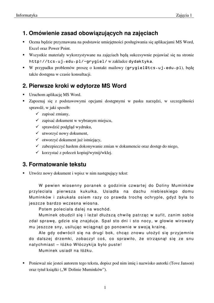 Informatyka Zajęcia 1 1. Omówienie zasad obowiązujących na zajęciach Ocena będzie przyznawana na podstawie umiejętności posługiwania się aplikacjami MS Word, Excel oraz Power Point. Wszystkie materiały wykorzystywane na zajęciach będą sukcesywnie pojawiać się na stronie http://tcs.uj.edu.pl/~grygiel/ w zakładce dydaktyka. W przypadku problemów proszę o kontakt mailowy ([email protected]), będę także dostępna w czasie konsultacji. 2. Pierwsze kroki w edytorze MS Word Uruchom aplikację MS Word. Zapoznaj się z podstawowymi opcjami dostępnymi w pasku narzędzi, w szczególności sprawdź, w jaki sposób: zapisać zmiany, zapisać dokument w wybranym miejscu, sprawdzić podgląd wydruku, utworzyć nowy dokument, otworzyć dokument już istniejący, zabezpieczyć hasłem dokonywanie zmian w dokumencie oraz dostęp do niego, korzystać z poleceń kopiuj/wytnij/wklej. 3. Formatowanie tekstu Utwórz nowy dokument i wpisz w nim następujący tekst: W p e wi e n w i o s e n n y p o r a n e k o g o d zi n i e c z wa r t e j d o D o l i n y M u m i n k ó w p r zy l e c i a ł a p i e r ws za k uk u ł k a. U s i ad ł a n a d a c h u n i e b i e s k i eg o d o m u Mu m i n k ó w i za k uk ał a o s i e m r a zy c o p r a wd a t r o c h ę o c h r ypl e , g d yż b ył a t o j e s zc ze b a r d zo wc z e s n a wi o s n a . P o t e m p o l e c i a ł a d a l e j n a ws c h ó d . Mu m i n e k o b u d zi ł s i ę i l e ża ł d ł u żs zą c h w i l ę p a t r zą c w s u f i t , za n i m s o b i e zd a ł s p r a wę , g d zi e s i ę zn a j d u j e . S p a ł st o d n i i s t o n o c y, w g ł o wi e wi r o wa ł y m u j e s zc ze s n y, u s i ł u j ą c wc i ą g n ą ć g o p on o wn i e w s wo j ą k r a in ę . A l e g d y o d wr ó c i ł s i ę n a d r ug i b ok , c h cą c zn o wu u ł o żyć s i ę p r zyj e m n i e d o d a l s ze j d r ze m k i, zo b a c zy ł c o ś , c o s p r a wi ł o , że o t r zą s n ą ł s i ę ze s n u n a t yc h m i a s t – ł ó żk o W łó c zyk i j a b ył o p u s t e ! Mu m i n e k u s i a d ł n a łó żk u . Ponieważ nie jesteś autorem tego tekstu, dopisz pod nim imię i nazwisko autorki (Tove Janson) oraz tytuł książki („W Dolinie Muminków”). 1 Informatyka Zajęcia 1 Oczywiście Tove Janson nie pisała po polsku, warto więc wspomnieć o tłumaczce (Irena Szuch-Wyszomirska) . Dobry obyczaj nakazuje poinformować, nakładem którego wydawnictwa (Nasza Księgarnia), gdzie (Warszawa) oraz kiedy (1975) ukazała się dana pozycja. Na samym początku warto także napomknąć, który to rozdział książki (pierwszy)… … oraz o czym traktuje (W którym mowa jest o tym, jak Muminek, Włóczykij i Ryjek znaleźli Czarodziejski Kapelusz, o tym, jak niespodziewanie pojawiło się pięć małych obłoczków, i o tym, jak Paszczak znalazł sobie nowe hobby.). Po przepisaniu fragmentu książki oraz zamieszczeniu w dokumencie wszystkich powyższych informacji zadbaj o estetyczny wygląd całości. Zapisz dokument jako muminki.doc. Postaraj się, aby końcowy rezultat wyglądał podobnie do pliku example1.doc. W tym celu: wyjustuj tekst rozdziału, natomiast dwie ostatnie dwie linijki wyrównaj do prawej, zmień czcionkę w zwrocie „Rozdział pierwszy” na pogrubione kapitaliki o wielkości 14, opis rozdziału powinien być wykonany pochyloną czcionką Times New Roman, zadbaj o odpowiednio duże odstępy miedzy linijkami (interlinia 1,3 wiersza), pamiętaj, by tytuł książki był w italikach, skorzystaj z motywu sieć, aby uzyskać ładne tło całego dokumentu, dodaj numer strony na dole strony na środku, sprawdź pisownię oraz dodaj do słownika słowo „Muminek”, ustaw wcięcia pierwszych wierszy akapitów na 1cm, ustaw jako tło obrazkowy znak wodny korzystając z pliku wloczykij.png. Skopiuj tekst z pliku muminek.doc, utwórz nowy dokument o nazwie nieladny.doc i wklej do niego zawartość schowka. Następnie postaraj się go „oszpecić” nadużywając dostępnych czcionek, efektów specjalnych oraz kolorów. 4. Tabele W nowym pliku stwórz w tabelce swój plan zajęć. 800-1000 … Poniedziałek Wtorek ciężki ciekawe poranek ćwiczenia … … Środy Czwartek wolne! nudny wykład … … Powodzenia! 2 Piątek przygotowanie do informatyki ☺ …
