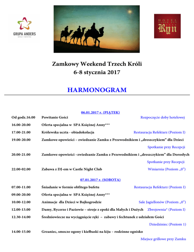 Zamkowy Weekend Trzech Króli 6-8 stycznia 2017 HARMONOGRAM 06.01.2017 r. (PIĄTEK) Od godz.16.00 Powitanie Gości 16.00-20.00 Oferta specjalna w SPA Księżnej Anny*** 17.00-21.00 Królewska uczta - obiadokolacja 19.00-20.00 Zamkowe opowieści – zwiedzanie Zamku z Przewodnikiem i „dreszczykiem” dla Dzieci Rozpoczęcie doby hotelowej Restauracja Refektarz (Poziom I) Spotkanie przy Recepcji 20.00-21.00 Zamkowe opowieści –zwiedzanie Zamku z Przewodnikiem i „dreszczykiem” dla Dorosłych Spotkanie przy Recepcji 22.00-02.00 Zabawa z DJ-em w Castle Night Club Winiarnia (Poziom „0”) 07.01.2017 r. (SOBOTA) 07.00-11.00 Śniadanie w formie obfitego bufetu 09.00-20.00 Oferta specjalna w SPA Księżnej Anny*** 10.00-12.00 Animacje dla Dzieci w Bajkogrodzie 12.00-13.00 Damy, Rycerze i Paziowie – stroje z epoki dla Małych i Dużych 12.30-14.00 Średniowiecze na wyciągnięcie ręki – zabawy i fechtunek z udziałem Gości Restauracja Refektarz (Poziom I) Sale Jagiellonów (Poziom „0”) Zbrojownia* (Poziom I) Dziedziniec (Poziom 1) 14.00-15.00 Grzaniec, smocze ogony i kiełbaski na kiju – rodzinne ognisko Miejsce grillowe przy Zamku 15.00-17.00 Animacje dla Dzieci w Bajkogrodzie 17.00-21.00 Królewska uczta - obiadokolacja 20.00-23.00 Przyjemny dreszczyk emocji w Castle Casino** 22.00-02.00 Zabawa z DJ-em w Castle Night Club Sale Jagiellonów (Poziom „0”) Restauracja Refektarz (Poziom I) Zbrojownia* Winiarnia (Poziom „0”) 08.01.2017 r. (NIEDZIELA) 07.00-11.00 Śniadanie w formie obfitego bufetu 09.00-12.00 Oferta specjalna w SPA Księżnej Anny*** 10.00 Złociste przysmaki – Akademia Kulinarna 12.00 Zakończenie doby hotelowej Restauracja Refektarz (Poziom I) Sala Wielki Kapitularz (Poziom II) Prośba o wymeldowanie * Zbrojownia budynek naprzeciwko Zamku ** Płatne dodatkowo – 10 PLN/Osoba *** Oferta płatna dodatkowo PONADTO ZAPRASZAMY DO SKORZYSTANIA Z DODATKOWYCH ATRAKCJI : Centrum Rekreacji (w cenie pobytu) basen, sauny - czynne codziennie od 08.00-22.00 Bajkogród – Klub Malucha (w cenie pobytu) - codziennie w godz. 8.00 – 22.00 Sala Fitness - /Crossfit Room , stół do tenisa (w cenie pobytu) - codziennie 7.00-23.00 (bezpłatnie) – Budynek Zbrojowni Zbrojownia (kręgielnia, bilard) - czynne w piątek w godz. 17.00-22.00, sobota-niedziela w godz. 15.00-22.00