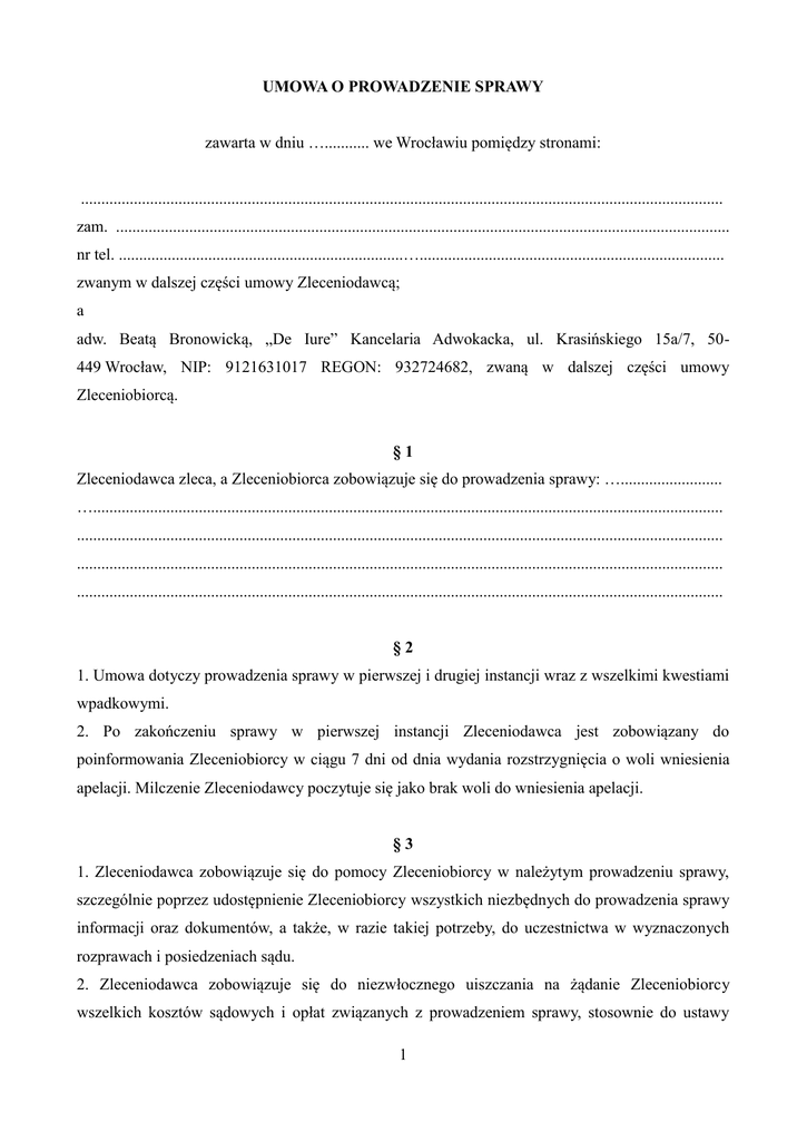 UMOWA O PROWADZENIE SPRAWY zawarta w dniu …........... we Wrocławiu pomiędzy stronami: .............................................................................................................................................................. zam. ....................................................................................................................................................... nr tel. ......................................................................…........................................................................... zwanym w dalszej części umowy Zleceniodawcą; a adw. Beatą Bronowicką, „De Iure” Kancelaria Adwokacka, ul. Krasińskiego 15a/7, 50449 Wrocław, NIP: 9121631017 REGON: 932724682, zwaną w dalszej części umowy Zleceniobiorcą. §1 Zleceniodawca zleca, a Zleceniobiorca zobowiązuje się do prowadzenia sprawy: …......................... …........................................................................................................................................................... ............................................................................................................................................................... ............................................................................................................................................................... ............................................................................................................................................................... §2 1. Umowa dotyczy prowadzenia sprawy w pierwszej i drugiej instancji wraz z wszelkimi kwestiami wpadkowymi. 2. Po zakończeniu sprawy w pierwszej instancji Zleceniodawca jest zobowiązany do poinformowania Zleceniobiorcy w ciągu 7 dni od dnia wydania rozstrzygnięcia o woli wniesienia apelacji. Milczenie Zleceniodawcy poczytuje się jako brak woli do wniesienia apelacji. §3 1. Zleceniodawca zobowiązuje się do pomocy Zleceniobiorcy w należytym prowadzeniu sprawy, szczególnie poprzez udostępnienie Zleceniobiorcy wszystkich niezbędnych do prowadzenia sprawy informacji oraz dokumentów, a także, w razie takiej potrzeby, do uczestnictwa w wyznaczonych rozprawach i posiedzeniach sądu. 2. Zleceniodawca zobowiązuje się do niezwłocznego uiszczania na żądanie Zleceniobiorcy wszelkich kosztów sądowych i opłat związanych z prowadzeniem sprawy, stosownie do ustawy 1 z dnia 28 lipca 2005 r. o kosztach sądowych w sprawach cywilnych ( Dz.U. 2005 Nr 167 poz.1398) jak również do niezwłocznego uiszczania wszelkich zaliczek i opłat związanych z prowadzeniem postępowania egzekucyjnego lub zabezpieczającego. §4 Zaniechanie lub nienależyte wykonanie przez Zleceniodawcę obowiązków określonych w § 3 uprawnia Zleceniobiorcę do wypowiedzenia umowy z zachowaniem dwutygodniowego obowiązku działania od dnia doręczenia wypowiedzenia. §5 Zleceniobiorca zobowiązuje się przy wykonywaniu niniejszego zlecenia, a także po jego wykonaniu do zachowania tajemnicy adwokackiej, której przedmiot i zakres określa Zbiór zasad etyki adwokackiej i godności zawodu (Kodeksu etyki adwokackiej) uchwalony przez Naczelną Radę Adwokacką w dniu 10 października 1998 r. (uchwała nr 2/XVIII/98) ze zmianami wprowadzonymi uchwałą Naczelnej Rady Adwokackiej nr 32/2005 z 19 listopada 2005 r. oraz uchwałami Naczelnej Rady Adwokackiej nr 33/2011 – 54/2011 z dnia 19 listopada 2011 r. §6 1. Umowa niniejsza nakłada na Zleceniobiorcę obowiązek rzetelnego działania, nie jest natomiast zobowiązaniem Zleceniobiorcy do osiągnięcia określonego celu. 2. Zleceniobiorca w realizacji swoich uprawnień i obowiązków ma prawo ustanawiać substytuta. 3. Zleceniobiorca jest uprawniony do modyfikacji (ograniczenia lub rozszerzenia) udzielonych na mocy niniejszej umowy zleceń, stosownie do konieczności wynikającej z należytego świadczenia usług. §7 1. Strony oświadczają, iż adresy podane na wstępie niniejszej Umowy są właściwymi adresami do doręczeń. Pismo wysłane na wskazany adres uważa się za doręczone, chyba że adres uprzednio zawiadomi pisemnie nadawcę o zmianie adresu do doręczeń. 2. Zleceniodawca oświadcza, że wyraża zgodę/nie wyraża zgody na kontaktowanie się Zleceniobiorcy z nim poprzez pocztę elektroniczną. Adres poczty elektronicznej zleceniodawcy do kontaktu jest następujący:...................................................................................................................... .............................................................................................................................................................. 2 §8 Zleceniodawca wyraża zgodę na przetwarzanie przez Zleceniobiorcę i podmioty z nim współpracujące danych osobowych Zleceniodawcy z zakresie niezbędnym do realizacji niniejszej umowy, stosownie do postanowień ustawy z dnia 29 sierpnia 1997 r. o ochronie danych osobowych (Dz.U.2014.1182). §9 1. Zleceniodawca zapłaci Zleceniobiorcy za realizację zlecenia opisanego w § 1 wynagrodzenie w wysokości ..............................................................................................................................zł netto (słownie: ......................................................................................................................................... zł.). 2. Do powyższej kwoty doliczony zostanie podatek VAT wedle obowiązującej stawki, płatny przez Zleceniodawcę wraz z wynagrodzeniem. 3. W przypadku uzyskania przez Zleceniobiorcę pozytywnego rozstrzygnięcia sprawy dla Zleceniodawcy strony ustalają, iż Zleceniobiorca otrzyma dodatkowe honorarium (za efekt) w postaci zasądzonych od przeciwnika procesowego przez Sąd lub organ egzekucyjny kosztów zastępstwa adwokackiego, do których prawo Zleceniodawca przenosi niniejszym na Zleceniobiorcę. 4. Wynagrodzenie, o którym mowa w pkt. 1 płatne jest jednorazowo / w ratach w następującym terminie: 