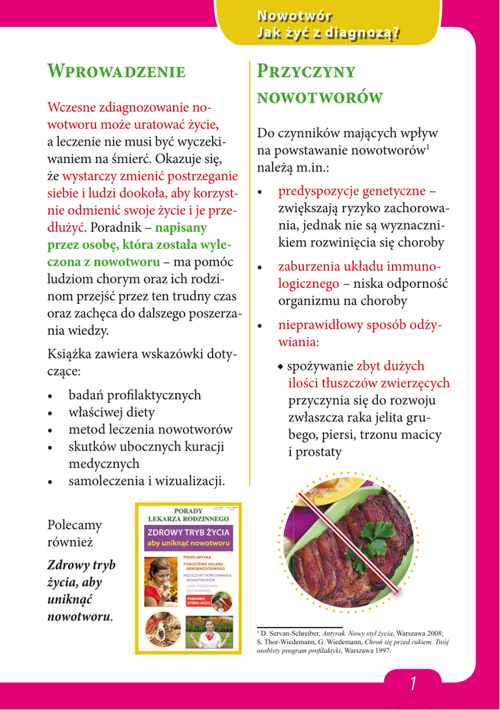 Nowotwór Jak żyć z diagnozą? Wprowadzenie Wczesne zdiagnozowanie nowotworu może uratować życie, a leczenie nie musi być wyczekiwaniem na śmierć. Okazuje się, że wystarczy zmienić postrzeganie siebie i ludzi dookoła, aby korzystnie odmienić swoje życie i je przedłużyć. Poradnik – napisany przez osobę, która została wyleczona z nowotworu – ma pomóc ludziom chorym oraz ich rodzinom przejść przez ten trudny czas oraz zachęca do dalszego poszerzania wiedzy. Książka zawiera wskazówki dotyczące: • • • • • badań profilaktycznych właściwej diety metod leczenia nowotworów skutków ubocznych kuracji medycznych samoleczenia i wizualizacji. Przyczyny nowotworów Do czynników mających wpływ na powstawanie nowotworów1 należą m.in.: • predyspozycje genetyczne – zwiększają ryzyko zachorowania, jednak nie są wyznacznikiem rozwinięcia się choroby • zaburzenia układu immunologicznego – niska odporność organizmu na choroby • nieprawidłowy sposób odżywiania: ◆ spożywanie zbyt dużych ilości tłuszczów zwierzęcych przyczynia się do rozwoju zwłaszcza raka jelita grubego, piersi, trzonu macicy i prostaty Polecamy również Zdrowy tryb życia, aby uniknąć nowotworu. 1 D. Servan-Schreiber, Antyrak. Nowy styl życia, Warszawa 2008; S. Thor-Wiedemann, G. Wiedemann, Chroń się przed rakiem. Twój osobisty program profilaktyki, Warszawa 1997. 1 Jak żyć z diagnozą? Skutki uboczne Jak sobie z nimi radzić? • Przed pierwszym podaniem chemioterapeutyku skróć włosy (możliwie najkrócej). ŁYSIENIE • Nie używaj suszarek do włosów, lakierów, wałków; nie farbuj włosów – wybieraj delikatne kosmetyki do włosów. • Zaopatrz się w twarzowe chustki i/lub perukę (dostaniesz dofinansowanie z NFZ, jeśli poprosisz lekarza prowadzącego o wypisanie wniosku). • Przed zaplanowanym leczeniem: poproś personel medyczny o lek przeciwwymiotny; kogoś bliskiego o przyrządzenie kanapek, które zabierzesz do szpitala; unikaj intensywnych zapachów i mleka; przygotuj się emocjonalnie – postaraj się opanować wymioty wywołane stresem. NUDNOŚCI I WYMIOTY • Podczas podawania leków: postaraj się nie spożywać pokarmów; unikaj silnych zapachów: jedzenia, kosmetyków, a zwłaszcza papierosów; medytuj, wizualizuj udaną kurację, głęboko oddychaj, zrelaksuj się i postaraj się opanować stres. • Po podaniu leków: unikaj silnie pachnących potraw; ogranicz spożycie dużych ilości napojów; jedz często, ale małe posiłki; pokarmy spożywaj na siedząco; jedz posiłki lekkostrawne; pij wolno herbaty ziołowe, wodę, rosół. • Unikaj silnie pachnących kosmetyków, środków czyszczących i piorących; najlepiej zaopatrz się w produkty dla alergików, bezwonne. • Wietrz często mieszkanie i spaceruj na świeżym powietrzu. 14 Jak żyć z diagnozą? Nowa szansa Co jeść, a czego unikać? spożywaj Produkty o niskim IG, np.: • Naturalne ekstrakty słodzące, np. syrop z agawy, kwas aminooctowy (glicyna), cukier brzozowy, czarna czekolada (powyżej 70% zawartości kakao) itd. • Zboża pełne i mieszane, pieczywo wieloziarniste robione na tradycyjnym zakwasie, ryż niełuskany i basmati, kluski i makarony al dente oraz pełnoziarniste, jęczmień, proso, gryka itd. • Bataty, soczewica, groch, fasola, płatki owsiane, muesli, płatki śniadaniowe bez cukru itd. • Surowe owoce, zwłaszcza jagody, wiśnie, maliny, które pomagają w uregulowaniu poziomu cukru itd. • Woda z cytryną lub tymiankiem, szałwią, skórką pomarańczy lub mandarynki ekologicznej, zielona herbata (bez cukru), sok wyciśnięty z owoców itd. 18 unikaj Produktów o wysokim IG, np.: • Cukier biały i brązowy, miód, słodycze, cukierki, żelki, lody itd. • Mąka pszenna, jasne pieczywo, makaron (zbyt długo gotowany), ryż oczyszczony, płatki pszenne, chałka, słodkie pieczywo, placki ryżowe itd. • Ziemniaki, frytki, chipsy, płatki kukurydziane, ryż dmuchany, większość mieszanek śniadaniowych itd. • Margaryna, ciastka, ciasta, herbatniki, muesli crunchy, krakersy, chrupki, zupy w proszku, wszelkie fast foody, gofry lub omlety na margarynie, pączki, faworki itd.