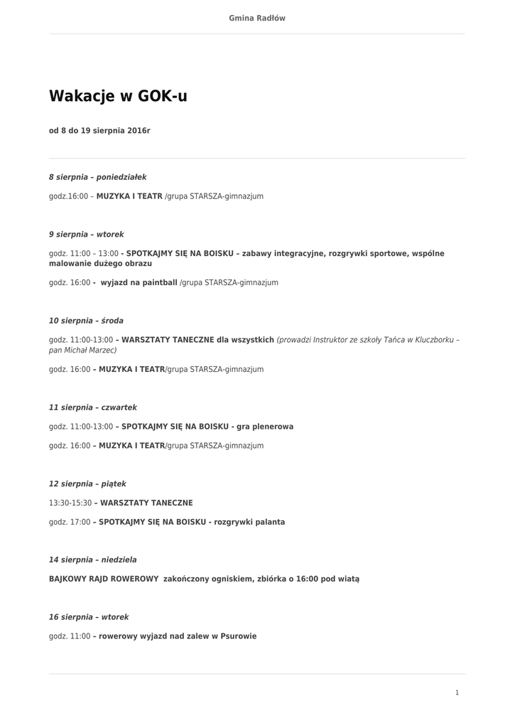 Gmina Radłów Wakacje w GOK-u od 8 do 19 sierpnia 2016r 8 sierpnia – poniedziałek godz.16:00 – MUZYKA I TEATR /grupa STARSZA-gimnazjum 9 sierpnia – wtorek godz. 11:00 – 13:00 - SPOTKAJMY SIĘ NA BOISKU – zabawy integracyjne, rozgrywki sportowe, wspólne malowanie dużego obrazu godz. 16:00 - wyjazd na paintball /grupa STARSZA-gimnazjum 10 sierpnia – środa godz. 11:00-13:00 – WARSZTATY TANECZNE dla wszystkich (prowadzi Instruktor ze szkoły Tańca w Kluczborku – pan Michał Marzec) godz. 16:00 – MUZYKA I TEATR/grupa STARSZA-gimnazjum 11 sierpnia – czwartek godz. 11:00-13:00 – SPOTKAJMY SIĘ NA BOISKU - gra plenerowa godz. 16:00 – MUZYKA I TEATR/grupa STARSZA-gimnazjum 12 sierpnia – piątek 13:30-15:30 – WARSZTATY TANECZNE godz. 17:00 – SPOTKAJMY SIĘ NA BOISKU - rozgrywki palanta 14 sierpnia – niedziela BAJKOWY RAJD ROWEROWY zakończony ogniskiem, zbiórka o 16:00 pod wiatą 16 sierpnia – wtorek godz. 11:00 – rowerowy wyjazd nad zalew w Psurowie 1 Gmina Radłów – BUDUJEMY SZAŁASY, na zakończenie ognisko i kiełbaski /grupa 8+ 17 sierpnia – środa godz. 11:00-13:00 – WARSZTATY TANECZNE godz. 16:00 – SPOTKAJMY SIĘ NA BOISKU/robimy latawce, latawcowy turniej 18 sierpnia – czwartek godz.11:00-13:00 – ARTYŚCI TO MY - zdobienie deseczek-wizytówek metodą decoupage godz.16:00 – MUZYKA I TEATR/grupa STARSZA-gimnazjum 19 sierpnia – piątek godz. 13:30-15:30 WARSZTATY TANECZNE Zapraszamy - GOK Radłów wszystkie zajęcia są bezpłatne 2