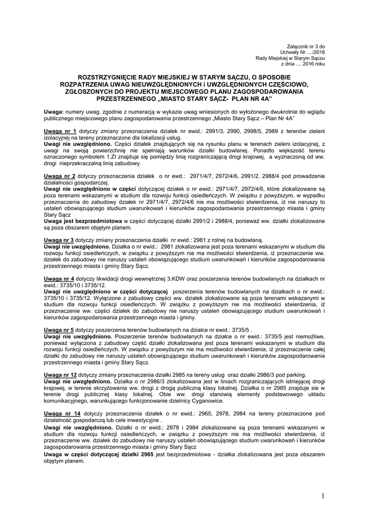 Załącznik nr 3 do Uchwały Nr ..../2016 Rady Miejskiej w Starym Sączu z dnia .... 2016 roku ROZSTRZYGNIĘCIE RADY MIEJSKIEJ W STARYM SĄCZU, O SPOSOBIE ROZPATRZENIA UWAG NIEUWZGLĘDNIONYCH i UWZGLĘDNIONYCH CZĘŚCIOWO, ZGŁOSZONYCH DO PROJEKTU MIEJSCOWEGO PLANU ZAGOSPODAROWANIA PRZESTRZENNEGO „MIASTO STARY SĄCZ- PLAN NR 4A” Uwaga: numery uwag, zgodnie z numeracją w wykazie uwag wniesionych do wyłożonego dwukrotnie do wglądu publicznego miejscowego planu zagospodarowania przestrzennego „Miasto Stary Sącz – Plan Nr 4A” Uwaga nr 1 dotyczy zmiany przeznaczenia działek nr ewid.: 2991/3, 2990, 2998/5, 2989 z terenów zieleni izolacyjnej na tereny przeznaczone dla lokalizacji usług. Uwagi nie uwzględniono. Części działek znajdujących się na rysunku planu w terenach zieleni izolacyjnej, z uwagi na swoją powierzchnię nie spełniają warunków działki budowlanej. Ponadto większość terenu oznaczonego symbolem 1.ZI znajduje się pomiędzy linią rozgraniczającą drogi krajowej, a wyznaczoną od ww. drogi nieprzekraczalną linią zabudowy. Uwaga nr 2 dotyczy przeznaczenia działek o nr ewd.: 2971/4/7, 2972/4/6, 2991/2, 2988/4 pod prowadzenie działalności gospodarczej. Uwagi nie uwzględniono w części dotyczącej działek o nr ewid.: 2971/4/7, 2972/4/6, które zlokalizowane są poza terenami wskazanymi w studium dla rozwoju funkcji osiedleńczych. W związku z powyższym, w wypadku przeznaczenia do zabudowy działek nr 2971/4/7, 2972/4/6 nie ma możliwości stwierdzenia, iż nie naruszy to ustaleń obowiązującego studium uwarunkowań i kierunków zagospodarowania przestrzennego miasta i gminy Stary Sącz Uwaga jest bezprzedmiotowa w części dotyczącej działki 2991/2 i 2988/4, ponieważ ww. działki zlokalizowane są poza obszarem objętym planem. Uwaga nr 3 dotyczy zmiany przeznaczenia działki nr ewid.: 2981 z rolnej na budowlaną. Uwagi nie uwzględniono. Działka o nr ewid.: 2981 zlokalizowana jest poza terenami wskazanymi w studium dla rozwoju funkcji osiedleńczych, w związku z powyższym nie ma możliwości stwierdzenia, iż przeznaczenie ww. działek do zabudowy nie naruszy ustaleń obowiązującego studium uwarunkowań i kierunków zagospodarowania przestrzennego miasta i gminy Stary Sącz. Uwaga nr 4 dotyczy likwidacji drogi wewnętrznej 3.KDW oraz poszerzenia terenów budowlanych na działkach nr ewid.: 3735/10 i 3735/12. Uwagi nie uwzględniono w części dotyczącej poszerzenia terenów budowlanych na działkach o nr ewid.: 3735/10 i 3735/12. Wyłączone z zabudowy części ww. działek zlokalizowane są poza terenami wskazanymi w studium dla rozwoju funkcji osiedleńczych. W związku z powyższym nie ma możliwości stwierdzenia, iż przeznaczenie ww. części działek do zabudowy nie naruszy ustaleń obowiązującego studium uwarunkowań i kierunków zagospodarowania przestrzennego miasta i gminy. Uwaga nr 5 dotyczy poszerzenia terenów budowlanych na działce nr ewid.: 3735/5 . Uwagi nie uwzględniono. Poszerzenie terenów budowlanych na działce o nr ewid.: 3735/5 jest niemożliwe, ponieważ wyłączona z zabudowy część działki zlokalizowana jest poza terenami wskazanymi w studium dla rozwoju funkcji osiedleńczych. W związku z powyższym nie ma możliwości stwierdzenia, iż przeznaczenie całej działki do zabudowy nie naruszy ustaleń obowiązującego studium uwarunkowań i kierunków zagospodarowania przestrzennego miasta i gminy Stary Sącz. Uwaga nr 12 dotyczy zmiany przeznaczenia działki 2985 na tereny usług oraz działki 2986/3 pod parking. Uwagi nie uwzględniono. Działka o nr 2986/3 zlokalizowana jest w liniach rozgraniczających istniejącej drogi krajowej, w terenie skrzyżowania ww. drogi z drogą publiczną klasy lokalnej. Działka o nr 2985 znajduje sie w terenie drogi publicznej klasy lokalnej. Obie ww. drogi stanowią elementy podstawowego układu komunikacyjnego, warunkującego funkcjonowanie dzielnicy Cyganowice. Uwaga nr 14 dotyczy przeznaczenia działek o nr ewid.: 2965, 2978, 2984 na tereny przeznaczone pod działalność gospodarczą lub cele inwestycyjne . Uwagi nie uwzględniono. Działki o nr ewid.: 2978 i 2984 zlokalizowane są poza terenami wskazanymi w studium dla rozwoju funkcji osiedleńczych, w związku z powyższym nie ma możliwości stwierdzenia, iż przeznaczenie ww. działek do zabudowy nie naruszy ustaleń obowiązującego studium uwarunkowań i kierunków zagospodarowania przestrzennego miasta i gminy Stary Sącz Uwaga w części dotyczącej działki 2965 jest bezprzedmiotowa - działka zlokalizowana jest poza obszarem objętym planem. 1