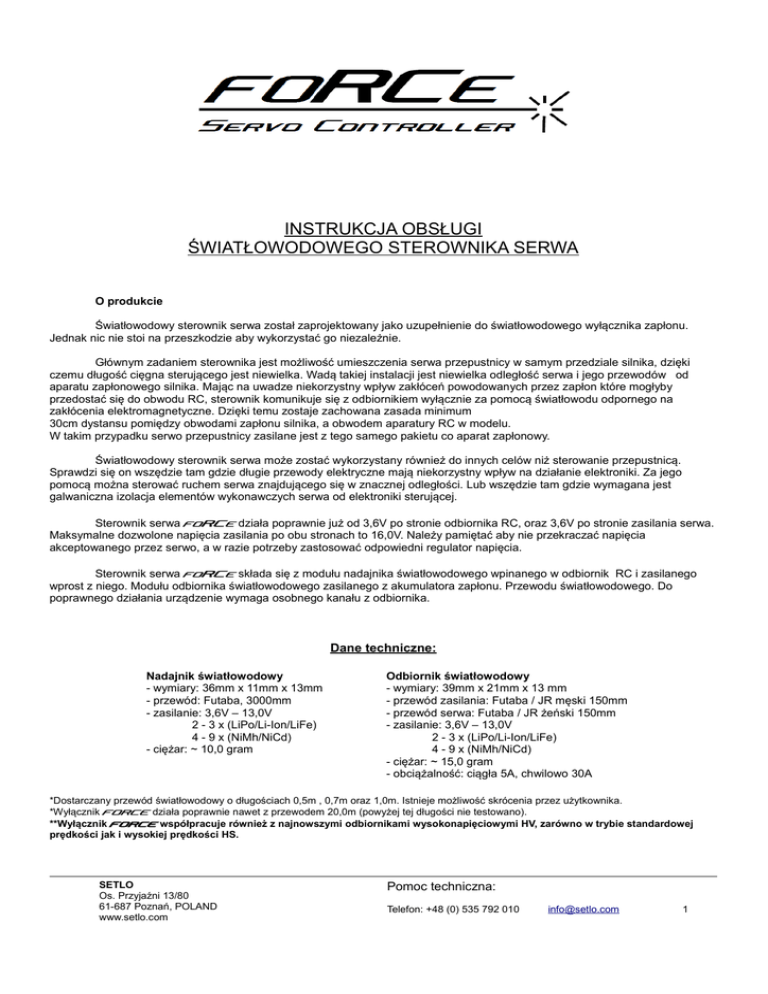 INSTRUKCJA OBSŁUGI ŚWIATŁOWODOWEGO STEROWNIKA SERWA O produkcie Światłowodowy sterownik serwa został zaprojektowany jako uzupełnienie do światłowodowego wyłącznika zapłonu. Jednak nic nie stoi na przeszkodzie aby wykorzystać go niezależnie. Głównym zadaniem sterownika jest możliwość umieszczenia serwa przepustnicy w samym przedziale silnika, dzięki czemu długość cięgna sterującego jest niewielka. Wadą takiej instalacji jest niewielka odległość serwa i jego przewodów od aparatu zapłonowego silnika. Mając na uwadze niekorzystny wpływ zakłóceń powodowanych przez zapłon które mogłyby przedostać się do obwodu RC, sterownik komunikuje się z odbiornikiem wyłącznie za pomocą światłowodu odpornego na zakłócenia elektromagnetyczne. Dzięki temu zostaje zachowana zasada minimum 30cm dystansu pomiędzy obwodami zapłonu silnika, a obwodem aparatury RC w modelu. W takim przypadku serwo przepustnicy zasilane jest z tego samego pakietu co aparat zapłonowy. Światłowodowy sterownik serwa może zostać wykorzystany również do innych celów niż sterowanie przepustnicą. Sprawdzi się on wszędzie tam gdzie długie przewody elektryczne mają niekorzystny wpływ na działanie elektroniki. Za jego pomocą można sterować ruchem serwa znajdującego się w znacznej odległości. Lub wszędzie tam gdzie wymagana jest galwaniczna izolacja elementów wykonawczych serwa od elektroniki sterującej. Sterownik serwa FORCE działa poprawnie już od 3,6V po stronie odbiornika RC, oraz 3,6V po stronie zasilania serwa. Maksymalne dozwolone napięcia zasilania po obu stronach to 16,0V. Należy pamiętać aby nie przekraczać napięcia akceptowanego przez serwo, a w razie potrzeby zastosować odpowiedni regulator napięcia. Sterownik serwa FORCE składa się z modułu nadajnika światłowodowego wpinanego w odbiornik RC i zasilanego wprost z niego. Modułu odbiornika światłowodowego zasilanego z akumulatora zapłonu. Przewodu światłowodowego. Do poprawnego działania urządzenie wymaga osobnego kanału z odbiornika. Dane techniczne: Nadajnik światłowodowy - wymiary: 36mm x 11mm x 13mm - przewód: Futaba, 3000mm - zasilanie: 3,6V – 13,0V 2 - 3 x (LiPo/Li-Ion/LiFe) 4 - 9 x (NiMh/NiCd) - ciężar: ~ 10,0 gram Odbiornik światłowodowy - wymiary: 39mm x 21mm x 13 mm - przewód zasilania: Futaba / JR męski 150mm - przewód serwa: Futaba / JR żeński 150mm - zasilanie: 3,6V – 13,0V 2 - 3 x (LiPo/Li-Ion/LiFe) 4 - 9 x (NiMh/NiCd) - ciężar: ~ 15,0 gram - obciążalność: ciągła 5A, chwilowo 30A *Dostarczany przewód światłowodowy o długościach 0,5m , 0,7m oraz 1,0m. Istnieje możliwość skrócenia przez użytkownika. *Wyłącznik FORCE działa poprawnie nawet z przewodem 20,0m (powyżej tej długości nie testowano). **Wyłącznik FORCE współpracuje również z najnowszymi odbiornikami wysokonapięciowymi HV, zarówno w trybie standardowej prędkości jak i wysokiej prędkości HS. SETLO Os. Przyjaźni 13/80 61-687 Poznań, POLAND www.setlo.com Pomoc techniczna: Telefon: +48 (0) 535 792 010 [email protected] 1 Instalacja urządzenia Urządzenie należy zainstalować wewnątrz kadłuba modelu. Nadajnik światłowodowy z opisem RCVR instalowany jest w pobliżu odbiornika RC oraz wpinany w jego wolny kanał (w przypadku gdy ma sterować serwem przepustnicy – kanał 3). Odbiornik światłowodowy wraz z podłączonym do neigo serwomechanizmem może znajdować się pod maską silnika. Pomimo iż urządzenie jest odporne na wibracje, w miarę możliwości należy je zainstalować na elastycznym podłożu. Odbiornik światłowodowy oraz serwo zasilane są z baterii zapłonu (wejście z opisem BAT) i instalowany jest zaraz za wyłącznikiem mechanicznym z lub bez stabilizatora napięcia. Stabilizator napięcia należy zastosować jeśli poziom napięcia baterii jest wyższy niż dopuszczalne napięcia zasilania serwa lub sterownika FORCE. Stabilizator może być zainstalowany zarówno przed jak i za sterownikiem FORCE. Aby połączyć nadajnik światłowodowy z odbiornikiem światłowodowym należy. Poluzować nakrętkę zabezpieczającą na złączu światłowodowym, wsunąć pewnie przewód światłowodu do zdecydowanego oporu (w praktyce przewód wsuwa się na głębokość 17,0 mm) dokręcić nakrętkę z odpowiednim wyczuciem. Dobrym nawykiem może być oznaczenie końca przewodu np. białym kawałkiem taśmy w odległości 17,0 mm aby móc co jakiś czas skontrolować stan jego osadzenia. Przewód w razie potrzeby może zostać skrócony na żądaną długość przy pomocy ostrego noża. Należy przy tym zwrócić uwagę aby miejsce przecięcia było możliwie prostopadłe do osi przewodu. Przewód światłowodowy jest bardzo elastyczny, minimalny promień gięcia to 7,0 mm. Ponieważ głównym zadaniem wyłącznika FORCE jest separacja elektryczna obwodów odbiornika RC oraz zapłonu silnika. Należy dołożyć wszelkich starań aby pozostałe przewody elektryczne tych obwodów nie mieszały się ze sobą i były możliwie jak najdalej od siebie. Jedynym elementem łączącym oba obwody powinien być przewód światłowodowy. Pierwsze uruchomienie Podczas pierwszego uruchomienia konieczne jest przeprowadzenie kalibracji kanału w którym wpięty jest wyłącznik FORCE, analogicznie jak podczas regulacji wychyleń serwomechanizmów. Podobnie jak w przypadku standardowo podłączonego serwa, urządzenie FORCE również przekazuje do serwomechanizmu pozycję FailSafe. UWAGA!!! Pamiętaj, że stosowanie zabezpieczeń typu FORCE nie usprawiedliwia wykonania niedbałej instalacji elektrycznej. Wszystkie przewody i połączenia powinny być wykonane starannie i odpowiednio zabezpieczone. Zadaniem wyłącznika FORCE jest dodatkowe podniesienie bezpieczeństwa podczas uprawiania tego hobby, a nie omijanie lub likwidowanie błędów montażu innych elementów. Dziękujemy za zaufanie i zakup urządzenia. Jednocześnie życzymy udanych lotów i niezapomnianych chwi