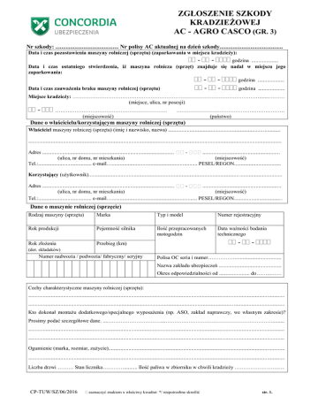 ZGŁOSZENIE SZKODY KRADZIEŻOWEJ AC - AGRO CASCO (GR. 3) Nr szkody: ........................................... Nr polisy AC aktualnej na dzień szkody........................................... Data i czas pozostawienia maszyny rolniczej (sprzętu) (zaparkowania w miejscu kradzieży): - - godzina .................... Data i czas ostatniego stwierdzenia, iż maszyna rolnicza (sprzęt) znajduje się nadal w miejscu jego zaparkowania: - - godzina - - godzina Data i czas zauważenia braku maszyny rolniczej (sprzętu) .................... .................... Miejsce kradzieży: …………………………………………………………………………………………….......……… (miejsce, ulica, nr posesji) - ……………………………………………………… (miejscowość) ……………………………………………………. (państwo) Dane o właścicielu/korzystającym maszyny rolniczej (sprzętu) Właściciel maszyny rolniczej (sprzętu) (imię i nazwisko, nazwa) .................................................................................... .............................................................................................................................................................................................. Adres ................................................................................................... .......................................................... (ulica, nr domu, nr mieszkania) (miejscowość) Tel.:........................................ e-mail…................................................................ PESEL/REGON................................... Korzystający (użytkownik)................................................................................................................. ................................ Adres ................................................................................................... ........................................................... (ulica, nr domu, nr mieszkania) (miejscowość) Tel.:........................................ e-mail…................................................................ PESEL/REGON................................... . Dane o maszynie rolniczej (sprzęcie) Rodzaj maszyny (sprzętu) Marka Typ i model Numer rejestracyjny Rok produkcji Pojemność silnika Ilość przepracowanych motogodzin Data ważności badania technicznego Rok złożenia Przebieg (km) - - (dot. składaków) Numer nadwozia / podwozia/ fabryczny/ seryjny Polisa OC seria i numer……………................................... Nazwa zakładu ubezpieczeń ............................................... Okres odpowiedzialności od ....................... do……...…… Cechy charakterystyczne maszyny rolniczej (sprzętu): ................................................................................................................................................................................................ .......................................................................................................................................................... ...................................... Kto dokonał montażu dodatkowego/specjalnego wyposażenia (np. ASO, zakład naprawczy, we własnym zakresie)? Prosimy podać szczegółowe dane. ....…………………………...……………………………………………………......... ................................................................................................................................................................................................ ................................................................................................................................................................................................ Ogumienie (marka, rozmiar, zużycie).................................................................................................................................... ................................................................................................................................................................................................ Liczba drzwi ……… Stan licznika………….......... Ilość paliwa w zbiorniku w chwili kradzieży …………………….… CP-TUW/SZ/06/2016 zaznaczyć znakiem x właściwy kwadrat */ niepotrzebne skreślić str. 1. Znaki szczególne zewnętrzne (braki wyposażenia, uszkodzenia i zarysowania, odpryski i zaprawki lakiernicze, nalepki inne – podać umiejscowienia).............................................................................................................................................. ............................................................................................................................................................................................... Znaki szczególne wewnętrzne (braki, uszkodzenia i zaplamienia wnętrza, uszkodzenia lub zarysowania wewnątrz maszyny rolniczej (sprzętu), wymienione części zamienne nietypowe dla tej marki, inne ukryte znaki szczególne) .................................................................................................................................................................. ............................. ............................................................................................................................................................................................... Czy maszyna rolnicza (sprzęt) w ostatnim okresie przed szkodą była w warsztacie? Jeżeli TAK, to w jakim warsztacie i w jakim zakresie wykonywano usługę?.............................................................................................................................. ............................................................................................................................................................................................