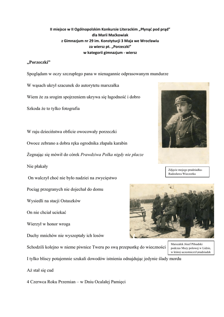 II miejsce w II Ogólnopolskim Konkursie Literackim „Płynąć pod prąd” dla Marii Maćkowiak z Gimnazjum nr 29 im. Konstytucji 3 Maja we Wrocławiu za wiersz pt. „Porzeczki” w kategorii gimnazjum - wiersz „Porzeczki” Spoglądam w oczy szczupłego pana w nienagannie odprasowanym mundurze W wąsach ukrył szacunek do autorytetu marszałka Wiem że za srogim spojrzeniem ukrywa się łagodność i dobro Szkoda że to tylko fotografia W raju dzieciństwa obficie owocowały porzeczki Owoce zebrano a dobra ręka ogrodnika złapała karabin Żegnając się mówił do córek Prawdziwa Polka nigdy nie płacze Nie płakały On walczył choć nie było nadziei na zwycięstwo Zdjęcie mojego pradziadkaRadosława Wieczorka Pociąg przegranych nie dojechał do domu Wysiedli na stacji Ostaszków On nie chciał uciekać Wierzył w honor wroga Duchy mnichów nie wyszeptały ich losów Schodzili kolejno w nieme piwnice Tweru po swą przepustkę do wieczności Marszałek Józef Piłsudski podczas Mszy polowej w Lidzie, w której uczestniczył pradziadek I tylko bliscy potajemnie szukali dowodów istnienia odnajdując jedynie ślady mordu Aż stał się cud 4 Czerwca Roku Przemian – w Dniu Ocalałej Pamięci Urosły pomniki A w czekające na miłość ręce dzieci i żon - matki już umarłyWłożono dziurawe czaszki Znowu owocowały porzeczki Kartki z Ostaszkowa napisane przez pradziadka Lista zamordowanych więźniów Ostaszkowa Informacja o losach pradziadka