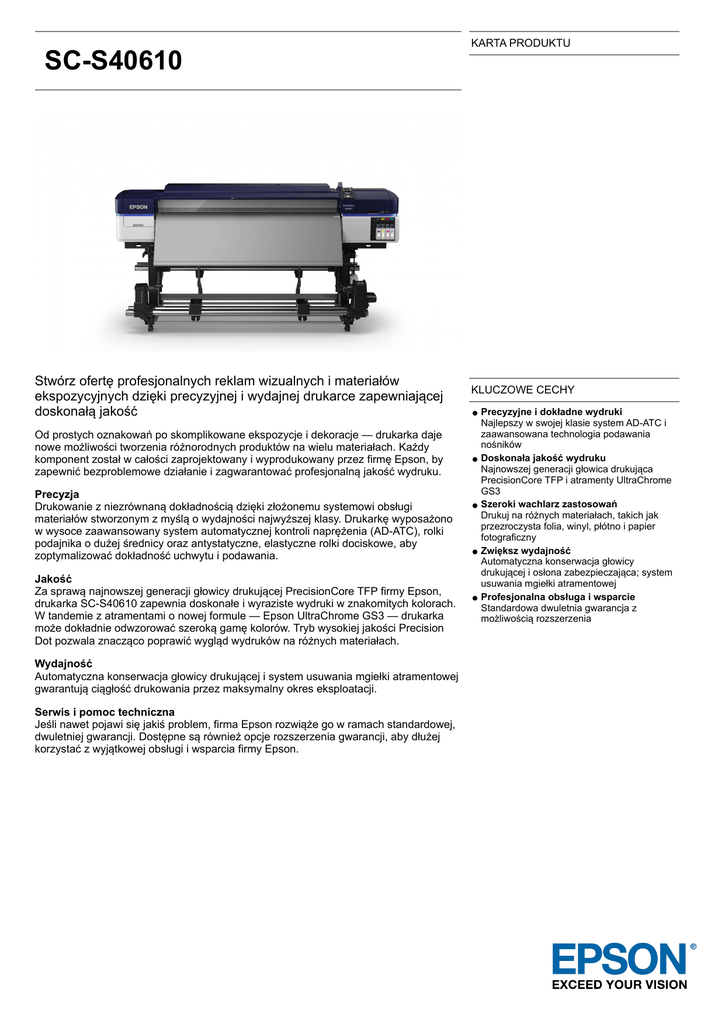 KARTA PRODUKTU SC-S40610 Stwórz ofertę profesjonalnych reklam wizualnych i materiałów ekspozycyjnych dzięki precyzyjnej i wydajnej drukarce zapewniającej doskonałą jakość Od prostych oznakowań po skomplikowane ekspozycje i dekoracje — drukarka daje nowe możliwości tworzenia różnorodnych produktów na wielu materiałach. Każdy komponent został w całości zaprojektowany i wyprodukowany przez firmę Epson, by zapewnić bezproblemowe działanie i zagwarantować profesjonalną jakość wydruku. Precyzja Drukowanie z niezrównaną dokładnością dzięki złożonemu systemowi obsługi materiałów stworzonym z myślą o wydajności najwyższej klasy. Drukarkę wyposażono w wysoce zaawansowany system automatycznej kontroli naprężenia (AD-ATC), rolki podajnika o dużej średnicy oraz antystatyczne, elastyczne rolki dociskowe, aby zoptymalizować dokładność uchwytu i podawania. Jakość Za sprawą najnowszej generacji głowicy drukującej PrecisionCore TFP firmy Epson, drukarka SC-S40610 zapewnia doskonałe i wyraziste wydruki w znakomitych kolorach. W tandemie z atramentami o nowej formule — Epson UltraChrome GS3 — drukarka może dokładnie odwzorować szeroką gamę kolorów. Tryb wysokiej jakości Precision Dot pozwala znacząco poprawić wygląd wydruków na różnych materiałach. Wydajność Automatyczna konserwacja głowicy drukującej i system usuwania mgiełki atramentowej gwarantują ciągłość drukowania przez maksymalny okres eksploatacji. Serwis i pomoc techniczna Jeśli nawet pojawi się jakiś problem, firma Epson rozwiąże go w ramach standardowej, dwuletniej gwarancji. Dostępne są również opcje rozszerzenia gwarancji, aby dłużej korzystać z wyjątkowej obsługi i wsparcia firmy Epson. KLUCZOWE CECHY Precyzyjne i dokładne wydruki Najlepszy w swojej klasie system AD-ATC i zaawansowana technologia podawania nośników Doskonała jakość wydruku Najnowszej generacji głowica drukująca PrecisionCore TFP i atramenty UltraChrome GS3 Szeroki wachlarz zastosowań Drukuj na różnych materiałach, takich jak przezroczysta folia, winyl, płótno i papier fotograficzny Zwiększ wydajność Automatyczna konserwacja głowicy drukującej i osłona zabezpieczająca; system usuwania mgiełki atramentowej Profesjonalna obsługa i wsparcie Standardowa dwuletnia gwarancja z możliwością rozszerzenia SPECYFIKACJE PRODUKTU SC-S40610 TECHNIKA Technologia tuszów ZAWARTOŚĆ ZESTAWU Ultrachrome® GS3 DRUKOWANIE Kolory Magenta, Żółty, Cyjan, Czarny Konfiguracja dysz 360 dysz czarnych, 360 dysz na kolor Pojemność wkładów z 700 ml atramentem Minimalna wielkość kropel 4,2 pl, Z technologią kropli o zmiennej wielkości OBSŁUGA PAPIERU / NOŚNIKÓW Marginesy drukowania na Tryb 1: 5 mm (górny), 3 mm (prawy), 5 mm (dolny), 3 mm (lewy) nośniku ciągłym w rolce Dokumenty gwarancyjne Instrukcja obsługi Instrukcja montażu Kabel zasilający Urządzenie podstawowe Instalacja / Podręcznik bezpieczeństwa Pojedyncze wkłady atramentowe Sterowniki i programy pomocnicze (CD) Odpowiednia grubość papieru 0,1 mm - 1 mm Formaty papieru MATERIAŁY EKSPLOATACYJNE 64" (162,6 cm) INFORMACJE OGÓLNE Zużycie energii 480 W, 330 W (tryb ekonomiczny), 12 W (w trybie czuwania), 1,5 W (wyłączyć) Napięcie zasilania AC 100 V - 240 V,50 Hz - 60 Hz Wymiary produktu 2.620 x 1.090 x 1.338 mm (Szerokość x Głębokość x Wysokość) Waga produktu 279 kg Emisja hałasu Praca: 7,4 B (A) Poziom hałasu Praca: 59 dB (A) - w trybie czuwania: 7,4 dB (A) INNE FUNKCJE Pamięć Drukarka: 512 MB, Sieć: 128 MB System konserwacji Automatyczne wycieraczki do wilgotnych tkanin Maintenance Parts Kit S210044 (C13S210044) Singlepack UltraChrome GS3 Black T891100 (700mL) (C13T891100) Singlepack UltraChrome GS3 Cyan T891200 (700mL) (C13T891200) Singlepack UltraChrome GS3 Magenta T891300 (700mL) (C13T891300) Singlepack UltraChrome GS3 Yellow T891400 (700mL) (C13T891400) Ink Cleaner (250mL) T699300 (C13T699300) Singlepack Cleaning Cartridge T696000 (C13T696000) Waste ink bottle (C13T724000) Cleaning Stick S090013 (50 pcs) (C13S090013) INNE Przetwarzanie nośników Automatyczna nawijarka OPCJONALNE AKCESORIA wydruku INNE Gwarancja 24 miesiące/miesięcy Serwis na miejscu Dostępne opcjonalne przedłużenie gwarancji INFORMACJA LOGISTYCZNA SKU C11CE44302A0 Kod kreskowy 8715946609249 szt. 1 Liczba jednostek Kraj pochodzenia Chiny Epson Europe B.V. Sp. z o.o. Oddział w Polsce ul. Bokserska 66 02-690 Warszawa Tel.: +48 22 375 7500 Faks: +48 22 375 7501 Infolinia: 801 64 64 53 (Opłata za połączenie wg taryfy operatora.) www.epson.pl Znaki towarowe oraz zastrzeżone znaki towarowe są własnością firmy Seiko Epson Corporation lub odpowiednich firm. Informacje o produkcie mogą ulec zmianie bez uprzedzenia. Advanced Additional Print Drying System C12C932381
