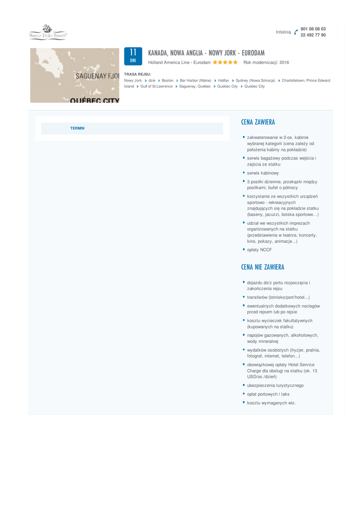 Infolinia 11 KANADA, NOWA ANGLIA - NOWY JORK - EURODAM DNI Holland America Line - Eurodam 801 08 08 03 22 492 77 90 | Rok modernizacji: 2016 TRASA REJSU: Nowy Jork Island TERMIN Boston Bar Harbor (Maine) Halifax Gulf of St.Lawrence dzie Saguenay, Quebec Quebec City Sydney (Nowa Szkocja) Charlottetown, Prince Edward Quebec City CENA ZAWIERA zakwaterowanie w 2-os. kabinie wybranej kategorii (cena zależy od położenia kabiny na pokładzie) serwis bagażowy podczas wejścia i zejścia ze statku serwis kabinowy 3 posiłki dziennie, przekąski między posiłkami, bufet o północy korzystanie ze wszystkich urządzeń sportowo - rekreacyjnych znajdujących się na pokładzie statku (baseny, jacuzzi, boiska sportowe…) udział we wszystkich imprezach organizowanych na statku (przedstawienia w teatrze, koncerty, kino, pokazy, animacje...) opłaty NCCF CENA NIE ZAWIERA dojazdu do/z portu rozpoczęcia i zakończenia rejsu transferów (lotnisko/port/hotel...) ewentualnych dodatkowych noclegów przed rejsem lub po rejsie kosztu wycieczek fakultatywnych (kupowanych na statku) napojów gazowanych, alkoholowych, wody mineralnej wydatków osobistych (fryzjer, pralnia, fotograf, internet, telefon...) obowiązkowej opłaty Hotel Service Charge dla obsługi na statku (ok. 13 USD/os./dzień) ubezpieczenia turystycznego opłat portowych i taks kosztu wymaganych wiz.