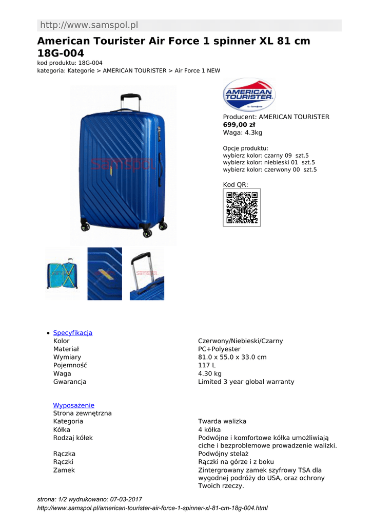 http://www.samspol.pl American Tourister Air Force 1 spinner XL 81 cm 18G-004 kod produktu: 18G-004 kategoria: Kategorie > AMERICAN TOURISTER > Air Force 1 NEW Producent: AMERICAN TOURISTER 699,00 zł Waga: 4.3kg Opcje produktu: wybierz kolor: czarny 09 szt.5 wybierz kolor: niebieski 01 szt.5 wybierz kolor: czerwony 00 szt.5 Kod QR: Specyfikacja Kolor Materiał Wymiary Pojemność Waga Gwarancja Wyposażenie Strona zewnętrzna Kategoria Kółka Rodzaj kółek Rączka Rączki Zamek Czerwony/Niebieski/Czarny PC+Polyester 81.0 x 55.0 x 33.0 cm 117 L 4.30 kg Limited 3 year global warranty Twarda walizka 4 kółka Podwójne i komfortowe kółka umożliwiają ciche i bezproblemowe prowadzenie walizki. Podwójny stelaż Rączki na górze i z boku Zintergrowany zamek szyfrowy TSA dla wygodnej podróży do USA, oraz ochrony Twoich rzeczy. strona: 1/2 wydrukowano: 07-03-2017 http://www.samspol.pl/american-tourister-air-force-1-spinner-xl-81-cm-18g-004.html Suwaki Wnętrze Organizer w formie przegródek Pasy spinające Kieszeń górna Kieszeń dolna Standardowe suwaki W górnym przedziale bagażowym, z kieszonką W dolnym przedziale bagażowym Tak strona: 2/2 wydrukowano: 07-03-2017 http://www.samspol.pl/american-tourister-air-force-1-spinner-xl-81-cm-18g-004.html