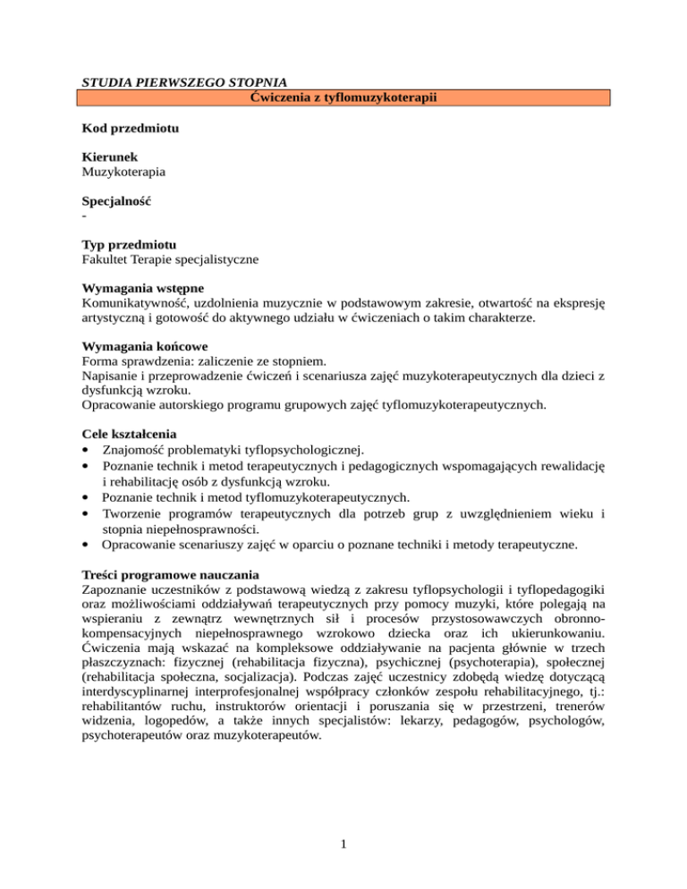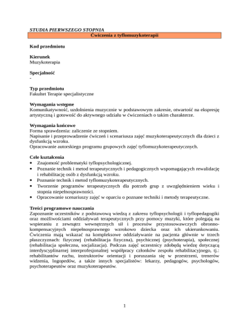 STUDIA PIERWSZEGO STOPNIA Ćwiczenia z tyflomuzykoterapii Kod przedmiotu Kierunek Muzykoterapia Specjalność Typ przedmiotu Fakultet Terapie specjalistyczne Wymagania wstępne Komunikatywność, uzdolnienia muzycznie w podstawowym zakresie, otwartość na ekspresję artystyczną i gotowość do aktywnego udziału w ćwiczeniach o takim charakterze. Wymagania końcowe Forma sprawdzenia: zaliczenie ze stopniem. Napisanie i przeprowadzenie ćwiczeń i scenariusza zajęć muzykoterapeutycznych dla dzieci z dysfunkcją wzroku. Opracowanie autorskiego programu grupowych zajęć tyflomuzykoterapeutycznych. Cele kształcenia Znajomość problematyki tyflopsychologicznej. Poznanie technik i metod terapeutycznych i pedagogicznych wspomagających rewalidację i rehabilitację osób z dysfunkcją wzroku. Poznanie technik i metod tyflomuzykoterapeutycznych. Tworzenie programów terapeutycznych dla potrzeb grup z uwzględnieniem wieku i stopnia niepełnosprawności. Opracowanie scenariuszy zajęć w oparciu o poznane techniki i metody terapeutyczne. Treści programowe nauczania Zapoznanie uczestników z podstawową wiedzą z zakresu tyflopsychologii i tyflopedagogiki oraz możliwościami oddziaływań terapeutycznych przy pomocy muzyki, które polegają na wspieraniu z zewnątrz wewnętrznych sił i procesów przystosowawczych obronnokompensacyjnych niepełnosprawnego wzrokowo dziecka oraz ich ukierunkowaniu. Ćwiczenia mają wskazać na kompleksowe oddziaływanie na pacjenta głównie w trzech płaszczyznach: fizycznej (rehabilitacja fizyczna), psychicznej (psychoterapia), społecznej (rehabilitacja społeczna, socjalizacja). Podczas zajęć uczestnicy zdobędą wiedzę dotyczącą interdyscyplinarnej interprofesjonalnej współpracy członków zespołu rehabilitacyjnego, tj.: rehabilitantów ruchu, instruktorów orientacji i poruszania się w przestrzeni, trenerów widzenia, logopedów, a także innych specjalistów: lekarzy, pedagogów, psychologów, psychoterapeutów oraz muzykoterapeutów. 1 Efekty kształcenia (uczenia się) po ukończeniu przedmiotu - w zakresie wiedzy Dysponuje wiedzą dotyczącą działań interdyscyplinarnych w kontekście tworzenia programów muzykoterapeutycznych (K1_W14). Zakres: - definiuje i charakteryzuje podstawowe pojęcia z tyflopedagogiki, tyflopsychologii, rewalidacji, tylflomuzykoterapii – wykład z prezentacją (ocena test), - zna przykłady zastosowania muzyki w rehabilitacji i pedagogice niewidomych i słabo widzących osób – prezentacja wyników pracy w grupach – Raporty grup na temat Wie o uwarunkowaniach i trudnościach związanych z funkcjonowaniem osób niepełnosprawnych fizycznie, psychicznie i intelektualnie (K1_W20), Zakres: - zna uwarunkowania i trudności z funkcjonowaniem osób z dysfunkcją wzroku (w tym szeroki wachlarz problemów związanych z adaptacją i przebiegiem uczenia się osób niewidomych i słabo widzących) - ćwiczenia z elementami dramy i wykład-esej. Zna podstawowe zasady funkcjonowania narządów i systemów organizmu człowieka (K1_W24) zakres: - zna podstawowe zasady funkcjonowania narządu wzroku oraz rodzaje dysfunkcji wzrokowych - wykład z ćwiczeniami i z prezentacją (ocena test). - w zakresie umiejętności Potrafi scharakteryzować poszczególne etapy rozwoju człowieka z uwzględnieniem ich specyfiki od okresu prenatalnego po senioralny.(K1_U24). Zakres: - potrafi scharakteryzować poszczególne etapy rozwoju człowieka z uwzględnieniem wpływu dysfunkcji wzroku na przebieg tego rozwoju – prezentacja pracy w grupach w formie raportu. Ma umiejętności adaptacji działań z zakresu rytmiki, logorytmiki, choreoterapii, elementów dramy na potrzeby muzykoterapii (K1_U06). Zakres: - adaptuje działania z zakresu rytmiki, logorytmiki, dramy, bajkoterapii na potrzeby tyflomuzykoterapii z uwzględnieniem specyfiki funkcjonowania oraz potrzeb osób z dysfunkcją wzroku – opracowanie zestawu ćwiczeń muzykoterapeutycznych. Potrafi prawidłowo zaplanować program terapeutyczny dla określonej grupy zaburzeń i tworzyć nowe techniki muzykoterapeutyczne (K1_U08). Zakres: - potrafi prawidłowo zaplanować warsztaty integracyjne oraz tyflomuzykoterapeutyczne na potrzeby różnorodnych wiekowo grup z wykorzystaniem poznanych technik muzykoterapeutycznych – opracowanie i przeprowadzenie scenariusza zajęć z zastosowanie bajki muzycznej z elementami improwizacji. - w zakresie kompetencji społecznych Potrafi zorganizować własne działania muzykoterapeutyczne (K1_K09). Posiada zdolność samooceny i umiejętność identyfikowania słabych stron oraz własnych atutów (K1_K11). Zakres: - potrafi w oparciu o analizę własnych zasobów skonstruować autorski program tylomuzykoterapeutyczny – opracowanie autorskiego programu tyflomuzykoterapeutycznego. 2 Metody nauczania Ćwiczenia. Metody eksponujące - pokaz połączony z przeżyciem. Metody podające - prezentacja multimedialna Metody podające - wykład informacyjny. Metody problemowe - metody aktywizujące - dyskusja dydaktyczna. Metody problemowe - metody aktywizujące – inscenizacja. Metody problemowe - wykład konwersatoryjny. Nakład pracy studenta potrzebny do osiągnięcia efektów uczenia się ROK SEMESTR I 1 II 2 3 III 4 Punkty ECTS Ilość godzin w semestrze Rodzaj zaliczenia LEGENDA 5 6 3 3 15 15 Zal Zs zal – zaliczony; zs – zaliczenie ze stopniem; egz – egzamin; ed – egzamin dyplomowy Kryteria oceny Test dotyczący podstawowych pojęć z tyflopedagogiki, tyflopsychologii, rewalidacji, tylflomuzykoterapii oraz podstawowych zasad funkcjonowania narządu wzroku oraz rodzajów dysfunkcji wzrokowych. Raporty dotyczące przykładów zastosowania muzyki w rehabilitacji i pedagogice niewidomych i słabo widzących osób oraz charakterystyki poszczególnych etapów rozwoju człowieka z uwzględnieniem wpływu dysfunkcji wzroku na przebieg tego rozwoju. Esej dotyczący uwarunkowań i trudności z funkcjonowaniem osób z dysfunkcją wzroku. Opracowanie