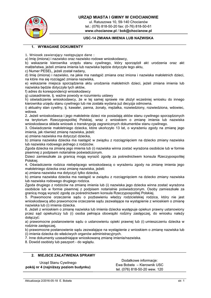 URZĄD MIASTA I GMINY W CHOCIANOWIE ul. Ratuszowa 10, 59-140 Chocianów tel.: (076) 818-50-20 fax: (0-76) 818-50-61 www.chocianow.pl / [email protected] USC-14 ZMIANA IMIENIA LUB NAZWISKA 1. WYMAGANE DOKUMENTY 1. Wniosek zawierający następujące dane : a) Imię (imiona) i nazwisko oraz nazwisko rodowe wnioskodawcy, b) wskazanie kierownika urzędu stanu cywilnego, który sporządził akt urodzenia oraz akt małżeństwa, jeżeli zmiana imienia lub nazwiska będzie dotyczyła tego aktu, c) Numer PESEL, jeżeli został nadany, d) Imię (imiona) i nazwisko, na jakie ma nastąpić zmiana oraz imiona i nazwiska małoletnich dzieci, na które ma się rozciągać zmiana nazwiska, e) wskazanie miejsca sporządzenia aktu urodzenia małoletnich dzieci, jeżeli zmiana imienia lub nazwiska będzie dotyczyła tych aktów, f) adres do korespondencji wnioskodawcy g) uzasadnienie, tj. ważne powody w rozumieniu ustawy h) oświadczenie wnioskodawcy, że w tej samej sprawie nie złożył wcześniej wniosku do innego kierownika urzędu stanu cywilnego lub nie została wydana już decyzja odmowna. i) aktualny stan cywilny, tj. kawaler, panna, żonaty, mężatka, rozwiedziony, rozwiedziona, wdowiec, wdowa. 2. Jeżeli wnioskodawca i jego małoletnie dzieci nie posiadają aktów stanu cywilnego sporządzonych na terytorium Rzeczypospolitej Polskiej, wraz z wnioskiem o zmianę imienia lub nazwiska wnioskodawca składa wniosek o transkrypcję zagranicznych dokumentów stanu cywilnego. 3. Oświadczenie małoletniego dziecka, które ukończyło 13 lat, o wyrażeniu zgody na zmianę jego imienia, jak również zmianę nazwiska, jeżeli: a) zmiana nazwiska ma dotyczyć dziecka, b) zmiana nazwiska dziecka ma nastąpić w związku z rozciągnięciem na dziecko zmiany nazwiska lub nazwiska rodowego jednego z rodziców. Zgoda dziecka na zmianę jego imienia lub (i) nazwiska winna zostać wyrażona osobiście lub w formie pisemnej z podpisem notarialnie poświadczonym. Dzieci zamieszkałe za granicą mogą wyrazić zgodę za pośrednictwem konsula Rzeczypospolitej Polskiej. 4. Oświadczenie rodzica niebędącego wnioskodawcą o wyrażeniu zgody na zmianę imienia jego małoletniego dziecka oraz zmianę nazwiska, jeżeli: a) zmiana nazwiska ma dotyczyć tylko dziecka, b) zmiana nazwiska dziecka ma nastąpić w związku z rozciągnięciem na dziecko zmiany nazwiska lub nazwiska rodowego drugiego rodzica. Zgoda drugiego z rodziców na zmianę imienia lub (i) nazwiska jego dziecka winna zostać wyrażona osobiście lub w formie pisemnej z podpisem notarialnie poświadczonym. Osoby zamieszkałe za granicą mogą wyrazić zgodę za pośrednictwem konsula Rzeczypospolitej Polskiej. 5. Prawomocne orzeczenie sądu o pozbawieniu władzy rodzicielskiej rodzica, który nie jest wnioskodawcą albo prawomocne orzeczenie sądu zezwalające na wystąpienie z wnioskiem o zmianę nazwiska lub (i) imienia dziecka. 6. Jeżeli z wnioskiem o zmianę nazwiska lub imienia dziecka występuje opiekun prawny ustanowiony przez sąd opiekuńczy lub (i) osoba pełniąca obowiązki rodziny zastępczej, do wniosku należy dołączyć: a) prawomocne postanowienie sądu o ustanowieniu opieki prawnej lub (i) umieszczeniu dziecka w rodzinie zastępczej, b) prawomocne postanowienie sądu zezwalające na wystąpienie z wnioskiem o zmianę nazwiska lub (i) imienia dziecka do właściwych organów administracyjnych. 7. Inne dokumenty uzasadniające wnioskowaną zmianę imienia/nazwiska. 8. Dowód osobisty lub paszport - do wglądu. 2. MIEJSCE ZAŁATWIENIA SPRAWY Urząd Stanu Cywilnego pokój nr 4 (najniższy poziom budynku) Aktualizacja 2/2016-05-18 E. Bobeła Dodatkowe informacje: Ewa Bobeła – Kierownik USC tel. (076) 818-50-20 wew. 120 str. 1 URZĄD MIASTA I GMINY W CHOCIANOWIE ul. Ratuszowa 10, 59-140 Chocianów tel.: (076) 818-50-20 fax: (0-76) 818-50-61 www.chocianow.pl / [email protected] USC-14 ZMIANA IMIENIA LUB NAZWISKA [email protected] 3. TERMIN ZAŁATWIENIA SPRAWY Do jednego miesiąca, a w sprawach szczególnie skomplikowanych do dwóch miesięcy. 4. SPOSÓB ZAŁATWIENIA SPRAWY Decyzja o zmianie imienia lub (i) nazwiska albo decyzja odmowna o zmianie imienia lub (i) nazwiska. 5. OPŁATY 1. Opłata skarbowa za wydanie decyzji pozytywnej w sprawie zmiany imienia lub (i) nazwiska - 37,00 zł. 2. Opłata skarbowa za wydanie decyzji odmownej w sprawie zmiany imienia lub (i) nazwiska - 10,00 zł. 3. Nie podlega opłacie skarbowej dokonanie czynności urzędowej i wydanie zaświadczenia w sprawach o zmianę imienia (imion) lub nazwiska osób, którym bezprawnie je zmieniono, a także zstępnych i małżonków tych osób. 4. Zwolnione od opłaty skarbowej są osoby, które przedstawią zaświadczenie o korzystaniu ze świadczeń pomocy społecznej z powodu ubóstwa. 6. TRYB ODWOŁAWCZY Od wydanej decyzji służy stronie odwołanie do Wojewody Dolnośląskiego za pośrednictwem Kierownika Urzędu Stanu Cywilnego w Chocianowie w terminie 14 dni od dnia jej doręczenia (art. 127 § 1 i 2 oraz art. 129 § 1 i 2 Kodeksu postępowania administracyjnego). 7. DODATKOWE INFORMACJE 1. Wniosek o zmianę imienia lub (i) nazwiska mogą złożyć: a) osoby posiadające obywatelstwo polskie, b) cudzoziemcy niemający obywatelstwa żadnego państwa, jeżeli mają w Rzeczypospolitej Polskiej miejsce zamieszkania, c) cudzoziemcy, którzy uzyskali w Rzeczypospolitej Polskiej status uchodźcy. 2. Zmiany imienia lub (i) nazwiska można dokonać wyłącznie z ważnych powodów, a w szczególności gdy: wnioskodawca nosi imię lub nazwisko ośmieszające albo nielicujące z godnością człowieka, na imię lub nazwisko używane, albo które zostało bezprawnie zmienione, a także na imię lub nazwisko noszone zgodnie z przepisami prawa państwa, którego obywatelstwo również się posiada. 3. Zmiany nazwiska nie można dokonać w przypadku ubiegania się o zmianę na nazwisko historyczne, wsławione w dziedzinie kultury, nauki, działalności politycznej, społecznej albo w