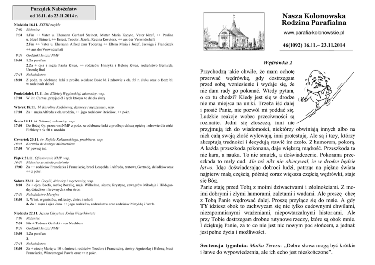 Porządek Nabożeństw od 16.11. do 23.11.2014 r. Niedziela 16.11. XXXIII zwykła 7:00 Różaniec 7:30 1.Für ++ Vater u. Ehemann Gerhard Steinert, Mutter Maria Kopyto, Vater Józef, ++ Paulina u. Józef Steinert, ++ Ernest, Teodor, Józefa, Regina Kosytorz, ++ aus der Verwndschaft 2.Für ++ Vater u. Ehemann Alfred zum Todestag ++ Eltern Maria i Józef, Jadwiga i Franciszek ++ aus der Verwndschaft 9:30 10:00 17:15 18:00 Godzinki ku czci NMP 1.Za parafian 2.Za + ojca i męża Pawła Kwas, ++ rodziców Henryka i Helenę Kwas, rodzeństwo Bernarda, Urszulę Brol Nabożeństwo Z podz. za odebrane łaski z prośba o dalsze Boże bł. i zdrowie z ok. 55 r. ślubu oraz o Boże bł. w rodzinach dzieci Poniedziałek 17.11. św. Elżbiety Węgierskiej, zakonnicy, wsp. 17:00 W int. Caritas, przyjaciół i tych którym te dzieła służą Wtorek 18.11. bł. Karoliny Kózkównej, dziewicy i męczennicy, wsp. 17:00 Za + męża Alfreda z ok. urodzin, ++ jego rodziców i teściów, ++ pokr. Środa 19.11. bł. Salomei, zakonnicy, wsp. 17:00 Do Bożej Op. przez wst NMP z podz. za odebrane łaski z prośbą o dalszą opiekę i zdrowie dla córki Elżbiety z ok 50 r. urodzin Czwartek 20.11. św. Rafała Kalinowskiego, prezbitera, wsp. 16:45 Koronka do Bożego Miłosierdzia 17:00 W pewnej int. Piątek 21.11. Ofiarowanie NMP, wsp. 16:30 Różaniec za młode pokolenie 17:00 Za ++ rodziców Franciszka i Franciszkę, braci Leopolda i Alfreda, bratową Gertrudę, dziadków oraz ++ z pokr. Sobota 22.11. św. Cecylii, dziewicy i męczennicy, wsp. 8:00 Za + ojca Józefa, matkę Rozalię, męża Wilhelma, siostrę Krystynę, szwagrów Mikołaja i Hildegardę, dziadków i krewnych z obu stron 17:30 Nabożeństwo Maryjne 18:00 1. W int. organistów, orkiestry, chóru i scholi 2. Za + męża i ojca Jana, ++ jego rodziców, rodzeństwo oraz rodziców Matyldę i Pawła Niedziela 22.11. Jezusa Chrystusa Króla Wszechświata 7:00 Różaniec 7:30 Für + Tadeusz Ociński - von Nachbarn 9:30 Godzinki ku czci NMP 10:00 1.Za parafian 2. 17:15 Nabożeństwo 18:00 Za + ciocię Marię w 10 r. śmierci, rodziców Teodora i Franciszkę, siostry Agnieszkę i Helenę, braci Franciszka, Wincentego i Pawła oraz ++ z pokr. Nasza Kolonowska Rodzina Parafialna www.parafia-kolonowskie.pl 46(1092) 16.11.– 23.11.2014 Wędrówka 2 Przychodzą takie chwile, że mam ochotę przerwać wędrówkę, gdy dostrzegam przed sobą wzniesienie i wydaje się, że nie dam rady go pokonać. Wtedy pytam, o co tu chodzi? Kiedy jest się w drodze nie ma miejsca na uniki. Trzeba iść dalej i prosić Panie, nie pozwól mi poddać się. Ludzkie reakcje wobec przeciwności są rozmaite. Jedni się złoszczą, inni nie przyjmują ich do wiadomości, niektórzy obwiniają innych albo na nich całą swoją złość wylewają, inni protestują. Ale są i tacy, którzy akceptują trudności i decydują stawić im czoło. Z humorem, pokorą. A każda przeszkoda pokonana, daje większą mądrość. Przeszkoda to nie kara, a nauka. To nie smutek, a doświadczenie. Pokonana przeszkoda to mały cud. Ale też nikt nie obiecywał, że w drodze będzie łatwo. Idąc doświadczając dobroci ludzi, patrząc na piękno świata najpierw małą częścią, później coraz większa częścią wędrówki, staje się Bóg. Panie staję przed Tobą z moimi dziwactwami i zdolnościami. Z moimi dobrymi i złymi humorami, zaletami i wadami. Ale proszę chcę z Tobą Panie wędrować dalej. Proszę przyłącz się do mnie. A gdy TY idziesz obok to zachwycam się nie tylko cudownymi chwilami, niezapomnianymi wrażeniami, niepowtarzalnymi historiami. Ale przy Tobie dostrzegam drobne rutynowe rzeczy, które są obok mnie. I dziękuję Panie, za to co nie jest nic nowym pod słońcem, a jednak jest pełne życia i możliwości. Sentencja tygodnia: Matka Teresa: „Dobre słowa mogą być krótkie i łatwe do wypowiedzenia, ale ich echo jest nieskończone”. 46/2014 Szlachetna paczka! Świat, w którym przyszło nam żyć, to coraz częściej świat bogactwa i biedy – dwóch przeciwstawnych biegunów. Bogactwo błyszczy, bezgłośnie dopomina się podziwu, jest wystawione jak towar w sklepowych witrynach – kolorowe, duże, z rozmachem, pozłacane. Bieda jest skromna, nie skarży się, bieda schodzi z drogi, wstydzi się samej siebie, nieraz nic nie może poradzić na to, co jest jej udziałem. Przygarbiona, postarzała, niemająca w sobie nic spektakularnego. Jest. Drodzy mieszkańcy Kolonowskiego i okolic, wolontariusze i młodzież Publicznego Gimnazjum w Kolonowskiem, zasilona autorytetem i charyzmą naszego księdza proboszcza, organizuje akcję pomocy społecznej mającą na celu wsparcie rodzin najuboższych. Pomoc ta przybierze formę „szlachetnej paczki” (składać się na nią mają produkty spożywcze i słodycze bądź odzież). W założeniu ma to być gest dobrej woli, gest serc szlachetnych, trafiający pod strzechy ludzi potrzebujących. Obdarowany i darczyńca pozostaną anonimowi, a podziękowania i dobra wola staną się cegiełkami w budowli jedności społecznej i miłości, jaką stawiamy co dnia na fundamencie naszej wiary. Co zrobić, by pomóc lub pomoc otrzymać? Darczyńca zgłasza chęć udziału w akcji, podając swój nr telefonu i adres koordynatorowi. Potrzebujący dostarcza listę niezbędnych rzeczy i swój adres również tylko koordynatorowi. Komu? Kiedy? W czwartek i piątek ( 23.11, 24.11.2014 r.) pół godziny przed wieczorną mszą świętą, w salce parafialnej, zgłoszenia osób - które potrzebują pomocy lub pomoc oferują - przyjmować będzie p. Sabina Owsiak lub inna wyznaczona osoba. Zgłoszenia można również dokonać telefonicznie: nr. 536240338 lub 501331367 Kto odbierze i dostarczy paczkę? W wyznaczonym terminie darczyńcy przyniosą paczkę do salki parafialnej, a wolontariusze dostarczą przesyłkę do osób potrzebujących. Zachęcamy do udziału w akcji! Koordynatorem jest pani Alicja Feliks – pedagog szkolny. Dzisiaj Naszy