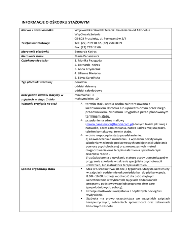 INFORMACJE O OŚRODKU STAŻOWYM Nazwa i adres ośrodka: Telefon kontaktowy: Kierownik placówki: Kierownik stażu: Opiekunowie stażu: Typ placówki stażowej Ilość godzin udziału stażysty w zajęciach w ciągu 1 dnia Warunki przyjęcia na staż Sposób organizacji stażu Wojewódzki Ośrodek Terapii Uzależnienia od Alkoholu i Współuzależnienia 05-802 Pruszków, ul. Partyzantów 2/4 Tel: (22) 739 10 32, (22) 758 68 09 Fax: (22) 739 12 66 Bernarda Kejres Maria Panasewicz 1. Monika Przygoda 2. Bernarda Kejres 3. Anna Krzyszczuk 4. Lilianna Bielecka 5. Edyta Karpińska poradnia oddział dzienny oddział całodobowy minimalnie: 8 maksymalnie: 10 termin stażu ustala osoba zainteresowana z kierownikiem Ośrodka lub upoważnionym przez niego pracownikiem. Minimum 3 tygodnie przed planowanym terminem stażu. przesłanie na adres mailowy ([email protected]) danych takich jak: imię i nazwisko, adres zamieszkania, nazwa i adres miejsca pracy, telefon kontaktowy, termin stażu. w dniu rozpoczęcia stażu przedstawienie: a) zaświadczenia o ukończeniu z wynikiem pozytywnym szkolenia w zakresie podstawowych umiejętności udzielania pomocy psychologicznej oraz nowoczesnych metod diagnozowania oraz terapii uzależnienia i psychoterapii członków rodzin , b) zaświadczenia o uzyskaniu statusu osoby uczestniczącej w programie szkolenia w zakresie specjalisty psychoterapii uzależnień, lub instruktora terapii uzależnień. Staż w Ośrodku trwa 10 dni (2 tygodnie). Stażysta uczestniczy w zajęciach codziennie od poniedziałku do piątku w godz. 8.00 - 16.00. Istnieje możliwość dla osób chętnych uczestniczenia w wybranych zajęciach dodatkowych programu podstawowego lub programu after care (popołudniowych, soboty). Istnieje możliwość skorzystania z odpłatnych noclegów i wyżywienia. Stażysta ma prawo uczestnictwa we wszystkich zajęciach terapeutycznych, zebraniach społeczności oraz zebraniach klinicznych zespołu. uczestnictwo we wszystkich zajęciach przewidzianych w programie stażu, Warunki zaliczenia stażu prowadzenie „Dziennika Stażysty”, wykazanie się umiejętnością prowadzenia grupy terapeutycznej (uczestnictwo w 8 grupach zadaniowych i w 8 grupach edukacyjnych w tym poprowadzenie 4 grup edukacyjnych i 4 grup zadaniowych pod superwizją terapeuty pracującego w Ośrodku), wykazanie się umiejętnością rozumienia pacjenta na tle grupy (przedstawienia na zebraniu klinicznym rozumienia pacjenta na tle grupy), wykazanie się umiejętnością rozumienia procesu grupowego (przedstawienia na zebraniu klinicznym rozumienia procesu grupowego), uczestnictwo co najmniej w jednych dowolnie wybranych zajęciach dodatkowych programu podstawowego, lub programu zajęć ponadpodstawowych (popołudniowych lub weekendowych), Możliwość zakwaterowania w Tak ośrodku stażowym Rodzaje zajęć, w których uczestniczy stażysta nie uczestniczy prowadzi współprowadzi obserwuje program podstawowy dla uzależnionych: diagnoza przyjęcie pacjenta do terapii tworzenie planów terapii układanie OPT sesje psychoterapii indywidualnej x x x x x sesje psychoterapii grupowej program pogłębiony dla uzależnionych tworzenie planów terapii sesje psychoterapii indywidualnej przyjęcie pacjenta do terapii tworzenie planów terapii sesje psychoterapii indywidualnej x x x x x x x x sesje psychoterapii grupowej program pogłębiony dla współuzależnionych tworzenie planów terapii x x x sesje psychoterapii grupowej program podstawowy dla współuzależnionych spotkanie diagnostyczne x x sesje psychoterapii indywidualnej sesje psychoterapii grupowej x x pozostałe x spotkania społeczności terapeutycznej prezentacja na zebraniach klinicznych zespołu sesje rodzinne program dla DDA x x x x program dla ofiar przemocy program dla sprawców przemocy program dla osób z uzależnieniem innym niż alkohol prowadzenie dokumentacji medycznej Pozostałe informacje: x x x