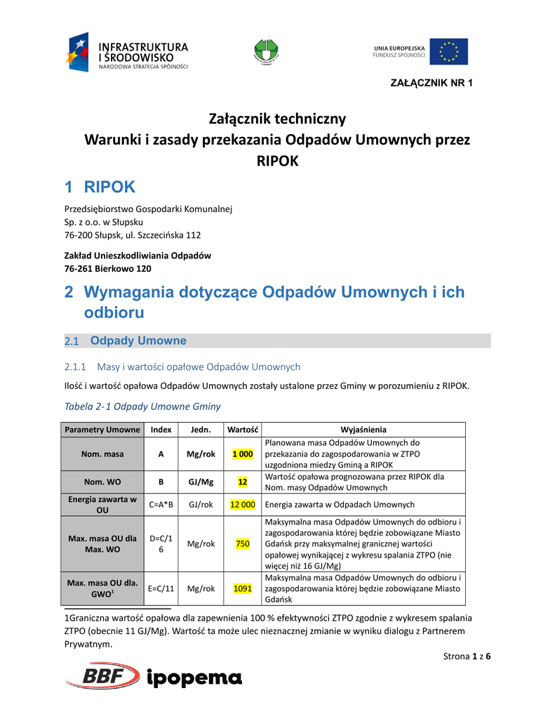 ZAŁĄCZNIK NR 1 Załącznik techniczny Warunki i zasady przekazania Odpadów Umownych przez RIPOK 1 RIPOK Przedsiębiorstwo Gospodarki Komunalnej Sp. z o.o. w Słupsku 76-200 Słupsk, ul. Szczecińska 112 Zakład Unieszkodliwiania Odpadów 76-261 Bierkowo 120 2 Wymagania dotyczące Odpadów Umownych i ich odbioru 2.1 Odpady Umowne 2.1.1 Masy i wartości opałowe Odpadów Umownych Ilość i wartość opałowa Odpadów Umownych zostały ustalone przez Gminy w porozumieniu z RIPOK. Tabela 2- 1 Odpady Umowne Gminy Parametry Umowne Index Jedn. Wartość Nom. masa A Mg/rok 1 000 Nom. WO B GJ/Mg 12 Energia zawarta w OU C=A*B GJ/rok 12 000 Max. masa OU dla Max. WO D=C/1 6 Mg/rok 750 Max. masa OU dla. GWO1 E=C/11 Mg/rok 1091 Wyjaśnienia Planowana masa Odpadów Umownych do przekazania do zagospodarowania w ZTPO uzgodniona miedzy Gminą a RIPOK Wartość opałowa prognozowana przez RIPOK dla Nom. masy Odpadów Umownych Energia zawarta w Odpadach Umownych Maksymalna masa Odpadów Umownych do odbioru i zagospodarowania której będzie zobowiązane Miasto Gdańsk przy maksymalnej granicznej wartości opałowej wynikającej z wykresu spalania ZTPO (nie więcej niż 16 GJ/Mg) Maksymalna masa Odpadów Umownych do odbioru i zagospodarowania której będzie zobowiązane Miasto Gdańsk 1Graniczna wartość opałowa dla zapewnienia 100 % efektywności ZTPO zgodnie z wykresem spalania ZTPO (obecnie 11 GJ/Mg). Wartość ta może ulec nieznacznej zmianie w wyniku dialogu z Partnerem Prywatnym. Strona 1 z 6 Min. WO F GJ/Mg 9 Minimalna dopuszczalna wartość opałowa Gdzie: OU WO Odpady Umowne Wartość Opałowa GJ/Mg 2.1.2 Inne cechy Odpadów Umownych Odpady Umowne będą wyłącznie odpadami z grupy: 19 12 12 Inne odpady (w tym zmieszane substancje i przedmioty) z mechanicznej obróbki odpadów inne niż wymienione w 19 12 11 lub 19 12 10 Odpady palne (paliwo alternatywne), zgodnie z Rozporządzeniem Ministra Środowiska z dnia 9 grudnia 2014 r. w sprawie katalogu odpadów (Dz.U. 2014 poz. 1923). Rozkład udziału dopuszczalnych wielkości elementów odpadów: 100% < 300 mm – nie dopuszcza się elementów o wielkości powyżej 300 mm, 90% < 200 mm – dopuszcza się do 10% elektów większych niż 200 mm a mniejszych niż 300 mm 98% > 10 mm – przyjmuje się że 98 % elementów będzie większa niż 10 mm. Zawartość chloru / siarki w Odpadach Umownych nie przekroczy odpowiednio dla: Chloru < 1,5% masy odpadów surowych Siarki < 1% masy odpadów surowych Minimalna zawartość popiołu i wody w odpadach to 10%. Dodatkowo zgodnie z ogólnymi kryteriami odbioru, odpady mające szkodliwe oddziaływanie na wyposażenie techniczne, środowisko oraz na osoby zatrudnione przy odbiorze odpadów są wyłączone z odbioru. Są to w szczególności: niepalne substancje i odpady, takie jak np. gleba, gruz budowlany, kamienie, piasek, popioły, żużle, wełna szklana i mineralna w większych ilościach, w szczególności partie jednolite jednolite partie np. granulki z tworzywa sztucznego, drobne pyły baterie, akumulatory, chłodziarki, telewizory, monitory komputerowe, jarzeniówki substancje podatne na samozapłon i wybuchowe zgodnie z Dyrektywą dotyczącą niebezpiecznych substancji (98/24/WE) substancje reaktywne i odgazowujące substancje łatwopalne zgodnie z europejską Dyrektywą dotyczącą niebezpiecznych substancji (98/24/WE) wyroby pirotechniczne, amunicja kwasy, ług, substancje żrące i trujące zgodnie z europejską Dyrektywą dotyczącą niebezpiecznych substancji (98/24/WE) Strona 2 z 6 substancje radioaktywne zgodnie z europejską Dyrektywą dotyczącą niebezpiecznych substancji (98/24/WE) oraz przepisami w zakresie ochrony przed promieniowaniem odpady, do których utylizacji znajdują zastosowanie odrębne normy prawne i wymagają odrębnych instalacji przetwarzania odpadów (np. tusze zwierzęce, zakaźne odpady szpitalne) leki cytotoksyczne gazy w formie zamkniętej substancje ciekłe i stałe wszelkiego rodzaju z punktem zapłonu poniżej 55°C, w szczególności łatwopalne substancje ciekłe o klasach zagrożenia A1, A2, B zgodnie z europejską Dyrektywą dotyczącą niebezpiecznych substancji (98/24/WE). Odpady dostarczane do RIPOK będą na bieżąco kontrolowane na wjeździe przez zainstalowane bramki dozymetryczne, wobec tego we frakcjach po sortowaniu nie będzie materiałów radioaktywnych. 2.2 Lokalizacja punktów odbioru Odpadów Umownych na terenie RIPOK RIPOK nie ma możliwości odbioru całości frakcji energetycznej luzem z jednego punktu z uwagi na stosowaną technologię i ograniczone miejsce magazynowania. Poniżej opisano lokalizację punktów odbioru poszczególnych strumieni oraz formę odpadów w jakiej zostaną one udostępnione. Tabela 2- 2 Punkty odbioru Odpadów Umownych oraz forma udostępnienia. ID Strumienia B1 Strumień frakcji Opis punktu odbioru odpadów odpad zbelowany gromadzony na utwardzonej powierzchni Balast z magazynowej śr. waga beli ok.500 doczyszczania kg B2 Gruba frakcja z sortowni oraz balast Pre-RDF pow.80m B3 Gabaryty rozdrobnione frakcje palne odpad zbelowany gromadzony na utwardzonej powierzchni magazynowej śr. waga beli ok.500 kg odpad po demontażu ręcznym lub rozdrobniony mechanicznie w stanie luźnym gromadzony na utwardzonej powierzchni Ciężar właściwy Mg/m3 Forma udostepnienia odpadów2 Średnia gęstość nasypowa w stanie luźnym to 0,12kg/m3 Średnia gęstość nasypowa w stanie luźnym to 0,12kg/m3 Bela Unotech (balast) – wys. 76 cm, szer. – 88cm, dł. – 100cm Bela Persona (prerdf) – wys. 75cm, szer.- 90cm, dł. 112cm luźna W załączniku mapowym nr. 1 wskazano Lokalizację Punktów Odbioru poszczególnych strumieni. 2W przypadku zaistnienia konieczności ujednolicenia Formy udostępnienia odpadów dla ZTPO, RIPOK dostosuje przedmiotową Formę do wymagań uzgodnionych podczas Dialogu Konkurencyjnego. Preferowaną formą udostępnienia Odpadów Umownych jest postać luźna. Strona 3 z 6 2.3 Harmonogram odbioru odpadów U
