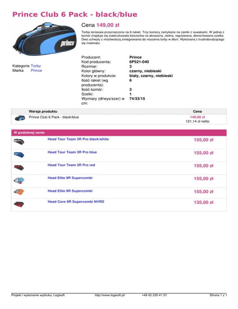 Prince Club 6 Pack - black/blue Cena 149,00 zł Torba tenisowa przeznaczona na 6 rakiet. Trzy komory zamykane na zamki z suwakami. W jednej z komór znajduje się siateczkowata kieszonka na akcesoria. Jedna, regulowana, demontowana szelka. Dwa uchwyty z możliwością zintegrowania do noszenia torby w dłoni. Wykonana z trudnobrudzącego się materiału. Producent: Kod producenta: Rozmiar: Kolor główny: Kolory w produkcie: Ilość rakiet (wg producenta): Ilość komór: Szelki: Wymiary (dł/wys/szer) w cm: Kategorie Torby Marka Prince Prince 6P521-040 3 czarny, niebieski biały, czarny, niebieski 6 3 1 74/33/15 Wersja produktu Cena Prince Club 6 Pack - black/blue 149,00 zł 121,14 zł netto W podobnej cenie Head Tour Team 3R Pro black/white 155,00 zł Head Tour Team 3R Pro blue 155,00 zł Head Tour Team 3R Pro red 155,00 zł Head Elite 9R Supercombi 155,00 zł Head Elite 9R Supercombi 155,00 zł Head Core 9R Supercombi NVRD 135,00 zł Projekt i wykonanie wydruku: Logisoft Powered by TCPDF (www.tcpdf.org) http://www.logisoft.pl/ +48 42 235 41 51 Strona 1 z 1
