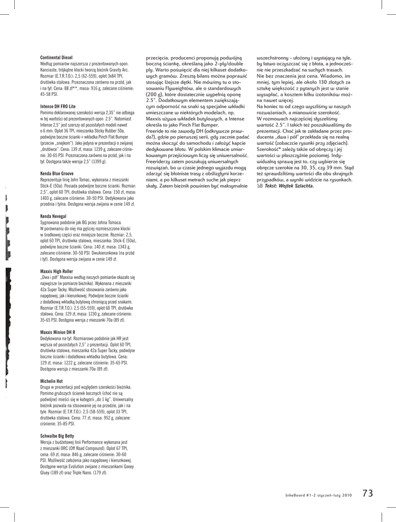Continental Diesel Według pomiarów najszersza z prezentowanych opon. Kanciaste, trójkątne klocki tworzą bieżnik Gravity Arc. Rozmiar (E.T.R.T.O.): 2,5 (62-559), oplot 3x84 TPI, drutówka stalowa. Przeznaczona zarówno na przód, jak i na tył. Cena: 88 zł**, masa: 916 g, zalecane ciśnienie: 45-58 PSI. Intense DH FRO Lite Pomimo deklarowanej szerokości wersja 2,35” nie odbiega w tej wartości od prezentowanych opon 2.5”. Natomiast Intense 2,5” jest szerszy od pozostałych modeli nawet o 6 mm. Oplot 36 TPI, mieszanka Sticky Rubber 50a, podwójne boczne ścianki+wkładka Pinch Flat Bumper (przeciw „snejkom”). Jako jedyna w prezentacji o zwijanej „drutówce”. Cena: 139 zł, masa: 1239 g, zalecane ciśnienie: 30-65 PSI. Przeznaczona zarówno na przód, jak i na tył. Dostępna także wersja 2,5” (1399 g). Kenda Blue Groove Reprezentuje linię John Tomac, wykonana z mieszanki Stick-E (50a). Posiada podwójne boczne ścianki. Rozmiar: 2,5”, oplot 60 TPI, drutówka stalowa. Cena: 150 zł, masa: 1403 g, zalecane ciśnienie: 30-50 PSI. Dedykowana jako przednia i tylna. Dostępna wersja zwijana w cenie 149 zł. przecięcia, producenci proponują podwójną boczną ściankę, określaną jako 2-ply/double ply. Warto poświęcić dla niej kilkaset dodatkowych gramów. Zresztą bilans można poprawić stosując lżejsze dętki. Nie mówimy tu o stosowaniu Flyweightów, ale o standardowych (200 g), które dostatecznie wypełnią oponę 2.5”. Dodatkowym elementem zwiększającym odporność na snaki są specjalne wkładki umieszczane w niektórych modelach, np. Maxxis używa wkładek butylowych, a Intense określa to jako Pinch Flat Bumper. Freeride to nie zawody DH (odkrywcze prawda?), gdzie po pierwszej serii, gdy zacznie padać można skoczyć do samochodu i założyć kapcie dedykowane błotu. W polskim klimacie umiarkowanym przejściowym liczy się uniwersalność. Freeriderzy zatem poszukują uniwersalnych rozwiązań, bo w czasie jednego wyjazdu mogą zdarzyć się błotniste trasy z obślizgłymi korzeniami, a po kilkuset metrach suche jak pieprz skały. Zatem bieżnik powinien być maksymalnie wszechstronny - ułożony i wystający na tyle, by łatwo oczyszczać się z błota, a jednocześnie nie przeszkadzać na suchych trasach. Nie bez znaczenia jest cena. Wiadomo, im mniej, tym lepiej, ale około 130 złotych za sztukę większość z pytanych jest w stanie wysupłać, a kosztem kilku izotoników można nawet więcej. Na koniec to od czego wyszliśmy w naszych rozważaniach, a mianowicie szerokość. W rozmowach najczęściej słyszeliśmy wartość 2.5”. I takich też poszukiwaliśmy do prezentacji. Choć jak te zakładane przez producenta „dwa i pół” przekłada się na realną wartość (zobaczcie rysunki przy zdjęciach). Szerokość* zależy także od obręczy i jej wartości w płaszczyźnie poziomej. Indywidualną sprawą jest to, czy wybierze się obręcze szerokie na 30, 35, czy 39 mm. Stąd też sprawdziliśmy wartości dla obu skrajnych przypadków, a wyniki widzicie na rysunkach. Tekst: Wojtek Szlachta. Kenda Nevegal Sygnowana podobnie jak BG przez Johna Tomaca. W porównaniu do niej ma gęściej rozmieszczone klocki w środkowej części oraz mniejsze boczne. Rozmiar: 2,5, oplot 60 TPI, drutówka stalowa, mieszanka: Stick-E (50a), podwójne boczne ścianki. Cena: 140 zł, masa: 1343 g, zalecane ciśnienie: 30-50 PSI. Dwukierunkowa (na przód i tył). Dostępna wersja zwijana w cenie 149 zł. Maxxis High Roller „Dwa i pół” Maxxisa według naszych pomiarów okazało się najwęższe (w pomiarze bieżnika). Wykonana z mieszanki 42a Super Tacky. Możliwość stosowania zarówno jako napędowej, jak i kierunkowej. Podwójne boczne ścianki z dodatkową wkładką butylową chroniącą przed snakami. Rozmiar (E.T.R.T.O.): 2,5 (55-559), oplot 60 TPI, drutówka stalowa. Cena: 129 zł, masa: 1230 g, zalecane ciśnienie: 35-65 PSI. Dostępna wersja z mieszanki 70a (89 zł). Maxxis Minion DH R Dedykowana na tył. Rozmiarowo podobnie jak HR jest węższa od pozostałych 2,5” z prezentacji. Oplot 60 TPI, drutówka stalowa, mieszanka 42a Super Tacky, podwójne boczne ścianki i dodatkowa wkładka butylowa. Cena: 129 zł, masa: 1222 g, zalecane ciśnienie: 35-65 PSI. Dostępna wersja z mieszanki 70a (89 zł). Michelin Hot Druga w prezentacji pod względem szerokości bieżnika. Pomimo grubszych ścianek bocznych (choć nie są podwójne) mieści się w kategorii „do 1 kg”. Uniwersalny bieżnik pozwala na stosowanie jej na przedzie, jak i na tyle. Rozmiar (E.T.R.T.O.): 2,5 (58-559), oplot 33 TPI, drutówka stalowa. Cena: 77 zł, masa: 952 g, zalecane ciśnienie: 35-85 PSI. Schwalbe Big Betty Wersja z budżetowej linii Performance wykonana jest z mieszanki ORC (Off Road Compound). Oplot 67 TPI, cena: 69 zł, masa: 846 g, zalecane ciśnienie: 30-60 PSI. Możliwość założenia jako napędowej i kierunkowej. Dostępne wersje Evolution zwijane z mieszankami Gooey Gluey (189 zł) oraz Triple Nano. (179 zł). b i ke B o a r d # 1-2 st y c z e ń - l u t y 2 010 73