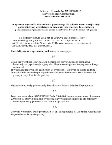 Uchwały Nr XXIII/99/2016 Rady Miejskiej Koprzywnica z dnia 28 kwietnia 2016 r. Projekt - w sprawie wysokości ekwiwalentu pieniężnego dla członka ochotniczej straży pożarnej, który uczestniczył w działaniu ratowniczym lub szkoleniu pożarniczym organizowanym przez Państwową Straż Pożarną lub gminę Na podstawie art.18 ust.2 pkt 15 ustawy z dnia 8 marca 1990r. o samorządzie gminnym ( Dz.U z 2015 r. poz. 1515 z póżn. zm.) i art.28 ust.1 ustawy z dnia 24 sierpnia 1991r. o ochronie przeciwpożarowej (Dz.U. z 2016 r. poz. 191 z pózn. zm.). Rada Miejska w Koprzywnicy uchwala , co następuje: § 1. Ustala się wysokość ekwiwalentu pieniężnego przysługującego członkowi ochotniczej straży pożarnej mającej siedzibę na terenie gminy Koprzywnica, który uczestniczył : 1) w działaniu ratowniczo-gaśniczym w wysokości 10 złotych za każdą godzinę ; 2) w szkoleniu pożarniczym organizowanym przez Państwową Straż Pożarną lub gminę 6 złotych za każdą godzinę. § 2. Wykonanie uchwały powierza się Burmistrzowi Miasta i Gminy Koprzywnica. § 3. Traci moc uchwała nr XXVI/127/08 Rady Miejskiej Koprzywnica z dnia 11 grudnia 2008 roku w sprawie ustalenia wysokości ekwiwalentu pieniężnego dla członków ochotniczych straży pożarnych w Gminie Koprzywnica. § 4. Uchwała wchodzi w życie po upływie 14 dni od ogłoszenia w Dzienniku Urzędowym Województwa Świętokrzyskiego. Uzasadnienie Art.28 ust.1 ustawy z dnia 24 sierpnia 1991 r. o ochronie przeciwpożarowej (Dz.U. z 2016 r. poz. 191 z póżn.zm.) upoważnia Radę Gminy do ustalenia wysokości ekwiwalentu pieniężnego dla członka ochotniczej straży pożarnej, który uczestniczy w działaniu ratowniczo-gaśniczym lub szkoleniu pożarniczym organizowanym przez Państwową Straż Pożarną lub gminę. Wysokość ekwiwalentu nie może przekraczać, zgodnie z art.28 ust. 2 w/w ustawy 1/175 przeciętnego wynagrodzenia ogłoszonego przez Prezesa Głównego Urzędu Statystycznego w Dzienniku Urzędowym Rzeczpospolitej Polski "Monitor Polski" na podstawie art.20 pkt 2 ustawy z dnia 17 grudnia 1998 r. o emeryturach i rentach z Funduszu Ubezpieczeń Społecznych ( Dz.U z 2015 r. poz. 748 z póżn. zm.) przed dniem ustalenia ekwiwalentu, za każdą godzinę udziału w działaniu ratowniczym lub szkoleniu pożarniczym. Przeciętne wynagrodzenie w czwartym kwartale 2015 roku wynosiło 4066,95 zł - komunikat Prezesa Głównego Urzędu Statystycznego z dnia 9 lutego 2016 r. w sprawie przeciętnego wynagrodzenia w czwartym kwartale 2015 r (M.P. z 2016 r. poz.148) W związku z powyższym wysokość ekwiwalentu nie może przekroczyć kwoty 23,23 zł ( 4066,96/175 ). Biorąc pod uwagę zagrożenie życia i zdrowia uczestnika działania ratowniczego zasadnym jest zróżnicowanie wysokości wypłaconego ekwiwalentu za udział w działaniu ratowniczym i za udział w szkoleniu pożarniczym. Mając na celu uporządkowanie spraw związanych z wypłatą ekwiwalentu dla strażaków ochotników uczestniczących w akcjach ratowniczych i szkoleniach podjęcie uchwały jest uzasadnione.