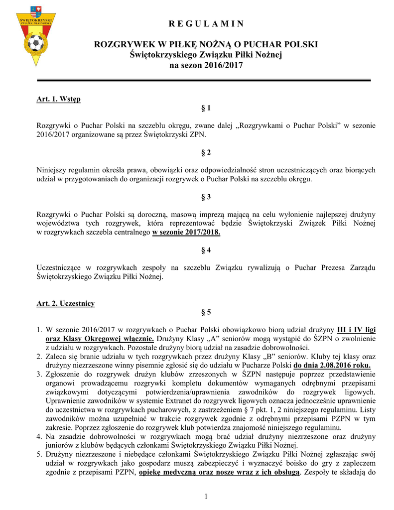 REGULAMIN ROZGRYWEK W PIŁKĘ NOŻNĄ O PUCHAR POLSKI Świętokrzyskiego Związku Piłki Nożnej na sezon 2016/2017 Art. 1. Wstęp §1 Rozgrywki o Puchar Polski na szczeblu okręgu, zwane dalej „Rozgrywkami o Puchar Polski” w sezonie 2016/2017 organizowane są przez Świętokrzyski ZPN. §2 Niniejszy regulamin określa prawa, obowiązki oraz odpowiedzialność stron uczestniczących oraz biorących udział w przygotowaniach do organizacji rozgrywek o Puchar Polski na szczeblu okręgu. §3 Rozgrywki o Puchar Polski są doroczną, masową imprezą mającą na celu wyłonienie najlepszej drużyny województwa tych rozgrywek, która reprezentować będzie Świętokrzyski Związek Piłki Nożnej w rozgrywkach szczebla centralnego w sezonie 2017/2018. §4 Uczestniczące w rozgrywkach zespoły na szczeblu Związku rywalizują o Puchar Prezesa Zarządu Świętokrzyskiego Związku Piłki Nożnej. Art. 2. Uczestnicy §5 1. W sezonie 2016/2017 w rozgrywkach o Puchar Polski obowiązkowo biorą udział drużyny III i IV ligi oraz Klasy Okręgowej włącznie. Drużyny Klasy „A” seniorów mogą wystąpić do ŚZPN o zwolnienie z udziału w rozgrywkach. Pozostałe drużyny biorą udział na zasadzie dobrowolności. 2. Zaleca się branie udziału w tych rozgrywkach przez drużyny Klasy „B” seniorów. Kluby tej klasy oraz drużyny niezrzeszone winny pisemnie zgłosić się do udziału w Pucharze Polski do dnia 2.08.2016 roku. 3. Zgłoszenie do rozgrywek drużyn klubów zrzeszonych w ŚZPN następuje poprzez przedstawienie organowi prowadzącemu rozgrywki kompletu dokumentów wymaganych odrębnymi przepisami związkowymi dotyczącymi potwierdzenia/uprawnienia zawodników do rozgrywek ligowych. Uprawnienie zawodników w systemie Extranet do rozgrywek ligowych oznacza jednocześnie uprawnienie do uczestnictwa w rozgrywkach pucharowych, z zastrzeżeniem § 7 pkt. 1, 2 niniejszego regulaminu. Listy zawodników można uzupełniać w trakcie rozgrywek zgodnie z odrębnymi przepisami PZPN w tym zakresie. Poprzez zgłoszenie do rozgrywek klub potwierdza znajomość niniejszego regulaminu. 4. Na zasadzie dobrowolności w rozgrywkach mogą brać udział drużyny niezrzeszone oraz drużyny juniorów z klubów będących członkami Świętokrzyskiego Związku Piłki Nożnej. 5. Drużyny niezrzeszone i niebędące członkami Świętokrzyskiego Związku Piłki Nożnej zgłaszając swój udział w rozgrywkach jako gospodarz muszą zabezpieczyć i wyznaczyć boisko do gry z zapleczem zgodnie z przepisami PZPN, opiekę medyczną oraz nosze wraz z ich obsługą. Zespoły te składają do 1 potwierdzenia przez Świętokrzyski ZPN zbiorczą listę zawodników podpisaną przez lekarza, która stanowi dokument dopuszczenia do rozgrywek Pucharu Polski. 6. Drużyny niezrzeszone, niebędące członkami Świętokrzyskiego Związku Piłki Nożnej, przy zgłoszeniu do rozgrywek wpłacają startowe w wysokości 250 zł do dnia 16 sierpnia 2016 roku. Brak opłaty skutkuje wycofaniem zespołu z rozgrywek Pucharu Polski na szczeblu Świętokrzyskiego ZPN. 7. W rozgrywkach Pucharu Polski na szczeblu Świętokrzyskiego ZPN może być potwierdzona i uprawniona do gry dowolna liczba zawodników – cudzoziemców spoza obszaru Unii Europejskiej, przy czym w każdym meczu może występować równocześnie na boisku 1 zawodnik danego klubu – cudzoziemiec spoza obszaru Unii Europejskiej, z uwzględnieniem postanowień Uchwały nr XI/300 z dnia 22 listopada 2013 roku Zarządu PZPN w sprawie określenia liczby zawodników cudzoziemców spoza obszaru Unii Europejskiej występujących w meczach Ekstraklasy i niższych klas rozgrywkowych. 8. Decyzją Zarządu Świętokrzyskiego ZPN w Kielcach w rozgrywkach Pucharu Polski na szczeblu okręgu w sezonie 2016/2017 nie mogą uczestniczyć czynni sędziowie. Art. 3. System rozgrywek §6 1. Zawody przeprowadzone zostaną systemem pucharowym, tzn., że drużyna przegrywająca odpada. 2. Podstawą kwalifikacji drużyny o włączenie do udziału w rozgrywkach pucharowych jest aktualnie reprezentowana klasa lub liga rozgrywkowa na danym etapie rozgrywkowym lub zwycięstwo z poprzedniej rundy. 3. Zwycięzca rozgrywek Pucharu Polski na szczeblu wojewódzkim musi być wyłoniony w terminie do dnia 30 czerwca 2017 roku. §7 Wystawienie przez klub do rozgrywek więcej niż jednej drużyny, zobowiązuje do stosowania następujących zasad: 1. Zawodnicy, którzy brali udział w meczu jednej drużyny, nie mogą brać udziału w meczu innej drużyny tego samego klubu w następnym terminie, jeżeli obie drużyny awansowały do dalszych rozgrywek. 2. Jeżeli jedna drużyna tego samego klubu, została wyeliminowana z rozgrywek, wówczas maksymalnie 3 (trzech) zawodników drużyny wyeliminowanej, może grać w innej drużynie swego klubu, który zakwalifikował się do dalszych rozgrywek. 3. Oznaczenie drużyny tego samego klubu ustala się na podstawie klas rozgrywkowych, w których one aktualnie występują – I drużynę reprezentuje zespół występujący w najwyższej klasie rozgrywkowej. Ostateczną decyzję, co do oznaczenia ww. drużyn podejmuje Wydział Gier na podstawie potwierdzonych i uprawnionych zawodników w danych zespołach. 4. W drużynach niezrzeszonych mogą występować jedynie zawodnicy niebędący członkami jakiegokolwiek klubu – nie zostali zgłoszeni do rozgrywek prowadzonych przez PZPN, ŚZPN lub inny ZPN na sezon 2016/2017. Podstawą do udziału w rozgrywkach jest złożona i potwierdzona przez Wydział Gier imienna lista zawodników na określony sezon rozgrywkowy. §8 1. Losowanie pierwszego etapu rozgrywek dokona Wydział Gier ŚZPN w Kielcach. Zestawienie par Pucharu zostanie opublikowane w odrębnym komunikacie oraz na stronie internetowej ŚZPN Kielce. 2. Drużyny niezrzeszone w Świętokrzyskim Związku Piłki Nożnej są traktowane jak drużyna najniższej klasy rozgrywkowej. 3. Gospodarzami meczów są drużyny występujące w niższych klasach rozgrywkowych w sezonie 20