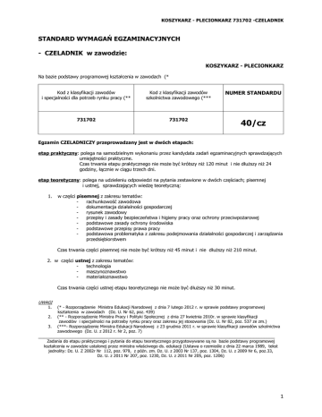 KOSZYKARZ - PLECIONKARZ 731702 -CZELADNIK STANDARD WYMAGAŃ EGZAMINACYJNYCH - CZELADNIK w zawodzie: KOSZYKARZ - PLECIONKARZ Na bazie podstawy programowej kształcenia w zawodach (* Kod z klasyfikacji zawodów i specjalności dla potrzeb rynku pracy (** Kod z klasyfikacji zawodów szkolnictwa zawodowego (*** NUMER STANDARDU 731702 731702 40/cz Egzamin CZELADNICZY przeprowadzany jest w dwóch etapach: etap praktyczny: polega na samodzielnym wykonaniu przez kandydata zadań egzaminacyjnych sprawdzających umiejętności praktyczne. Czas trwania etapu praktycznego nie może być krótszy niż 120 minut i nie dłuższy niż 24 godziny, łącznie w ciągu trzech dni. etap teoretyczny: polega na udzieleniu odpowiedzi na pytania zestawione w dwóch częściach; pisemnej i ustnej, sprawdzających wiedzę teoretyczną: 1. w części pisemnej z zakresu tematów: rachunkowość zawodowa dokumentacja działalności gospodarczej rysunek zawodowy przepisy i zasady bezpieczeństwa i higieny pracy oraz ochrony przeciwpożarowej podstawowe zasady ochrony środowiska podstawowe przepisy prawa pracy podstawowa problematyka z zakresu podejmowania działalności gospodarczej i zarządzania przedsiębiorstwem Czas trwania części pisemnej nie może być krótszy niż 45 minut i nie dłuższy niż 210 minut. 2. w części ustnej z zakresu tematów: technologia maszynoznawstwo materiałoznawstwo Czas trwania części ustnej etapu teoretycznego nie może być dłuższy niż 30 minut. UWAGI 1. 2. 3. (* - Rozporządzenie Ministra Edukacji Narodowej z dnia 7 lutego 2012 r. w sprawie podstawy programowej kształcenia w zawodach (Dz. U. Nr 62, poz. 439) (** - Rozporządzenie Ministra Pracy i Polityki Społecznej z dnia 27 kwietnia 2010r. w sprawie klasyfikacji zawodów i specjalności na potrzeby rynku pracy oraz zakresu jej stosowania (Dz. U. Nr 82, poz. 537 ze zm.) (***- Rozporządzenie Ministra Edukacji Narodowej z 23 grudnia 2011 r. w sprawie klasyfikacji zawodów szkolnictwa zawodowego (Dz. U. z 2012 r. Nr 2, poz. 7) _________________________________________________________________________________________ Zadania do etapu praktycznego i pytania do etapu teoretycznego przygotowywane są na bazie podstawy programowej kształcenia w zawodzie ustalonej przez ministra właściwego ds. edukacji (Ustawa o rzemiośle z dnia 22 marca 1989, tekst jednolity: Dz. U. Z 2002r Nr 112, poz. 979, z późn. zm. Dz. U. z 2003 Nr 137, poz. 1304, Dz. U. z 2009 Nr 6, poz.33, Dz. U. z 2011 Nr 207, poz. 1230, Dz. U. z 2011 Nr 205, poz. 1206) 1 KOSZYKARZ - PLECIONKARZ 731702 -CZELADNIK W efekcie pozytywnie zdanego egzaminu CZELADNICZEGO izba rzemieślnicza wystawia ŚWIADECTWO CZELADNICZE, które jest formalnym potwierdzeniem kwalifikacji zawodowych, uzyskanych w różnych ścieżkach edukacji oraz w procesie pracy. 1. PROFIL UMIEJĘTNOŚCI CZELADNIKA ZWIĄZANY Z ZAWODEM Czeladnik (posiadacz świadectwa czeladniczego) w zawodzie koszykarz-plecionkarz potrafi: posługiwać się dokumentacją techniczną wyrobów koszykarsko-plecionkarskich, dobierać materiały i technologie stosowane w procesach wytwarzania wyrobów, prowadzić uprawę i pielęgnację wikliny, określać ilość i jakość materiałów do wykonania określonego wyrobu, przetwarzać i uszlachetniać wiklinę oraz inne materiały stosowane w koszykarstwie-plecionkarstwie, posługiwać się narzędziami i przyrządami pomiarowymi, użytkować i konserwować maszyny i urządzenia, określać koszty produkcji wyrobów, wykonywać wyroby z zastosowaniem różnych konstrukcji i splotów plecionkarskich, stosować techniki wykończania i uszlachetniania wyrobów, dokonywać napraw i renowacji wyrobów koszykarsko-plecionkarskich, oceniać jakość wykonywanych prac oraz wyrobów gotowych, pakować, magazynować i transportować wyroby, przestrzegać przepisów bezpieczeństwa i higieny pracy, ochrony przeciwpożarowej oraz ochrony środowiska podczas wykonywania zadań zawodowych, udzielać pierwszej pomocy poszkodowanym w wypadkach przy pracy. Czeladnik w zawodzie koszykarz-plecionkarz jest przygotowany do wykonywania następujących zadań zawodowych: 1) przygotowywania surowców i materiałów do wykonania wyrobów koszykarskich i plecionkarskich; 2) organizowania prac związanych z wykonywaniem wyrobów koszykarskich i plecionkarskich; 3) wykonywania i wykańczania wyrobów z wikliny i innych materiałów plecionkarskich. 2.WIEDZA I UMIEJĘTNOŚCI ZWIĄZANE Z WYKONYWANIEM WYŻEJ WYMIENIONYCH ZADAŃ ZAWODOWYCH Z ZAKRESU: 2.1. Bezpieczeństwo i higiena pracy Czeladnik: 1) rozróżnia pojęcia związane z bezpieczeństwem i higieną pracy, ochroną przeciwpożarową, ochroną środowiska i ergonomią; 2) rozróżnia zadania i uprawnienia instytucji oraz służb działających w zakresie ochrony pracy i ochrony środowiska w Polsce; 3) określa prawa i obowiązki pracownika oraz pracodawcy w zakresie bezpieczeństwa i higieny pracy; 4) przewiduje zagrożenia dla zdrowia i życia człowieka oraz mienia i środowiska związane z wykonywaniem zadań zawodowych; 5) określa zagrożenia związane z występowaniem szkodliwych czynników w środowisku pracy; 6) określa skutki oddziaływania czynników szkodliwych na organizm człowieka; 7) organizuje stanowisko pracy zgodnie z obowiązującymi wymaganiami ergonomii, przepisami bezpieczeństwa i higieny pracy, ochrony przeciwpożarowej i ochrony środowiska; 8) stosuje środki ochrony indywidualnej i zbiorowej podczas wykonywania zadań zawodowych; 9) przestrzega zasad bezpieczeństwa i higieny pracy oraz stosuje przepisy prawa dotyczące ochrony przeciwpożarowej i ochrony środowiska; 10) udziela pierwszej pomocy poszkodowanym w wypadkach przy pracy oraz w stanach zagrożenia zdrowia i życia. 2.2.Podejmowanie i prowadzenie działalności gospodarczej Czeladnik: 1) stosuje pojęcia z obszaru funkcjonowania gospodarki rynkowej; 2) stosuje przepisy prawa pracy, przepisy prawa dotyczące ochrony danych osobowych oraz przepisy prawa pod