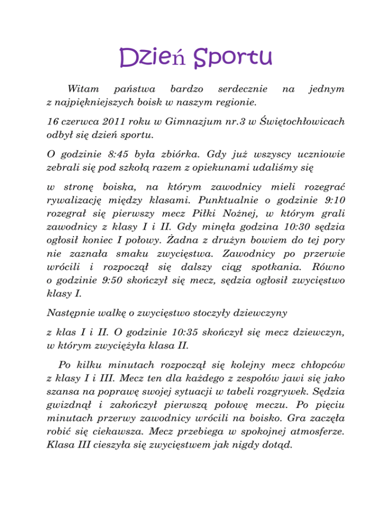 Dzień Sportu Witam państwa bardzo serdecznie z najpiękniejszych boisk w naszym regionie. na jednym 16 czerwca 2011 roku w Gimnazjum nr.3 w Świętochłowicach odbył się dzień sportu. O godzinie 8:45 była zbiórka. Gdy już wszyscy uczniowie zebrali się pod szkołą razem z opiekunami udaliśmy się w stronę boiska, na którym zawodnicy mieli rozegrać rywalizację między klasami. Punktualnie o godzinie 9:10 rozegrał się pierwszy mecz Piłki Nożnej, w którym grali zawodnicy z klasy I i II. Gdy minęła godzina 10:30 sędzia ogłosił koniec I połowy. Żadna z drużyn bowiem do tej pory nie zaznała smaku zwycięstwa. Zawodnicy po przerwie wrócili i rozpoczął się dalszy ciąg spotkania. Równo o godzinie 9:50 skończył się mecz, sędzia ogłosił zwycięstwo klasy I. Następnie walkę o zwycięstwo stoczyły dziewczyny z klas I i II. O godzinie 10:35 skończył się mecz dziewczyn, w którym zwyciężyła klasa II. Po kilku minutach rozpoczął się kolejny mecz chłopców z klasy I i III. Mecz ten dla każdego z zespołów jawi się jako szansa na poprawę swojej sytuacji w tabeli rozgrywek. Sędzia gwizdnął i zakończył pierwszą połowę meczu. Po pięciu minutach przerwy zawodnicy wrócili na boisko. Gra zaczęła robić się ciekawsza. Mecz przebiega w spokojnej atmosferze. Klasa III cieszyła się zwycięstwem jak nigdy dotąd. Następnie spór o zwycięstwo stoczyli zawodnicy z klas II i III. Mecz zaczął się o godzinie 11:30. Wzbudza on olbrzymie emocje zarówno zawodników jak i nas, gorących kibiców każdego z zespołów. Na boisku przed państwem stają obie drużyny. Cóż to za emocje – proszę państwa! W tych ostatnich sekundach przed rozpoczęciem meczu zawodnicy aż drżą ze zniecierpliwienia. I oto gwizdek – sędzia rozpoczął mecz. Mija dziesięć minut spotkania. Sytuacja staje się nieciekawa. Zawodnicy z klasy III przyspieszają. Oto przed nami zawodnicy przystępują do akcji. Jakby dopiero teraz zrozumieli dlaczego tutaj są. Sędzia ogłasza koniec I połowy. Nadeszła godzina 11:50 i rozpoczęła się II połowa meczu. Cóż to za tempo! Jakaż klasa! Zawodnicy klasy III strzelili właśnie siódmą bramkę. Ten mecz dobitnie pokazuje jak ważne jest zwycięstwo klasy III. To niemożliwe!!! Proszę państwa! Mamy ósmą bramkę. Na trybunach szaleństwo. Kibice cieszą się błyskawicznym tempem swoich drużyn. Właśnie usłyszeliśmy gwizdek, oznacza to koniec meczu. Sędzia ogłasza wyniki. Klasa III cieszy się ze zwycięstwa. Uważam, że była to maksymalna dawka adrenaliny. Był to naprawdę ciekawy dzień. Mamy nadzieję, że będziemy mogli oglądać dalsze sukcesy naszego gimnazjum. Drużyny: Klasa I chłopcy: Klasa II chłopcy: 1. Daniel Gondek 2. Krzysztof Hunger 3. Kamil Brygman 4. Daniel Gamon 5. Kamil Gaszi Klasa I Dziewczyny: 1. Dawid Skrabania 2. Mateusz Kurpan 3. Robert Połuch 4. Łukasz Szner 5. Paweł Gambuś Klasa II Dziewczyny: 1. Jola Wilgos 2. Sylwia Kubat 3. Marta Franiak 4. Martyna Rogala 5. Natalia Bryjok 1. Sylwia Kozielska 2. Angelika Biela 3. Adrianna Antończyk 4. Agnieszka Dyga 5. Agnieszka Skrabania Klasa III chłopcy: 1. Denis Krzymyczek 2. Roman Gorczinski 3. Dawid Jeziorowski 4. Dawid Gamon 5. Patryk Kuszel 6. Filip Brandt Wyniki Klasa I chłopcy : Klasa II chłopcy 9:3 Klasa I chłopcy : Klasa III chłopcy 3:7 Klasa II chłopcy : Klasa III chłopcy 2:8 Klasa I dziewczyny : Klasa II dziewczyny 0:1 Klasyfikacja końcowa I miejsce – klasa III II miejsce – klasa I III miejsce – klasa II