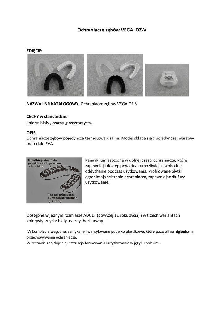 Ochraniacze zębów VEGA OZ-V ZDJĘCIE: NAZWA i NR KATALOGOWY: Ochraniacze zębów VEGA OZ-V CECHY w standardzie: kolory: biały , czarny ,przeźroczysty. OPIS: Ochraniacze zębów pojedyncze termoutwardzalne. Model składa się z pojedynczej warstwy materiału EVA. Kanaliki umieszczone w dolnej części ochraniacza, które zapewniają dostęp powietrza umożliwiają swobodne oddychanie podczas użytkowania. Profilowane płytki ograniczają ścieranie ochraniacza, zapewniając dłuższe użytkowanie. Dostępne w jednym rozmiarze ADULT (powyżej 11 roku życia) i w trzech wariantach kolorystycznych: biały, czarny, bezbarwny. W komplecie wygodne, zamykane i wentylowane pudełko plastikowe, które pozwoli na higieniczne przechowywanie ochraniacza. W zestawie znajduje się instrukcja formowania i użytkowania w języku polskim. LOGO: OPAKOWANIE: WAGA: 0,35g KONSERWACJA: Jak czyścić ochraniacz szczęki: Ochraniacz szczęki należy czyścić po każdym użyciu. a. ochraniacz powinno się delikatnie szorować szczoteczką do zębów, a następnie opłukać pod wodą w temperaturze pokojowej. Nie należy używać tej samej szczoteczki, której używa się do mycia zębów. b. po szorowaniu ochraniacza pozwól mu całkowicie wyschnąć. c. należy regularnie czyścić pudełko, w którym przechowywany jest ochraniacz. Jak dbać o ochraniacz szczęki: a. trzymać go z dala od źródeł ciepłej temperatury. b. przechowywać tylko w wentylowanym pudełku. c. nie żuć ochraniacza podczas użytkowania. INSTRUKCJA: Umieść ochraniacz szczęki w ustach, aby sprawdzić jak najbardziej wygodne dopasowanie. Im więcej powierzchni zębów zakrywa ochraniacz, tym lepsze zabezpieczenie. Ochraniacze zębów przeznaczone dla dzieci i młodzieży, powinny zostać odpowiednio dopasowane do szczęki i należy odciąć nadmiar materiału przed procesem dopasowania. W przypadku dzieci poniżej 10 roku życia potrzebna jest pomoc dorosłych w każdym momencie. Potrzebne będą: 1 garnek z wodą, 1 łyżka cedzakowa, 1 szklanka wody z lodem, 1 lustro, 1 stoper. Procedura postępowania: 1-7: Należy postępować zgodnie z instrukcjami podanymi na rysunkach od 1 do 7. 1. Zagotować wodę 2. Zanurzyć ochraniacz otworem do dołu (12 sek.) 5. Wsysać powietrze i dociskać centralnie (5 sek.) 6. Wsysać powietrze i dociskać krawędzie (55 sek.) -----------------------------------------------3. Schłodzić (20 sek.) 4. Założyć na górne zęby i nagryźć dolnymi 8. Umieść ochraniacz w szczęce i sprawdź czy jest prawidłowo i wygodnie dopasowany. 9. Jeśli ochraniacz nie pasuje, ani nie pozostaje na miejscu, powtórz procedurę postępowania 1 – 7 (kroki 5 i 6 są najistotniejsze). 10. Tylko wtedy, gdy jest to konieczne, ostrożnie użyj nożyczek, aby odciąć małe kawałki odstające od ochraniacza (rys.A). 7.Schłodzić (10 min)