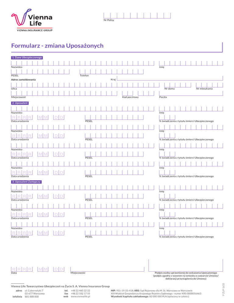 Nr Polisy Formularz - zmiana Uposażonych 1.1.Dane DaneUbezpieczonego Ubezpieczonego Nazwisko Imię Telefon PESEL Kraj Adres zameldowania Ulica Nr domu Miejscowość Kod pocztowy Nr mieszkania Poczta 2. Uposażeni Nazwisko Imię Data urodzenia PESEL Nazwisko % świadczenia z tytułu śmierci Ubezpieczonego Imię Data urodzenia PESEL Nazwisko % świadczenia z tytułu śmierci Ubezpieczonego Imię Data urodzenia PESEL Nazwisko % świadczenia z tytułu śmierci Ubezpieczonego Imię Data urodzenia PESEL % świadczenia z tytułu śmierci Ubezpieczonego 3. Uposażeni Zastępczy Nazwisko Imię Data urodzenia PESEL Nazwisko % świadczenia z tytułu śmierci Ubezpieczonego Imię Data urodzenia PESEL Imię Data urodzenia PESEL Miejscowość Data % świadczenia z tytułu śmierci Ubezpieczonego Podpis osoby uprawnionej do wskazania Uposażonego (podpis zgodny z wzorem na wniosku o zawarcie Umowy/ deklaracji przystąpienia do Umowy) Vienna Life Towarzystwo Ubezpieczeń na Życie S. A. Vienna Insurance Group adres infolinia ul. Cybernetyki 7 02-677 Warszawa 801 888 000 tel. fax web +48 22 460 22 22 +48 22 332 17 55 www.viennalife.pl NIP: 951-19-33-418; KRS: Sąd Rejonowy dla M. St. Warszawy w Warszawie XIII Wydział Gospodarczy Krajowego Rejestru Sądowego - numer KRS 0000056463 Wysokość kapitału zakładowego: 82 000 000 PLN (opłacony w całości) F-ZUP-1610 Nazwisko % świadczenia z tytułu śmierci Ubezpieczonego