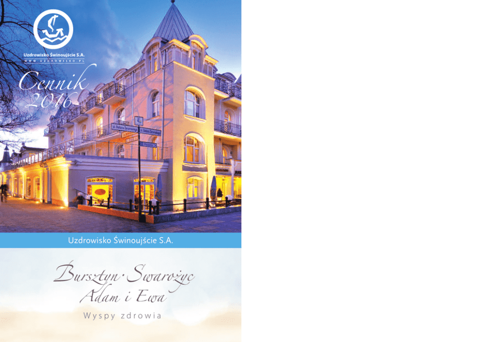 Cennik 2016 Uzdrowisko Świnoujście S.A. Bursztyn·Swarożyc Adam i Ewa Wyspy zdrowia Pobyt z zabiegami pakiet Zdrowie cena od osoby pokój 1-os. pokój 2-os. pokój 3-os. Cennik noclegu apartament ze śniadaniem cena od osoby 01.01.–25.03.16 15.10.–16.12.16 26.03.–10.06.16 03.09.–14.10.16 17.12.–31.12.16 11.06.–02.09.16 sezon A sezon B sezon C pokój 2-os. pokój 1-os. 105 zł 155 zł 205 zł pokój 3-os. pokój 2-os. 85 zł 115 zł 155 zł apartament pokój 3-os. 75 zł 95 zł 125 zł 115 zł 165 zł 215 zł apartament 2-os. 75 zł 95 zł 125 zł studio 1-os. 85 zł 115 zł 155 zł studio 2-os. 75 zł 95 zł 125 zł cena od osoby za dobę dostawka pokój 1-os. cena od osoby pokój 1-os. pokój 2-os. pokój 3-os. apartament W cenę pobytu Wliczony jest: nocleg w komfortowym pokoju, śniadanie w formie bufetu szwedzkiego (w obiekcie Adam i ewa – serwowane). nocleg dla dzieci do lat 4 niekorzystających z osobnego miejsca – bezpłatnie, dzieci od 4 do 12 lat korzystające z osobnego miejsca – zniżka 30%. www.uzdrowisko.pl 01.01.–25.03.16 15.10.–16.12.16 7 noclegów 14 noclegów 21 noclegów 1225 zł 1085 zł 1015 zł 1295 zł 2330 zł 2065 zł 1930 zł 2460 zł 3310 zł 2930 zł 2740 zł 3497 zł 26.03.–10.06.16 03.09.–14.10.16 17.12.–31.12.16 7 noclegów 14 noclegów 21 noclegów 1575 zł 1295 zł 1155 zł 1645 zł 2995 zł 2460 zł 2195 zł 3125 zł 4255 zł 3495 zł 3120 zł 4442 zł 11.06.–02.09.16 7 noclegów 14 noclegów 21 noclegów 1925 zł 1575 zł 1365 zł 1995 zł 3660 zł 2995 zł 2595 zł 3790 zł 5200 zł 4255 zł 3685 zł 5386 zł W cenie pAkietu zdroWie zApeWniAmy: 7, 14, 21 noclegów, całodzienne wyżywienie, (śniadanie + kolacja w formie bufetu szwedzkiego, obiad serwowany); wyżywienie w obiekcie Adam i ewa – serwowane, wstępne badanie lekarskie, opiekę pielęgniarską, 15 zabiegów podczas pobytu 7-dniowego, 30 zabiegów podczas pobytu 14-dniowego, 45 zabiegów przy pobycie 21-dniowym, 1 x sauna, 1 x jacuzzi – tygodniowo, przy pobycie min. 14 nocy. Adam i Ewa Swarożyc Projekt i druk: kamerapress.pl Bursztyn ponADTo oFerUjemy: majówka 2016 niezapomniane morskie Klimaty wakacje rodzinne na wyspie pobyty świąteczne i noworoczne pakiet seniorów pakiet dermatologiczny SpecjAlizUjemy Się w leczeniU Schorzeń: reumatologicznych Kardiologicznych Dermatologicznych endokrynologicznych laryngologicznych pulmonologicznych Uzdrowisko Świnoujście s.A. Biuro Informacji i Rezerwacji 72-600 Świnoujście, ul. e. gierczak 1 tel. +48 91 321 44 52 fax +48 91 327 18 04 [email protected] www.uzdrowisko.pl