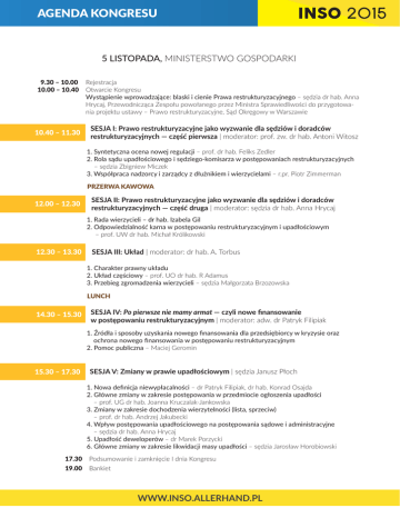 AGENDA KONGRESU INSO 2015 5 LISTOPADA, MINISTERSTWO GOSPODARKI 9.30 – 10.00 10.00 – 10.40 10.40 – 11.30 Rejestracja Otwarcie Kongresu Wystąpienie wprowadzające: blaski i cienie Prawa restrukturyzacyjnego – sędzia dr hab. Anna Hrycaj, Przewodnicząca Zespołu powołanego przez Ministra Sprawiedliwości do przygotowania projektu ustawy – Prawo restrukturyzacyjne, Sąd Okręgowy w Warszawie SESJA I: Prawo restrukturyzacyjne jako wyzwanie dla sędziów i doradców restrukturyzacyjnych — część pierwsza | moderator: prof. zw. dr hab. Antoni Witosz 1. Syntetyczna ocena nowej regulacji – prof. dr hab. Feliks Zedler 2. Rola sądu upadłościowego i sędziego-komisarza w postępowaniach restrukturyzacyjnych – sędzia Zbigniew Miczek 3. Współpraca nadzorcy i zarządcy z dłużnikiem i wierzycielami – r.pr. Piotr Zimmerman PRZERWA KAWOWA 12.00 – 12.30 SESJA II: Prawo restrukturyzacyjne jako wyzwanie dla sędziów i doradców restrukturyzacyjnych — część druga | moderator: sędzia dr hab. Anna Hrycaj 1. Rada wierzycieli – dr hab. Izabela Gil 2. Odpowiedzialność karna w postępowaniu restrukturyzacyjnym i upadłościowym – prof. UW dr hab. Michał Królikowski 12.30 – 13.30 SESJA III: Układ | moderator: dr hab. A. Torbus 1. Charakter prawny układu 2. Układ częściowy – prof. UO dr hab. R Adamus 3. Przebieg zgromadzenia wierzycieli – sędzia Małgorzata Brzozowska LUNCH 14.30 – 15.30 SESJA IV: Po pierwsze nie mamy armat — czyli nowe finansowanie w postępowaniu restrukturyzacyjnym | moderator: adw. dr Patryk Filipiak 1. Źródła i sposoby uzyskania nowego finansowania dla przedsiębiorcy w kryzysie oraz ochrona nowego finansowania w postępowaniu restrukturyzacyjnym 2. Pomoc publiczna – Maciej Geromin 15.30 – 17.30 SESJA V: Zmiany w prawie upadłościowym | sędzia Janusz Płoch 1. Nowa definicja niewypłacalności – dr Patryk Filipiak, dr hab. Konrad Osajda 2. Główne zmiany w zakresie postępowania w przedmiocie ogłoszenia upadłości – prof. UG dr hab. Joanna Kruczalak-Jankowska 3. Zmiany w zakresie dochodzenia wierzytelności (lista, sprzeciw) – prof. dr hab. Andrzej Jakubecki 4. Wpływ postępowania upadłościowego na postępowania sądowe i administracyjne – sędzia dr hab. Anna Hrycaj 5. Upadłość deweloperów – dr Marek Porzycki 6. Główne zmiany w zakresie likwidacji masy upadłości – sędzia Jarosław Horobiowski 17.30 Podsumowanie i zamknięcie I dnia Kongresu 19.00 Bankiet WWW.INSO.ALLERHAND.PL AGENDA KONGRESU INSO 2015 6 LISTOPADA, MINISTERSTWO GOSPODARKI 9.00 – 9.30 9.30 – 10.00 10.00 – 11.20 Rejestracja Rozstrzygnięcie konkursu Call for Papers i wygłoszenie nagrodzonego referatu SESJA I: Upadłość konsumencka — postępowanie bardziej upadłościowe czy oddłużeniowe? | moderator: Maciej Geromin 1. Charakter prawny postępowania upadłościowego konsumenta – Maciej Geromin 2. Podstawy ogłoszenia upadłości konsumenta i postępowanie w przedmiocie ogłoszenia upadłości – sędzia Janusz Płoch, sędzia Marcin Krawczyk 3. Specyfika postępowania upadłościowego konsumenta z punktu widzenia syndyka – syndyk Piotr Wydrzyński 4. Upadłość konsumencka z perspektywy banku – dr Tadeusz Białek PRZERWA KAWOWA 11.50 – 13.30 SESJA II: Plan restrukturyzacyjny i dobre praktyki restrukturyzacji moderator: adw. dr Patryk Filipiak 1. Jak sporządzić plan restrukturyzacyjny (kazus) – syndyk Adam Piasecki 2. Realizacja planu w trakcie postępowania – syndyk Jerzy Sławek 3. Biała księga dobrych praktyk restrukturyzacji – dr Artur Bunk 4. Standstill agreement – dr Lech Giliciński 5. Dobre praktyki restrukturyzacji w praktyce – adw. Bartosz Groele 6. Zasady i cele przeprowadzenia dzialań restrukturyzacyjnych z punktu widzenia instytucji publiczno-bankowej – Volkmar Bruhn-Léon PRZERWA KAWOWA 14.00 – 15.00 SESJA III: Otoczenie restrukturyzacji i sądu restrukturyzacyjnego moderator: adw. Bartosz Groele 1. Analiza stosowania prawa restrukturyzacyjnego nowym wyzwaniem dla nauki – prof. dr. hab. Elżbieta Mączyńska 2. Doskonalenie kadry orzeczniczej wydziałów do spraw restrukturyzacyjnych i upadłościowych – projekty Krajowej Szkoły Sądownictwa i Prokuratury – prof. dr hab. Sylwia Morawska 3. Nowa definicja upadłości – dylematy ekonomisty – prof. dr hab. Dariusz Wędzki 15.10 Podsumowanie obrad i zamknięcie Kongresu – sędzia dr hab. Anna Hrycaj WWW.INSO.ALLERHAND.PL