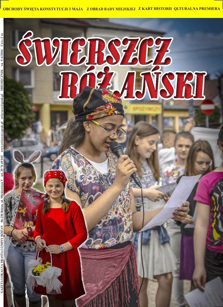 GAZETA LOKALNA MIASTA I GMINY RÓŻAN 06-230 Różan, ul. Mickiewicza 5 tel. 29 76 69 042 www.swierszcz.gouk.pl [email protected] MIESIĘCZNIK nr 5–6/2016 Cena 2 zł OBCHODY ŚWIĘTA KONSTYTUCJI 3 MAJA Z OBRAD RADY MIEJSKIEJ Z KART HISTORII QLTURALNA PREMIERA Burmistrz Piotr Świderski informuje Czynsz za 1 m2 powierzchni użytkowej lokalu przy ul. Szkolnej 8a, wynosi 5,30 zł. W rzeczywistości stawka ta ulega podwyższeniu o 15% z tytułu wyposażenia go w centralne ogrzewanie i o 5% dla mieszkań na I i II piętrze. Jednocześnie zostaje obniżona o 10% z tytułu braku w lokalach gazu przewodowego i centralnej ciepłej wody użytkowej. Kolejna dotacja dla gminy Różan Umowy najmu w nowo budowanym budynku wielorodzinnym przy ul. Szkolnej 8a w Różanie Do dnia 30 maja można było składać wnioski o przydział lokalu w nowo budowanym budynku wielorodzinnym przy ul. Szkolnej 8a. Do rozdysponowania było 20 mieszkań. We wnioskach zainteresowani winni byli wskazać warunki w jakich zamieszkują, wymienić wszystkie osoby, z którymi zamierzają zamieszkiwać oraz wykazać dochody brutto wszystkich osób za okres ostatnich sześciu miesięcy poprzedzających złożenie wniosku i potwierdzić dane o dochodach. Niepełnosprawność wnioskodawcy lub osoby z nim zamieszkującej powinna być potwierdzona orzeczeniem komisji lekarskiej ds. inwalidztwa z określeniem stopnia niepełnosprawności. Wnioski rozpatrywane były zgodnie z zasadami wynajmowania lokali wchodzących w skład mieszkaniowego zasobu gminy Różan, stanowiącymi załącznik do Uchwały nr IX/46/2003 Rady Miejskiej w Różanie z dnia 29 sierpnia 2003 r. i opiniowane przez społeczną komisję powołaną przez burmistrza w składzie: Katarzyna Brzuzy - przewodnicząca Rady Miejskiej, Halina Złotkowska - specjalista pracy socjalnej OPS i Daniel Bodziak - podinspektor ds. dróg i zamówień publicznych Urzędu Gminy. Lista osób zakwalifikowanych do zawarcia umowy najmu na lokal komunalny ukazała się na stronie internetowej rozan.eur. pl i wywieszona na tablicy ogłoszeń w Urzędzie Gminy. Osoba zakwalifikowana do zawarcia umowy najmu zobowiązana będzie uiścić kaucję zabezpieczającą w wysokości dwunastokrotności miesięcznego czynszu za dany lokal, obliczonej według stawki czynszu obowiązującego w dniu zawarcia umowy najmu. W przypadku zawarcia umowy najmu z dotychczasowym najemcą lokalu z mieszkaniowego zasobu gminy Różan, wnioskodawca jest zobowiązany do natychmiastowego, nie później niż w terminie 7 dni, opuszczenia i wydania wcześniej zajmowanego lokalu. 2 Gmina Różan otrzymała dotację na odbiór i utylizację wyrobów zawierających azbest, czyli tzw. eternitu. Pieniądze pochodzą ze środków Wojewódzkiego Funduszu Ochrony Środowiska i Gospodarki Wodnej w Warszawie w kwocie prawie 16,5 tys. zł, co stanowi 85% kosztów całego zadania. Dbamy o ekologię! Burmistrz gminy Różan poszukuje kandydata na trenera piłki nożnej Do podstawowych obowiązków trenera będzie należało: prowadzenie zajęć i treningów dla dzieci i młodzieży w ramach szkółki piłkarskiej (od 2 do 4 godzin w tygodniu), przygotowanie drużyn dziecięcych, młodzieżowych i dorosłych do uczestnictwa w różnorakich rozgrywkach piłkarskich, organizacja zajęć, przygotowanie długoterminowych planów rozwoju (w uzgodnieniu z organizatorem bądź wyznaczonym przez niego pracownikiem), współpraca z rodzicami w zakresie rozwoju i opieki nad podopiecznymi. Wymagania: uprawnienia instruktora piłki nożnej (minimalny warunek konieczny), doświadczenie w pracy z dziećmi i młodzieżą, doświadczenie w pracy z zespołami piłkarskimi, pasja i chęć do pracy. Dokumenty na to stanowisko należy składać na adres urzędu gminy lub dostarczyć osobiście do dnia 25 lipca br. Informacja na www.rozan.eur.pl. Ogłoszony został nabór kandydatów do pracy w Urzędzie Gminy w Różanie na stanowisko - Podinspektor ds. gospodarowania mieniem komunalnym i rolnictwa. Więcej informacji na www. rozan.eur.pl. Dyżury aptek w Różanie od 1 lipca br. Apteka przy ul. Wileńskiej 3, tel. 29 7669020. Godziny otwarcia: pon. - pt.800 - 1700, sob. 800 - 1500, niedziele i święta – nieczynne. Apteka Avena ul. Warszawska 12, tel. 29 7679009 Godziny otwarcia: pon. – pt. 800 - 1530, w sobotę, niedzielę i święta – nieczynne. Apteka przy ul. Gdańskiej 7, tel. 29 7142602. Godziny otwarcia: pon. – pt. 800 - 1900, sob. 800 - 1400, niedziele i święta – nieczynne. W niedziele i święta oraz w porze nocnej przewidziane są dyżury aptek w Makowie Maz. Szczegółowy harmonogram dostępny jest na stronie internetowej Świerszcza Różańskiego. Z dniem 1 lipca br. na stanowisko dyrektora Gminnego Ośrodka Upowszechniania Kultury w Różanie został powołany Sebastian Olszewik. Zaproszenie Burmistrz gminy Różan wraz z Instytutem Badawczym IPC z Wrocławia zapraszają mieszkańców, przedsiębiorców, lokalnych liderów oraz partnerów społecznych na spotkanie konsultacyjne w formule warsztatów służące wyznaczeniu obszarów objętych. Programem Rewitalizacji Gminy Różan. Spotkanie odbędzie się w Gminnym Ośrodku Upowszechniania Kultury w dniu 25 lipca br. o godz. 1300. Celem spotkania jest zebranie uwag, opinii i propozycji odnośnie wyznaczenia obszaru zdegradowanego i obszaru koncentracji działań rewitalizacyjnych w gminie. DNI RÓŻANA W tym roku odbędą się 4,6,7 sierpnia. Oprócz tradycyjnych imprez towarzyszących jak: turnieje, zawody, konkursy, stoiska handlowe, atrakcje dla dzieci, pokazy, wystąpią zespoły: w sobotę 6 - The Last Ride, Roberto Zucaro i Camasutra, a w niedzielę 7 - kabaret Paka, Carol Markovsky i Imperium. Również w dniu 7 sierpnia na stadionie miejskim odbędzie się konkurs sołectw w przeciąganiu liny. Więcej informacji na gouk.pl. Sprzedam działkę rekreacyjną 800m2 zalesioną. Grudunki. 50 metrów od plaży i jeziora. 1 km do Narwi. Bezpośrednio. 52000zł. Kontakt: 6011309